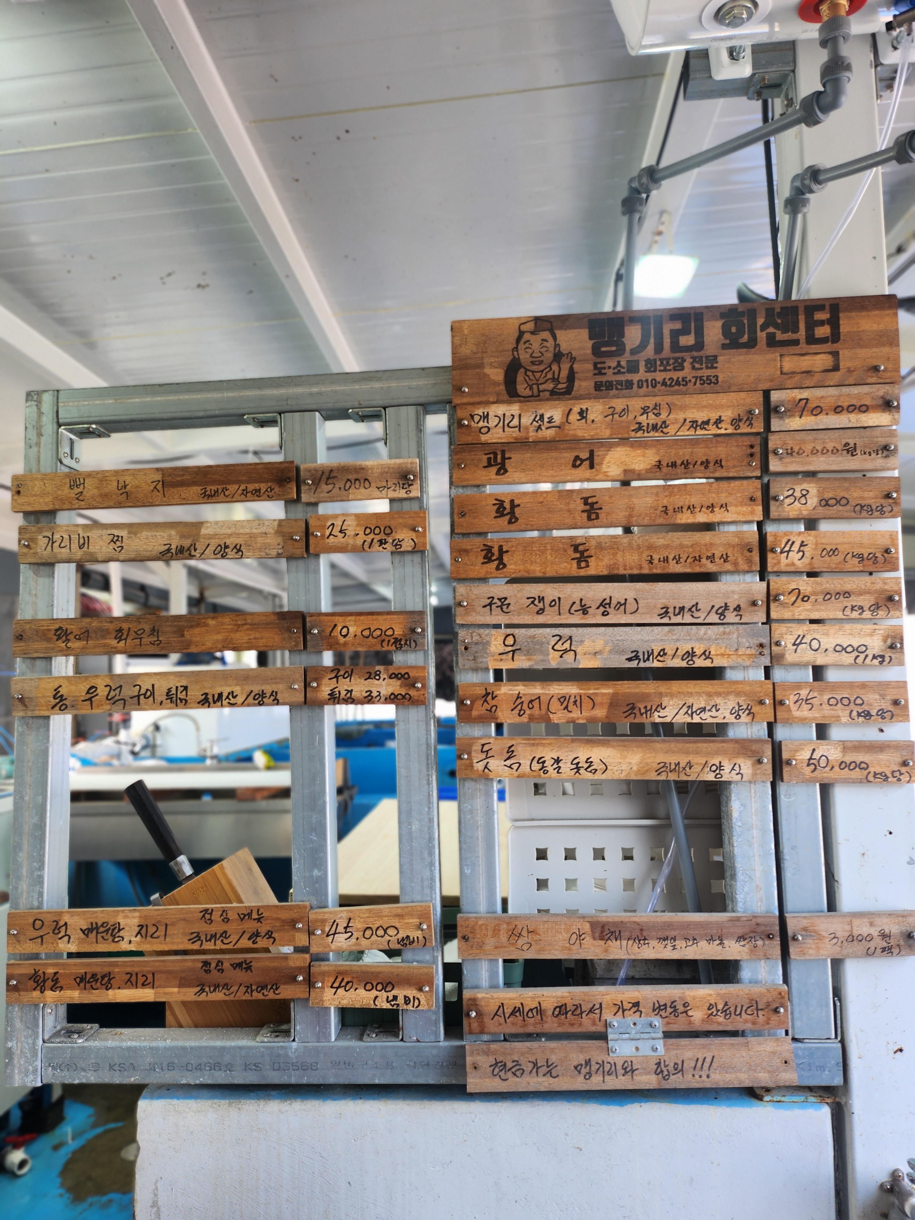 맹기리 수산의 오늘의 메뉴판입니다. 바다 상황에 따라 그날그날 들어오는 생선이 다르기 때문에 메뉴는 언제든 바뀔 수 있고, 정확한 그날의 메뉴는 맹기리 수산의 인스타그램을 참고하면 정확하게 확인할 수 있습니다.