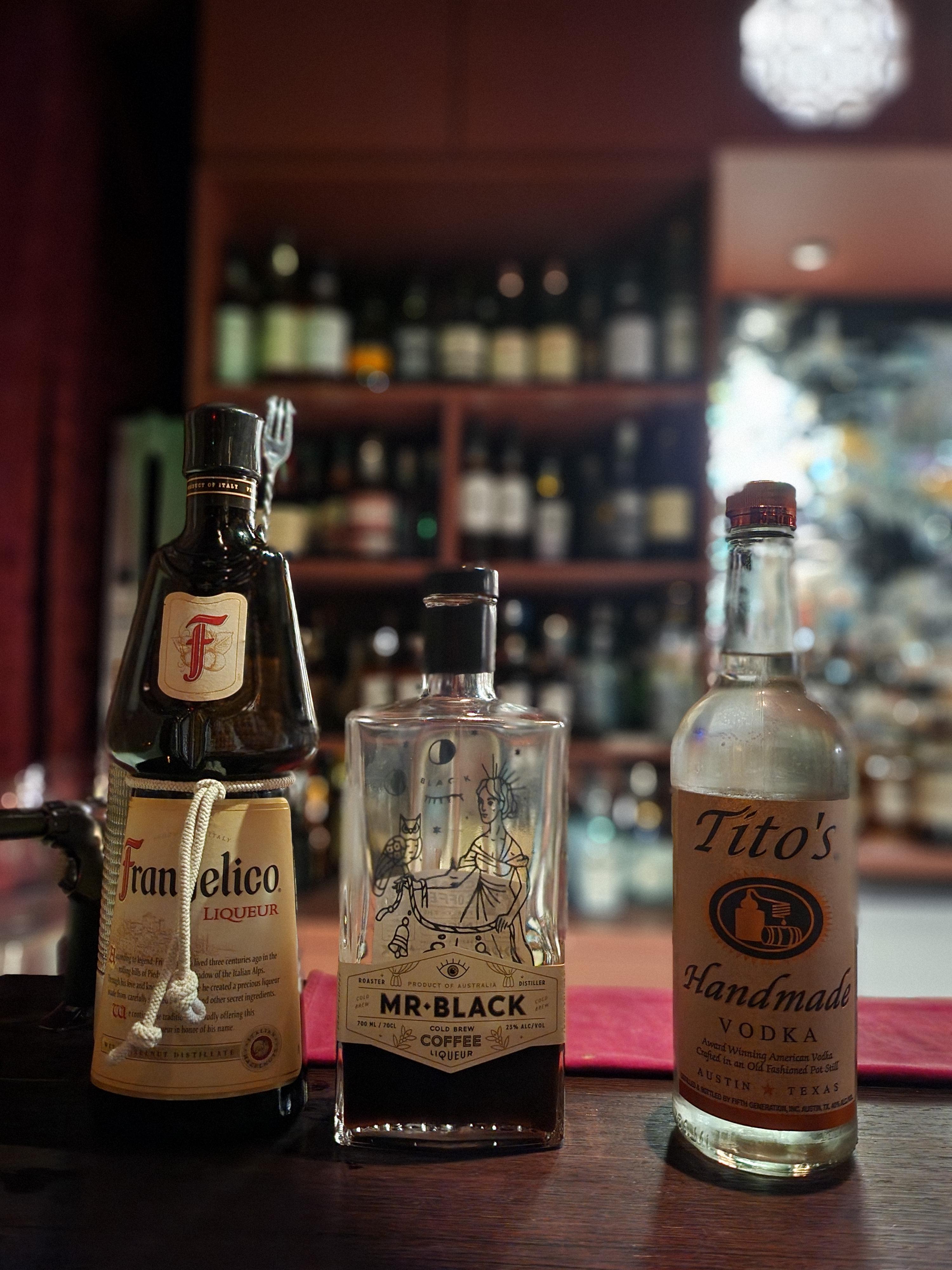 도수가 높고 진하고 다크한 칵테일을 좋아한다고 했더니 바텐더님의 레시피대로 블랙 러시안을 제조해주었다. 프란젤리코 리큐르를 넣어 헤이즐넛 향을 은은하게 낼거라고 미리 칵테일에 들어가는 재료들을 보여주었다. 수도복을 입은 듯한 병모양과 허리 끈이 인상적이었던 리큐어.