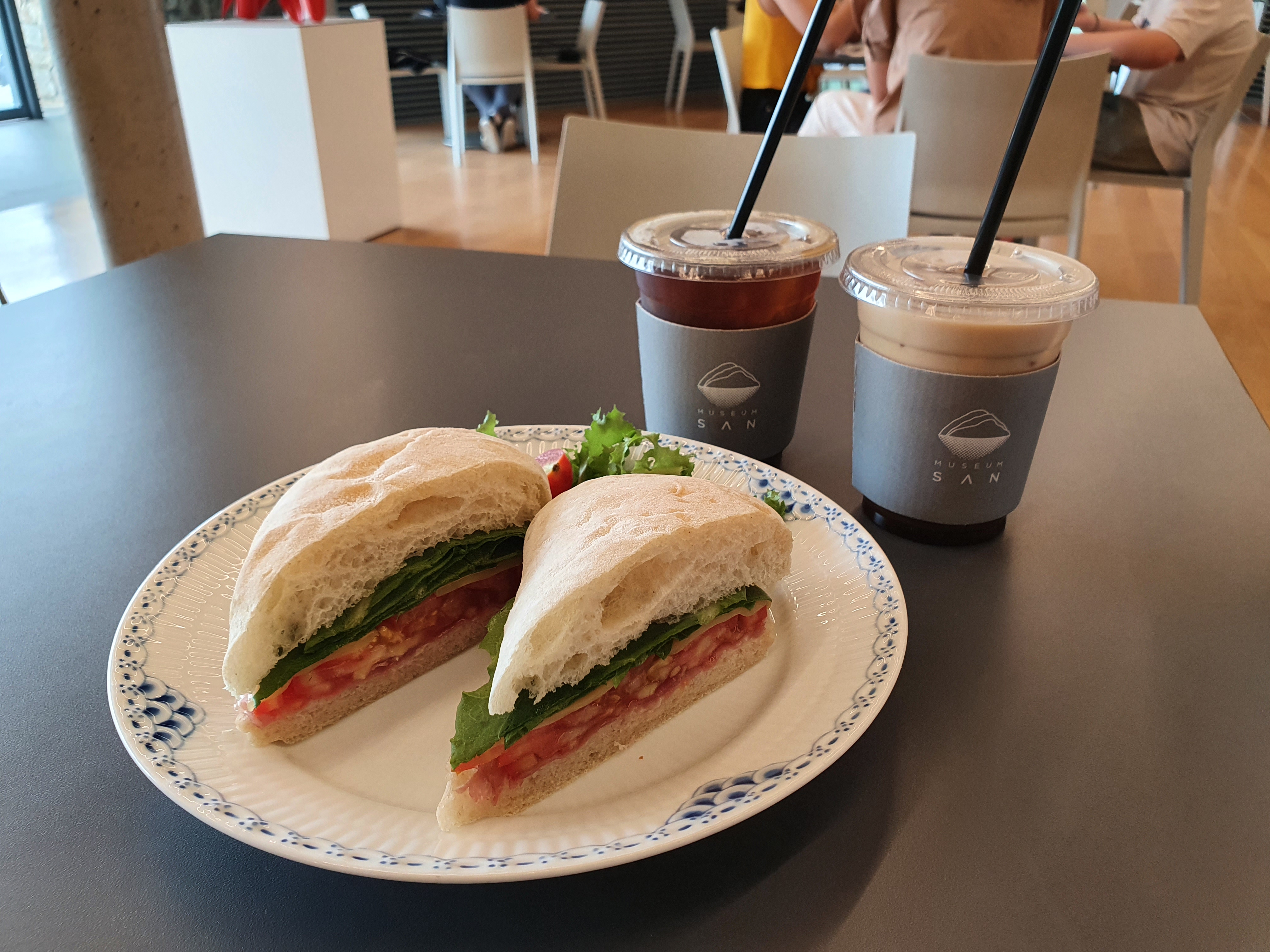 간단한 샌드위치와 케이크등을 판매하며 커피의 가격대는 아메리카노 7,000원 카페 라떼 8,000원 정도로 꽤나 높은 편입니다. 하지만 뮤지엄 산 내부에 맛집이라기에는 이 카페 한 곳 밖에 없기 때문에 다른 선택의 여지가 없습니다.