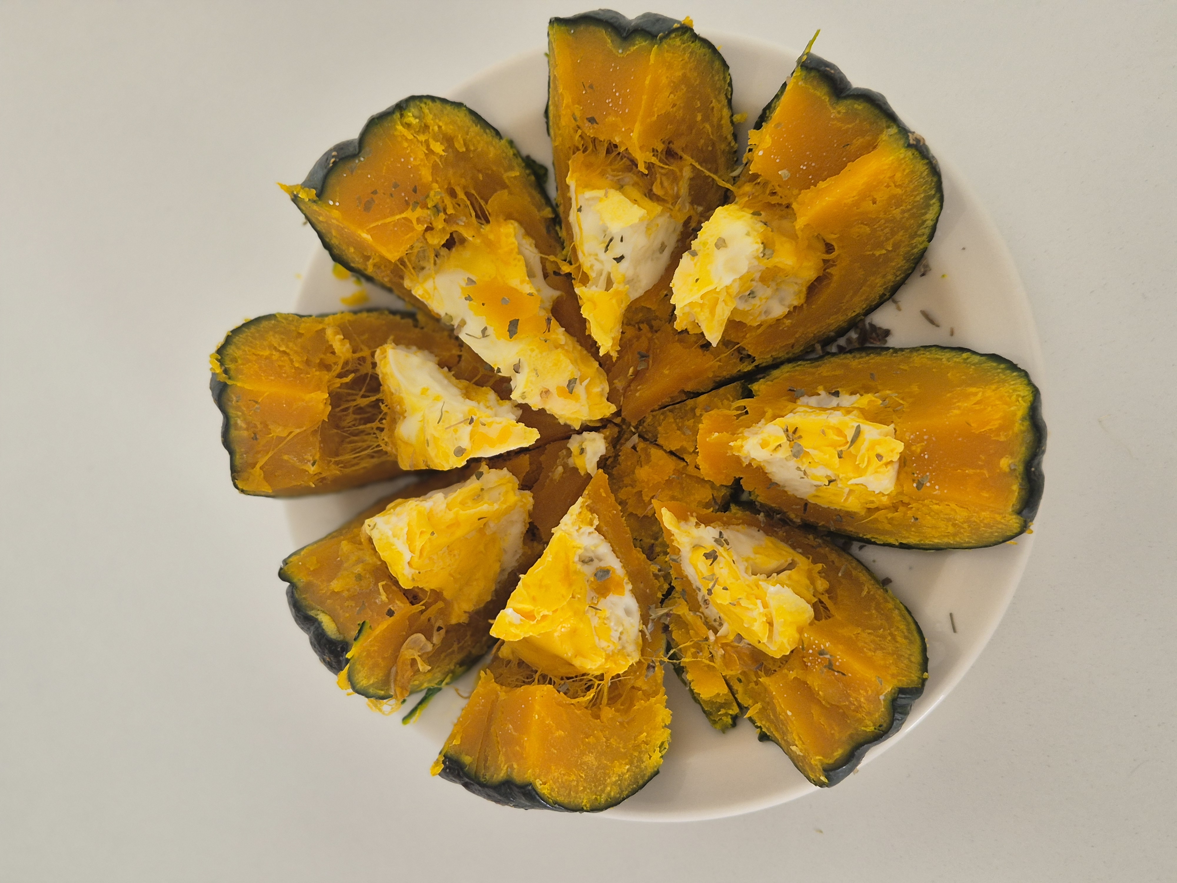 - 만드는 법 : 칼을 이용해 밤호박의 윗 부분을 뚜껑처럼 열어준 후 씨를 파내고, 계란을 넣어 소금 간을 합니다. 그 위에 모짜렐라 치즈를 넘치지 않게 넣어주고 전자렌지에서 5분 30초 조리하면 완성!