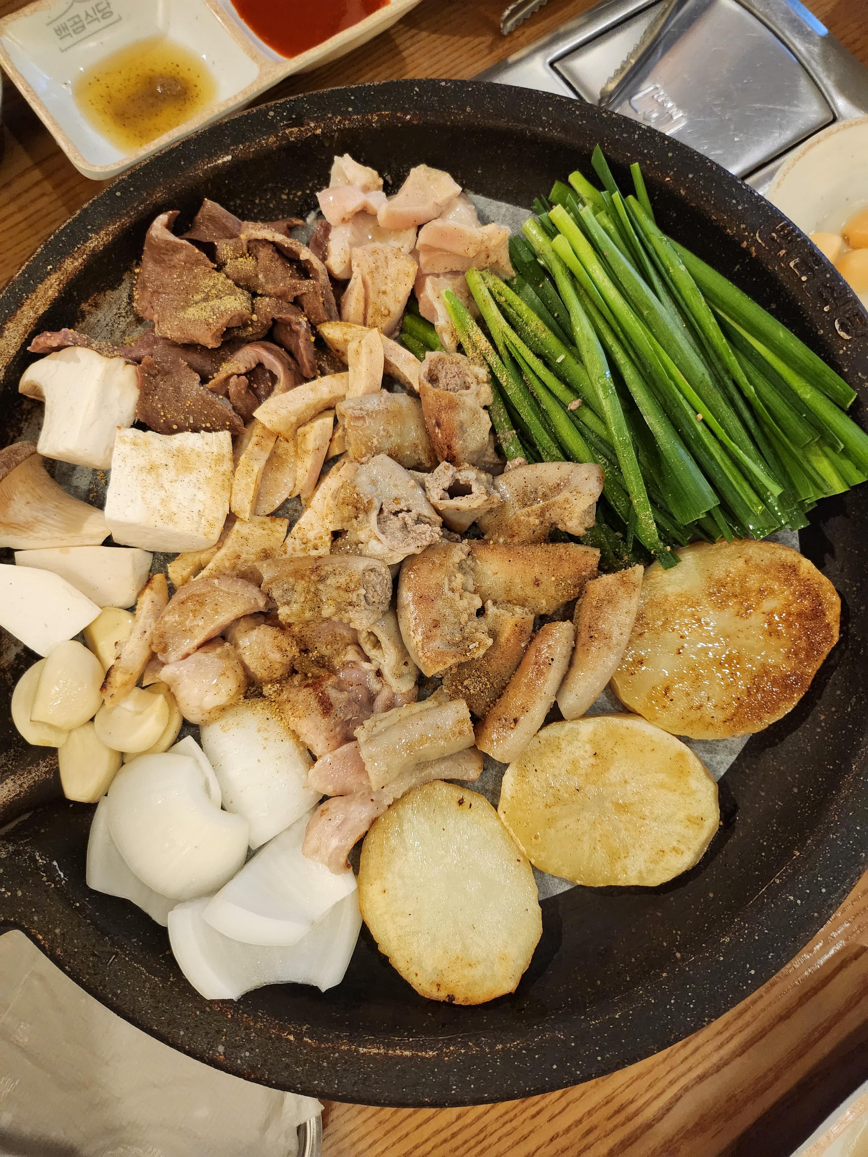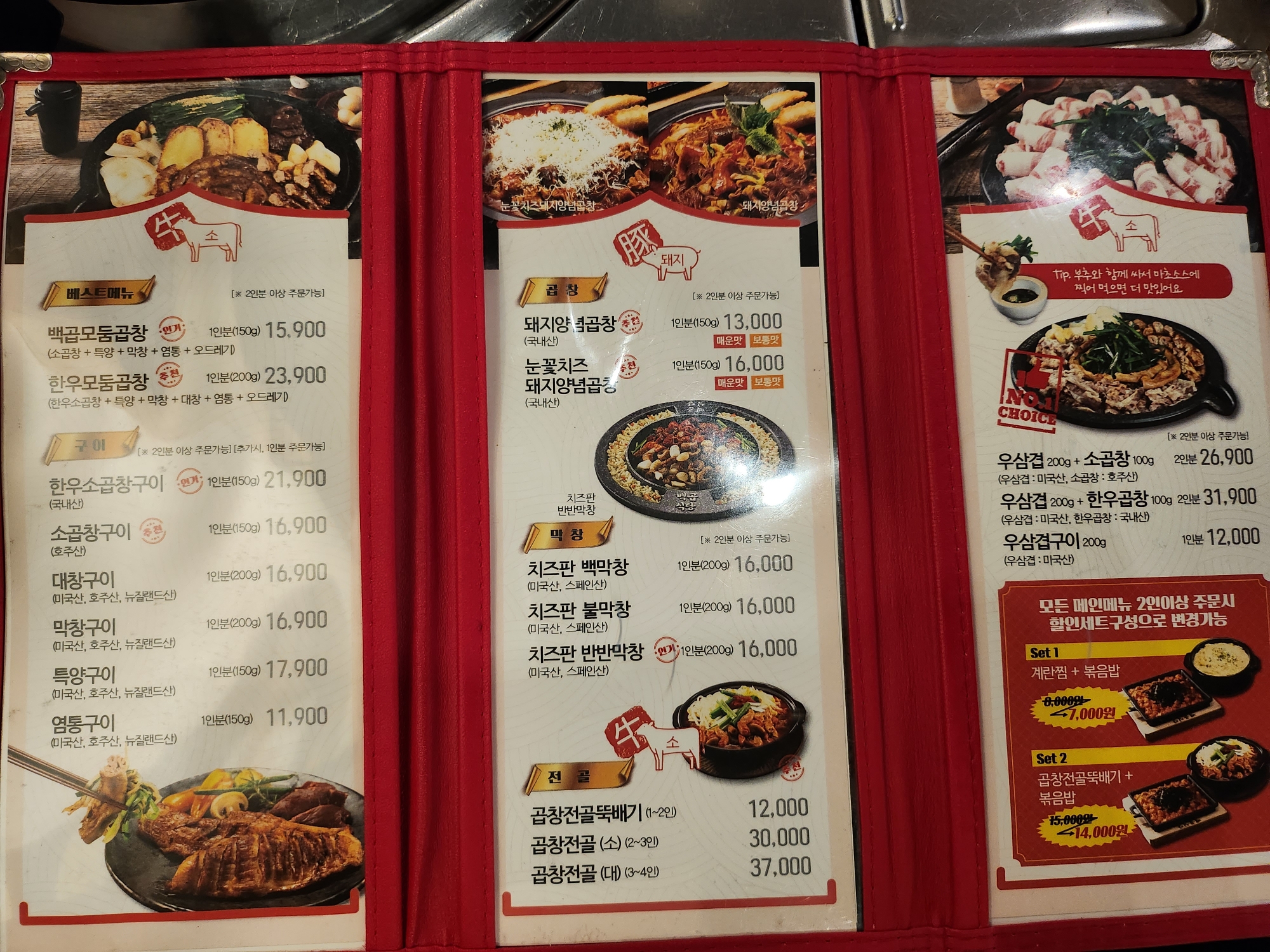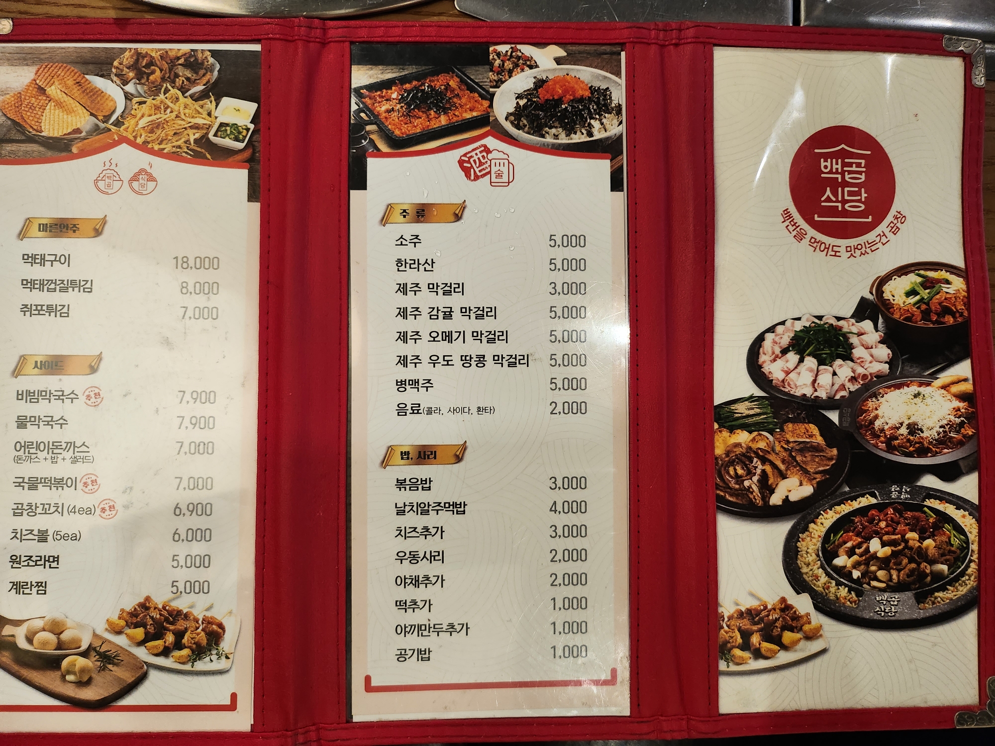 제주도의 물가를 안다면 백곱식당은 정말 가성비가 좋은 식당입니다. 소곱창과 특양, 막창, 염통이 함께 나오는 모둠곱창이 15,900원이라니! 3인 한판에 6-7만원인 것을 생각하면 적당히 기분좋게 저렴하게 먹을 수 있는 곳입니다.