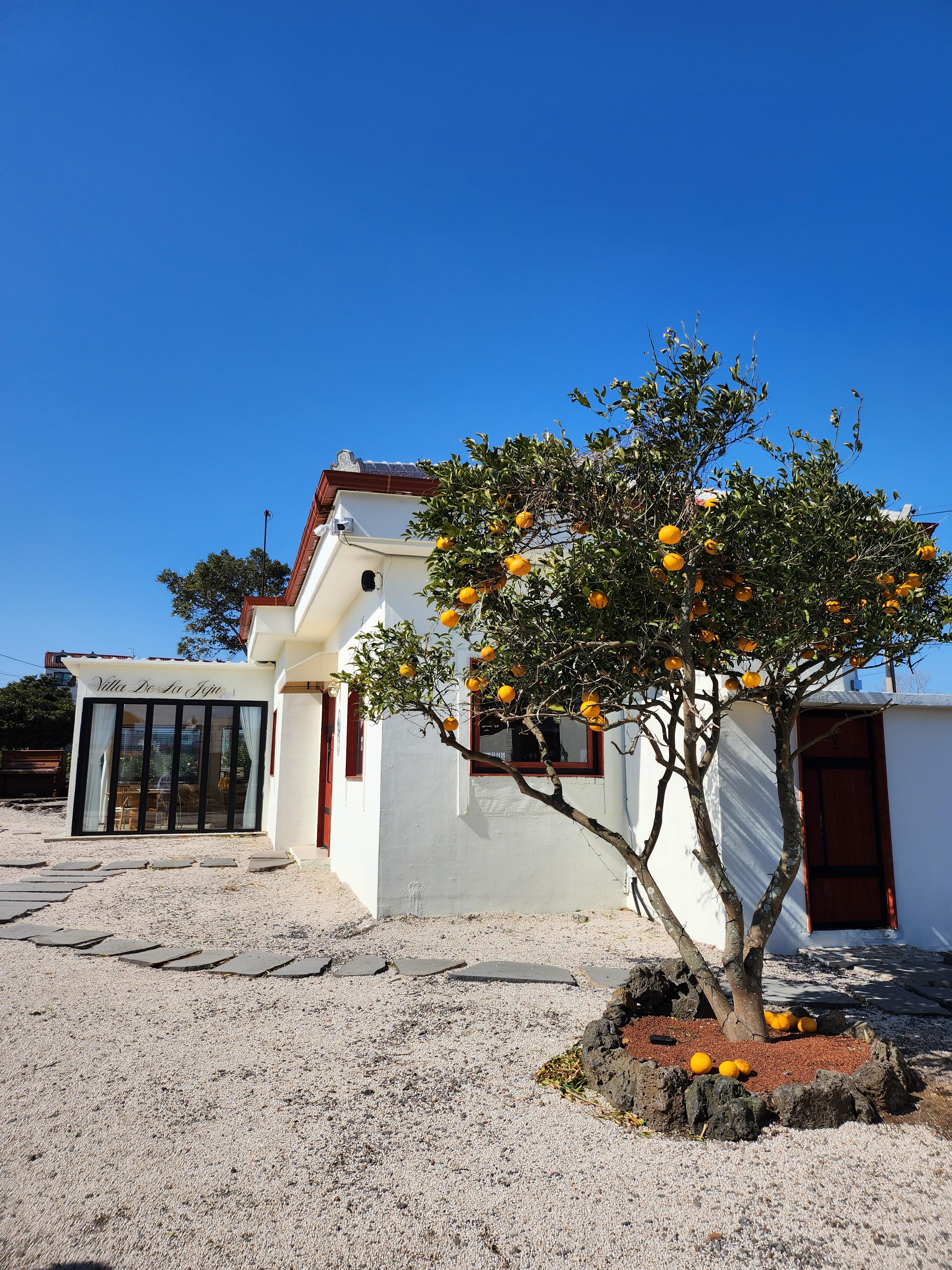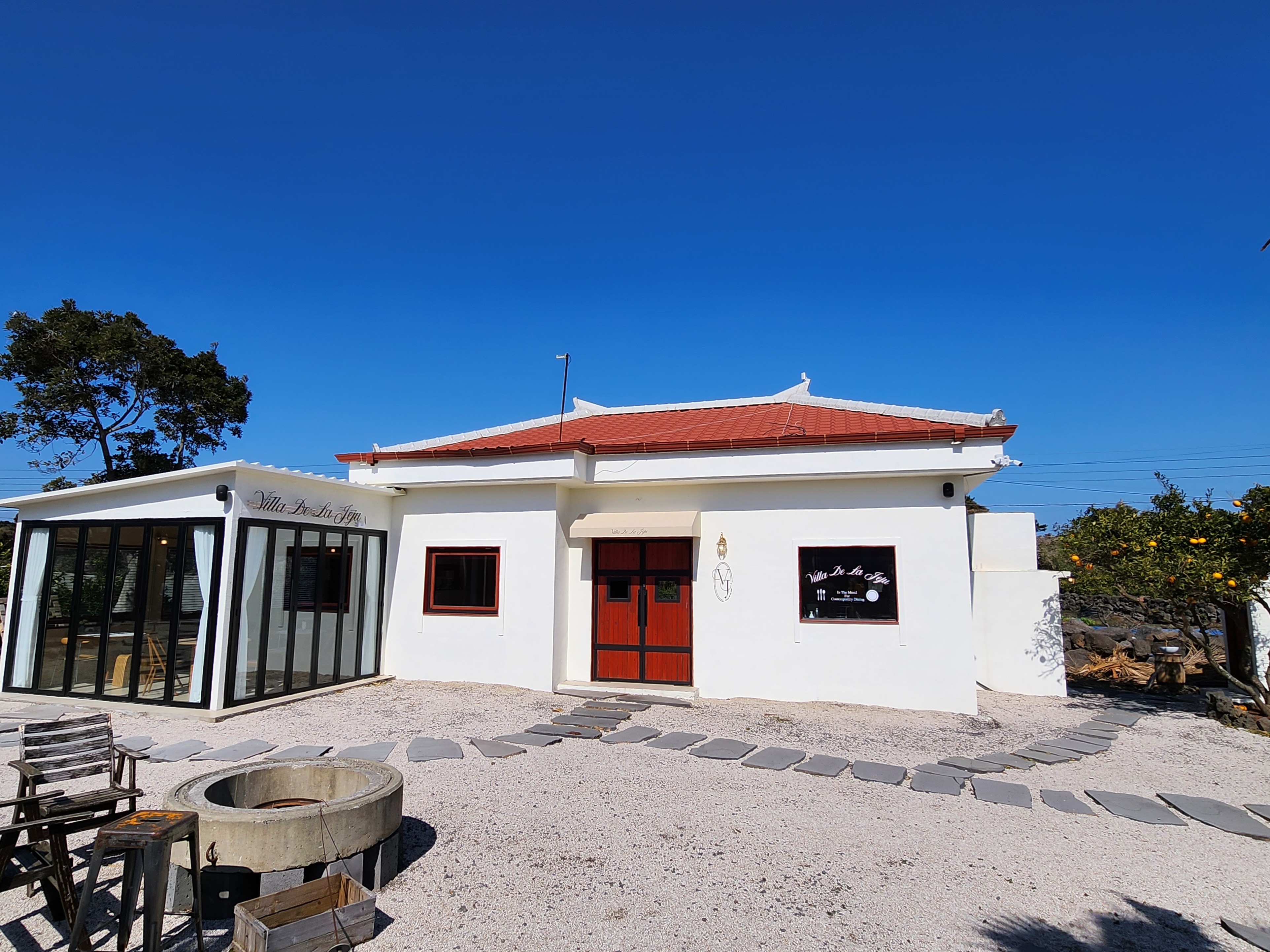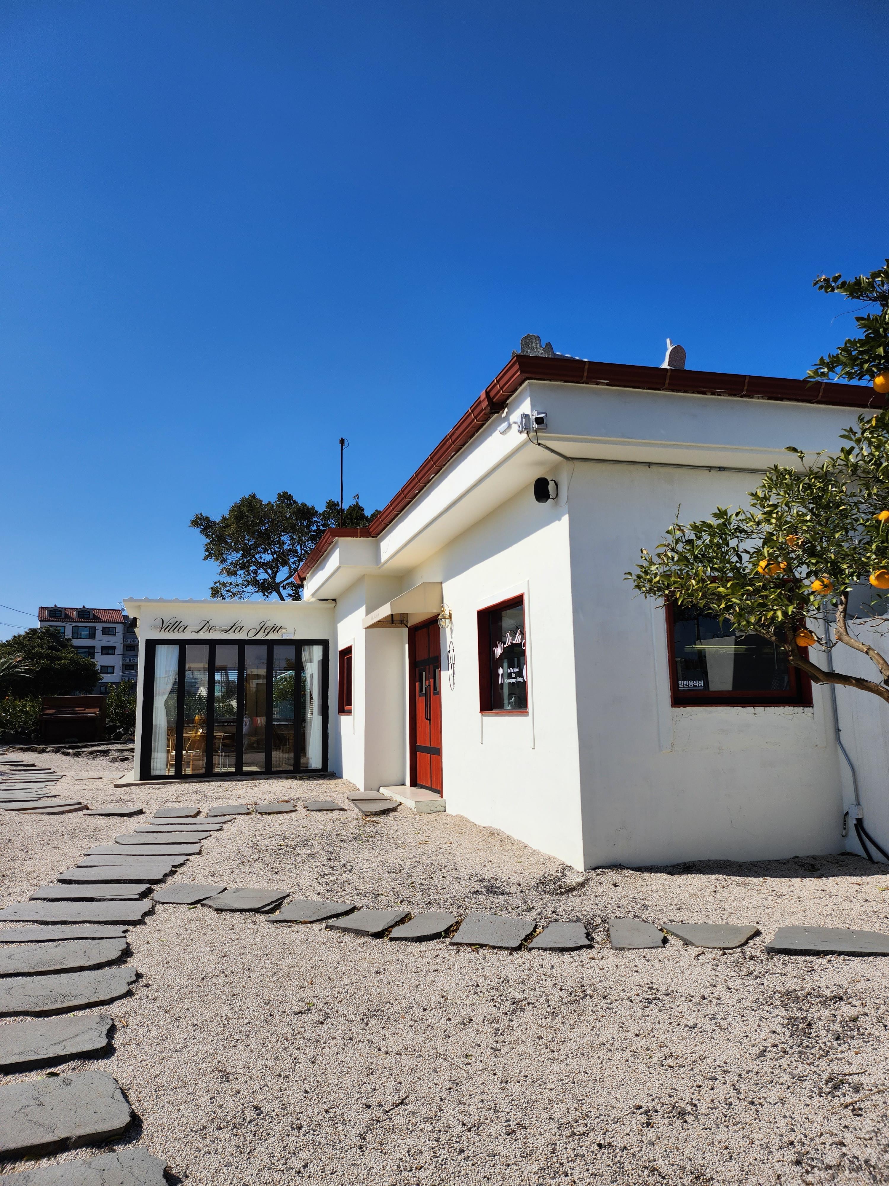 파란 하늘이 유독 예뻤던 날이라, 빌라드라 제주의 하얀 건물이 더욱 빛나보였다.