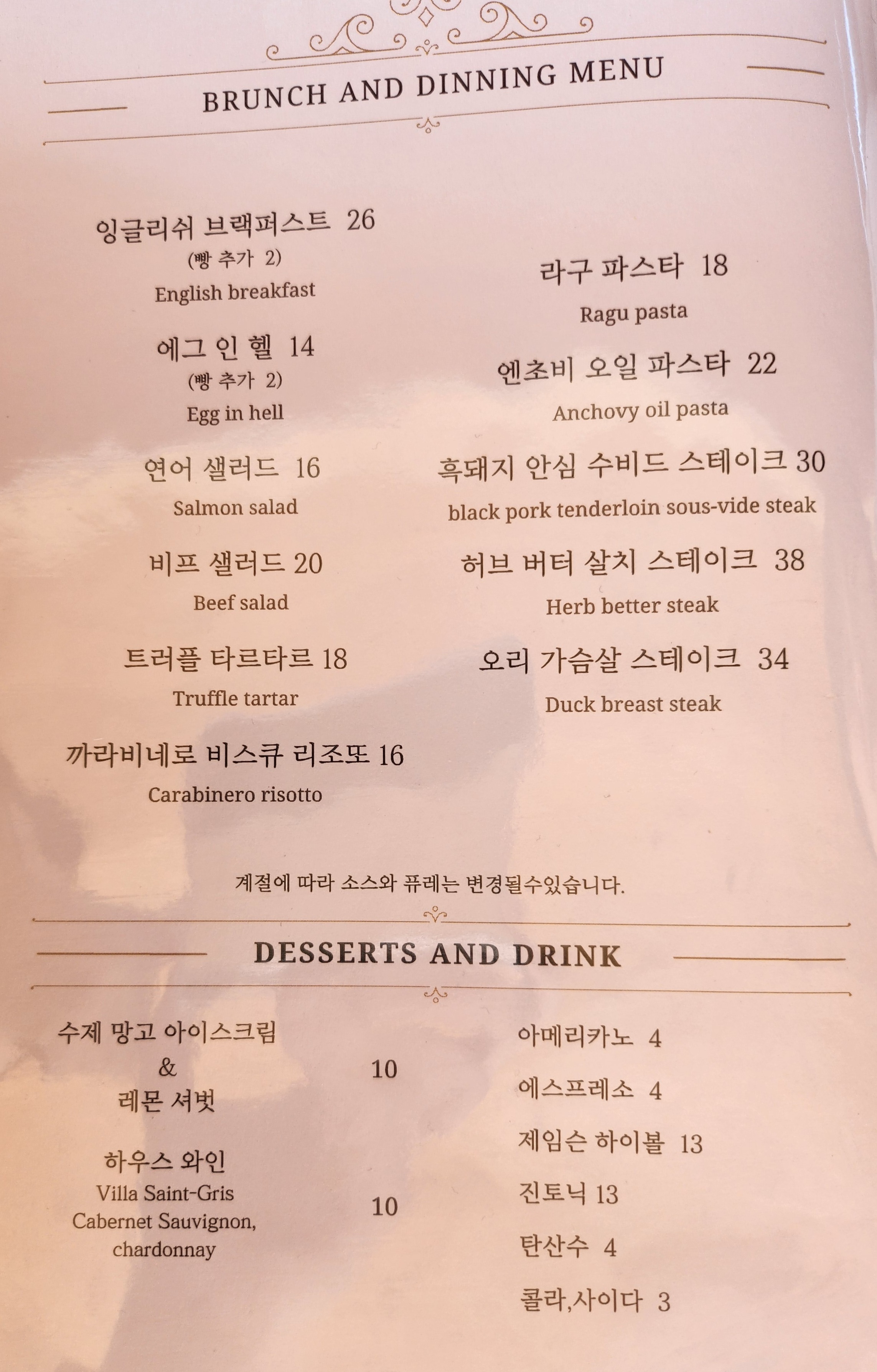 신선하고 상큼한 연어샐러드가 먹고 싶었지만 이날은 잉글리쉬 브랙퍼스트와 연어샐러드가 준비되지 않았다고해서, 비프 샐러드와 라구 파스타, 엔초비 오일 파스타를 주문했다.