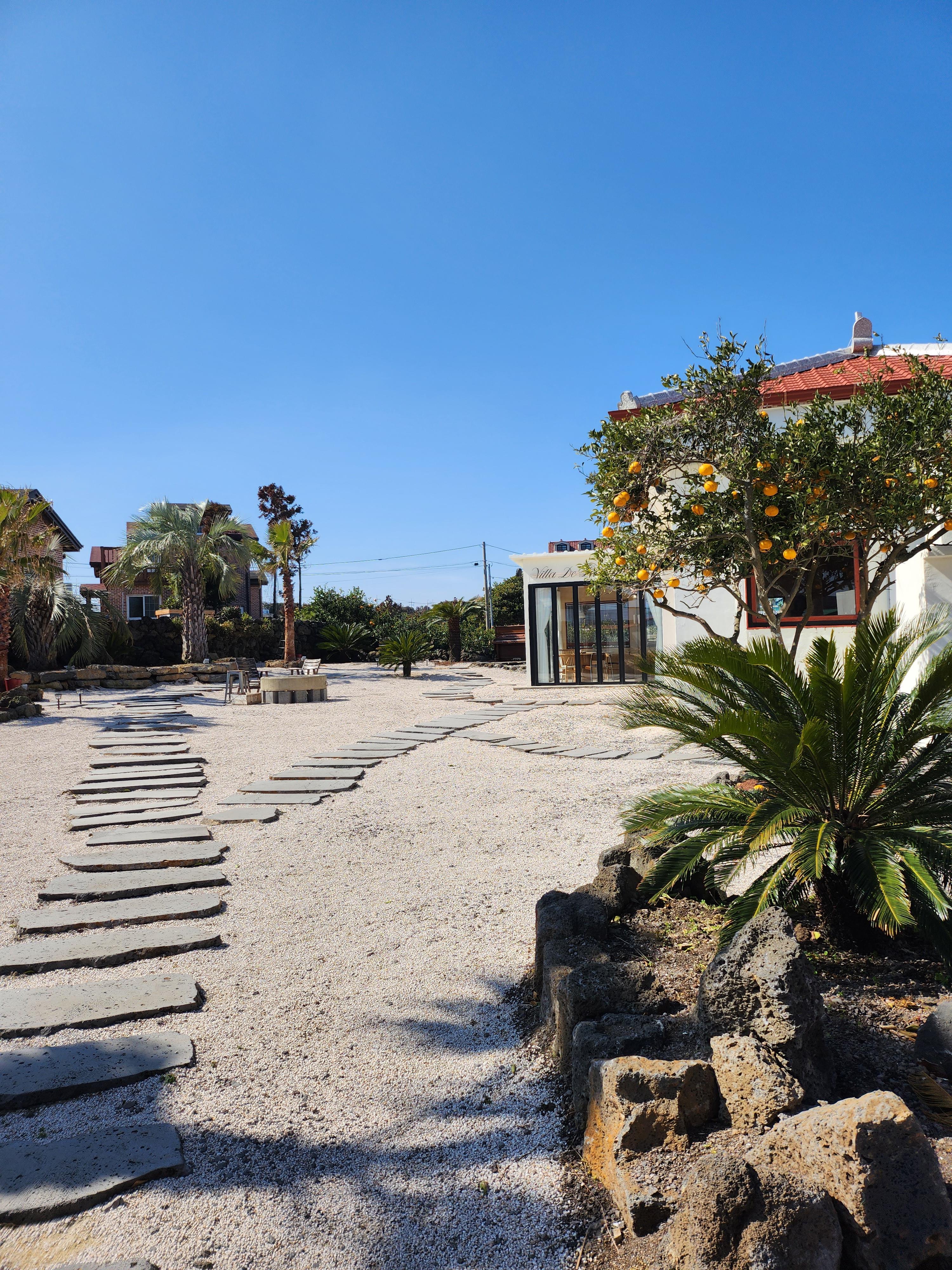 제주도스러운 분위기의 조경에 힘을 많이 쓴듯 현무암 돌담과 귤나무, 야자수가 예쁘게 꾸며져있었다.