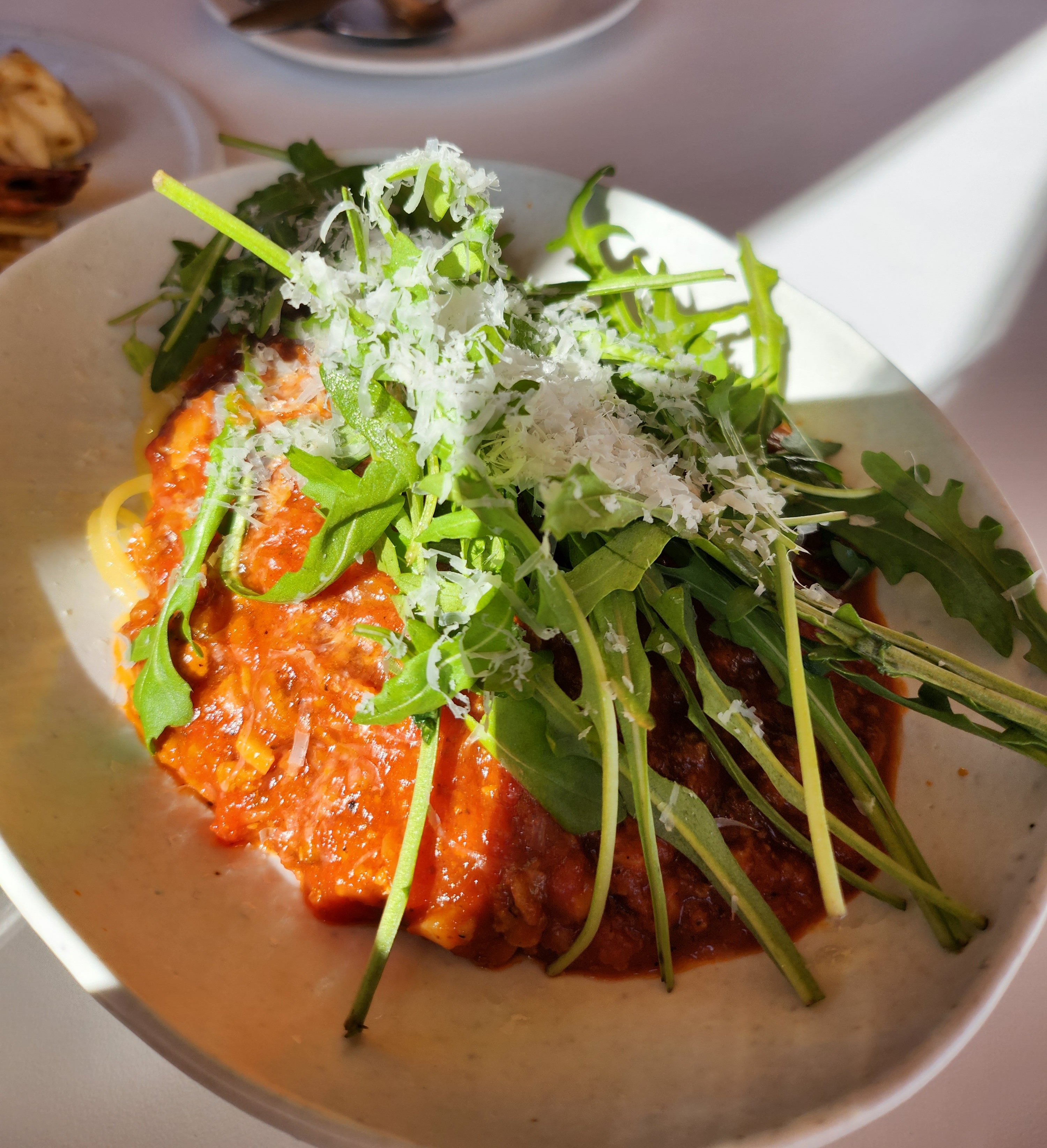 라구 소스 듬뿍 라구 파스타. 소스는 진한 맛은 아니었고 토마토 맛이 많이 나는 소스였다. 루꼴라가 좀 많아서 덜어내고 먹었다.