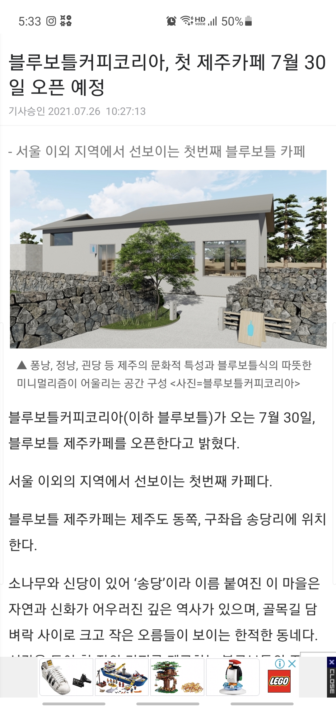 블루보틀커피코리아(이하 블루보틀)가 오는 7월 30일, 블루보틀 제주카페를 오픈한다고 밝혔다.서울 이외의 지역에서 선보이는 첫번째 카페다.블루보틀 제주카페는 제주도 동쪽, 구좌읍 송당리