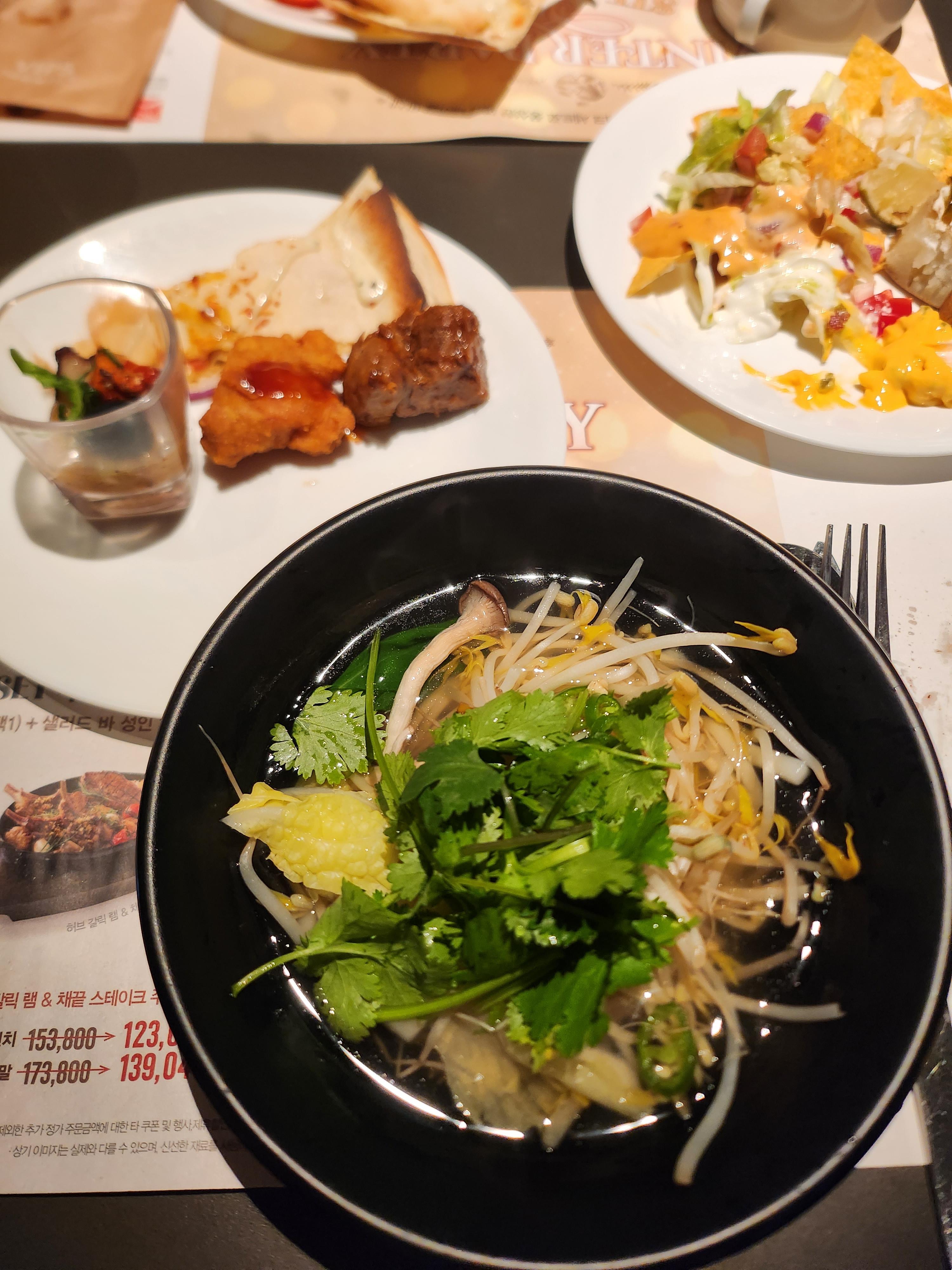 그리고 로봇이 만들어주는 쌀국수와 우동코너가 있어서 한그릇 먹어보았는데요, 로봇이 정확하지만 많이 느린아이더라고요. 그래서 재료 담아서 주문 넣어놓고 샐러드바 한바퀴 돌고오니 만들어두었길래 가져왔어요. 면은 조금만 넣고 숙주와 야채, 고추와 고수 듬뿍 올려 먹었는데, 국물이 진짜 맛있었어요. 소화되는 맛 이었지만 배가 너무 불러서 이제 그만 디저트 코너로 넘어가기로 했어요.