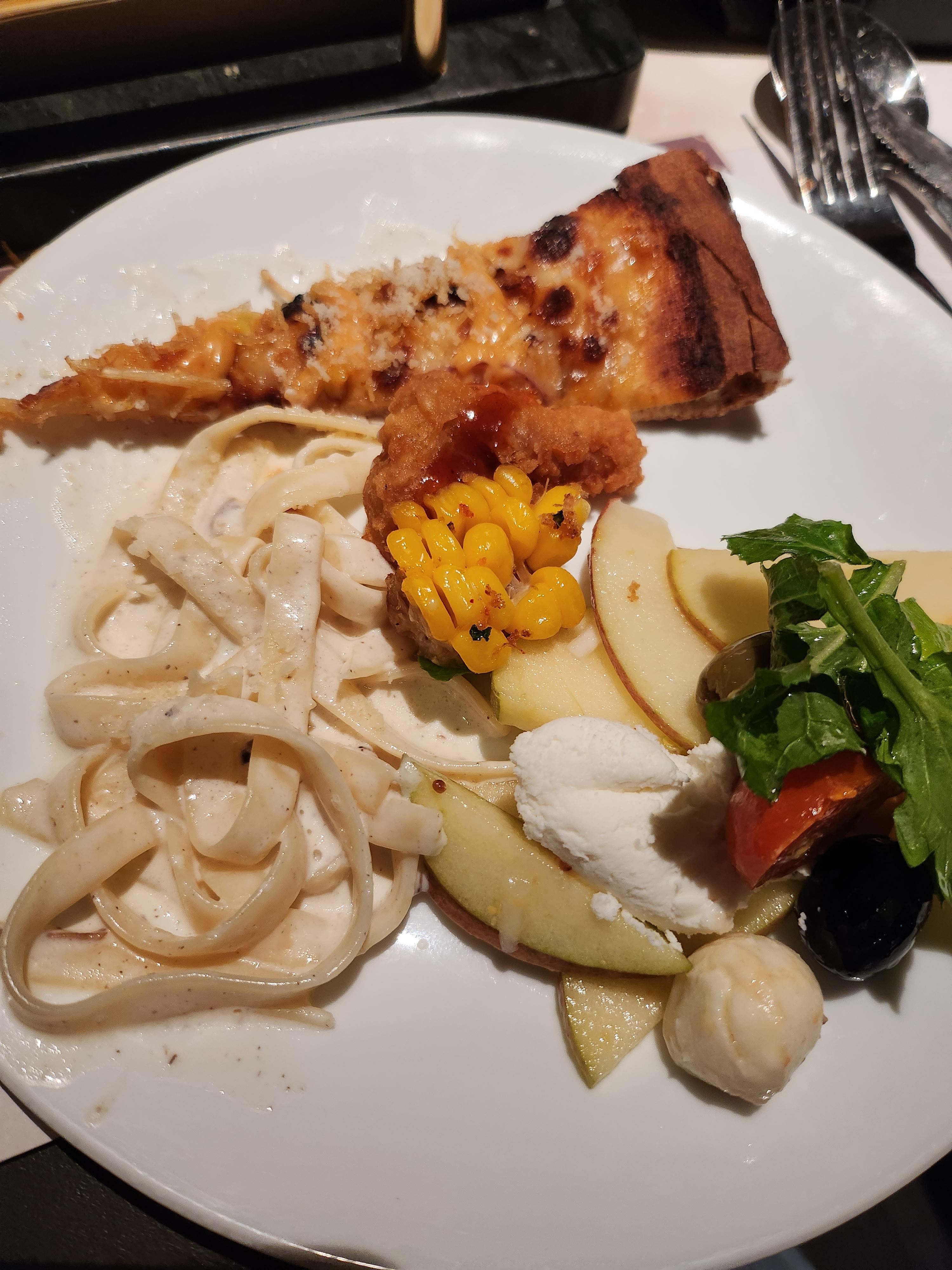 두번째 접시는 구운 옥수수와 크림파스타(이건 비추), 매콤한 피자와 사과 샐러드에 크림치즈를 올려서 먹었어요. 피자메뉴들이 다 너무 맛있더라고요. 화이트 와인과 먹으면 더더욱 맛있었겠지만, 운전자는 제로 콜라로 아쉬움을 달랬죠.