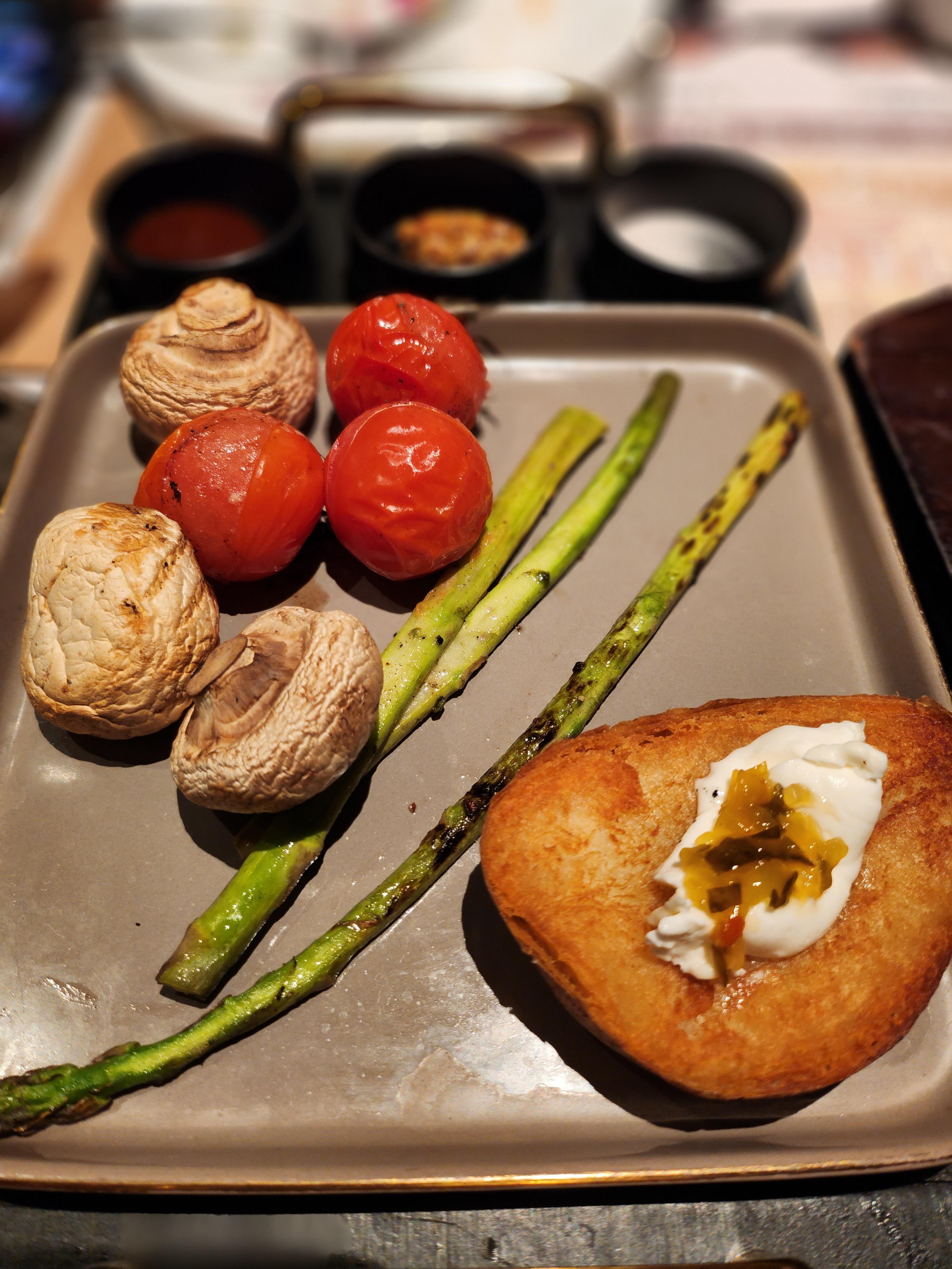 가니쉬로 사워크림을 올린 구운감자와, 양송이, 아스파라거스, 방울토마토가 나왔습니다. 가니쉬는 따뜻하지 않고 조금 식은 상태여서 스테이크 팬에 올렸더니 조금 따뜻하게 먹을 수 있었어요.