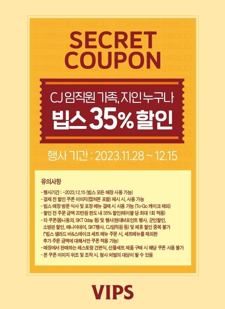 빕스 35%가 할인되는 CJ임직원 시크릿 쿠폰입니다. 임직원 쿠폰이지만 캡쳐해서 제시하면 누구나 사용할 수 있는 쿠폰으로 총 금액의 35%가 할인되는 쿠폰이예요.
