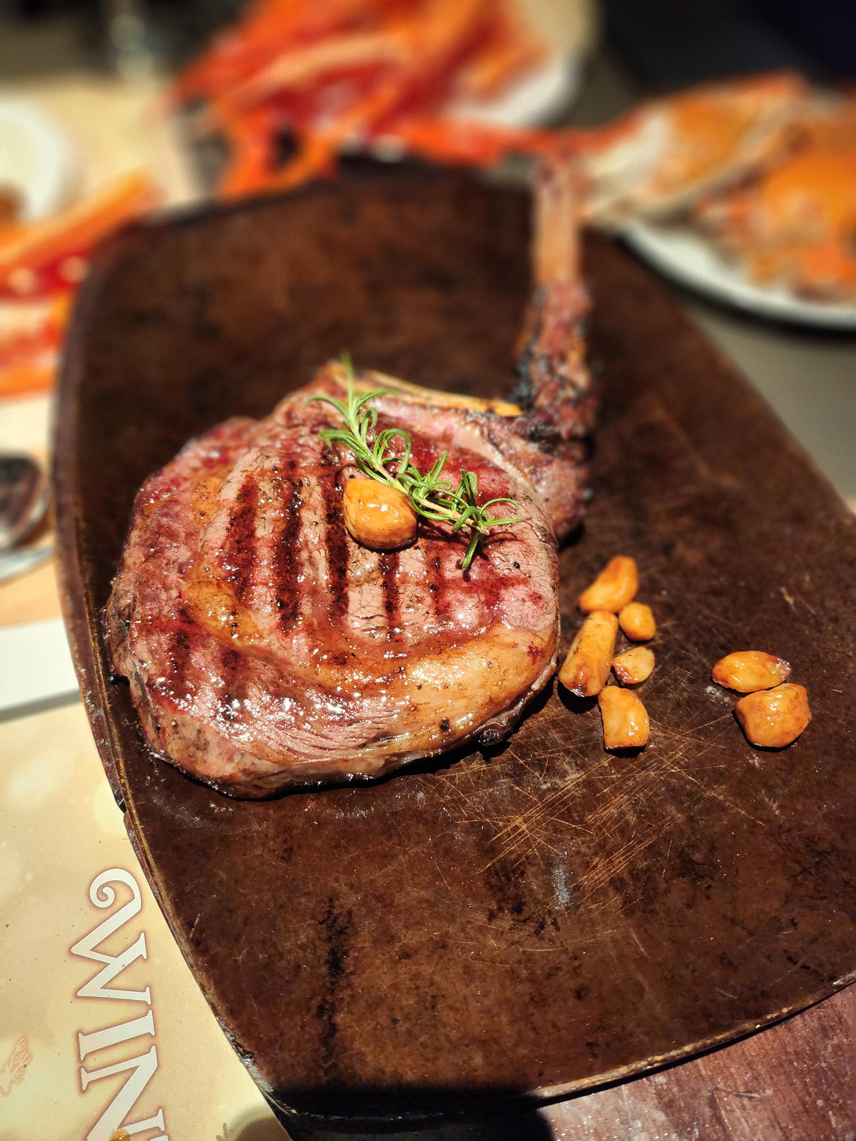 샐러드바를 이용하고 오니 토마호크 스테이크가 등장했어요. 먼저 사진 찍을 수 있게 세팅해주시고, 사진촬영이 끝나면 서버분이 부위별로 손질을 해주십니다. 새우살과 등심 갈빗살이 있는데, 모든 부위가 다양하게 맛있더라고요. 굽기는 미디움 레어로 했는데 딱 좋았어요. 같이 제공되는 마늘이 너무 맛있는데, 지난번에도 그랬는데 마늘 좀 넉넉하게 주셨으면..