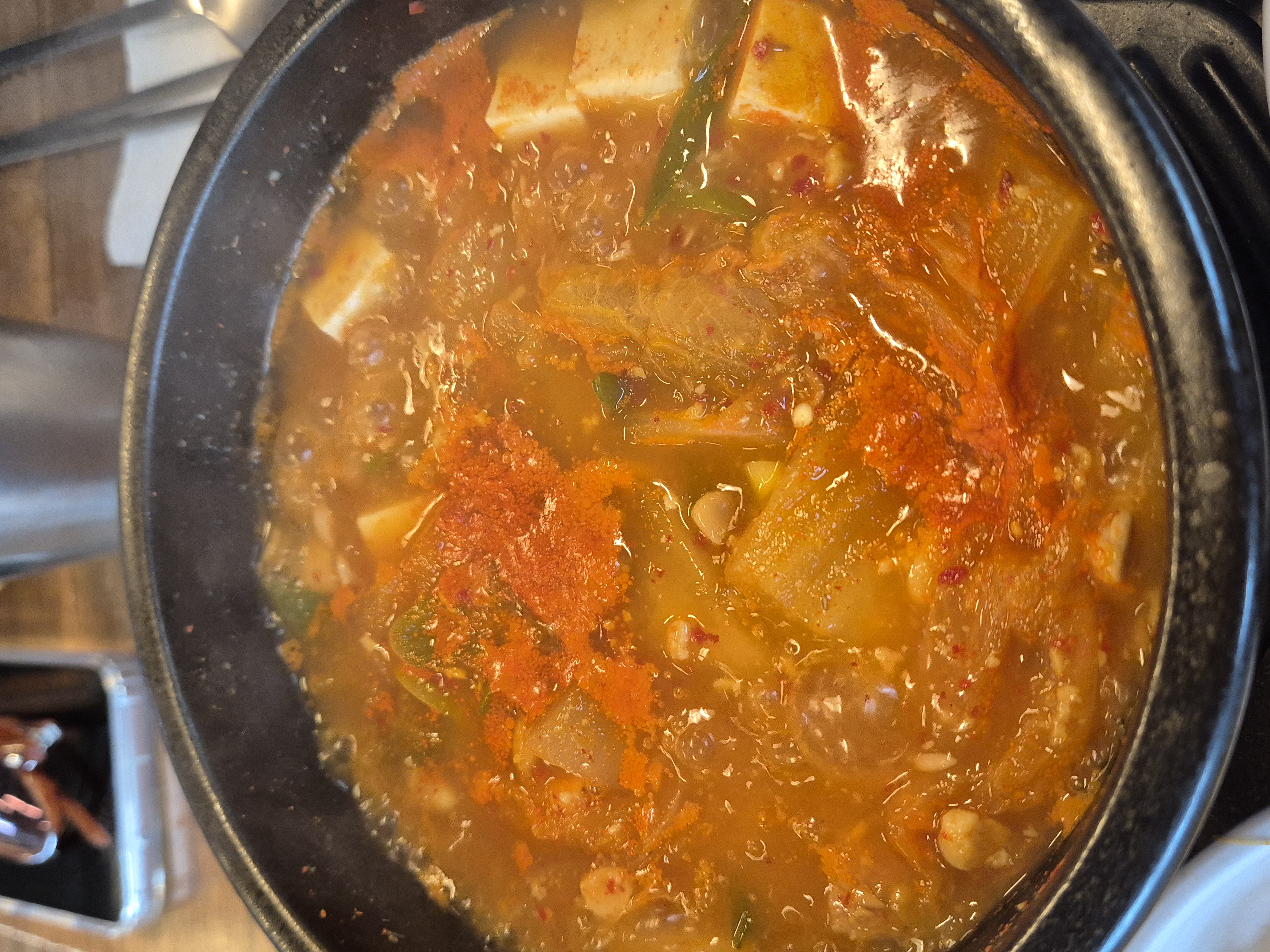 밑반찬은 쌈무, 콩나물무침, 미역초무침, 무채, 김치, 파채, 계란찜이 나오고 부족한 반찬은 셀프코너에서 리필할 수 있다.