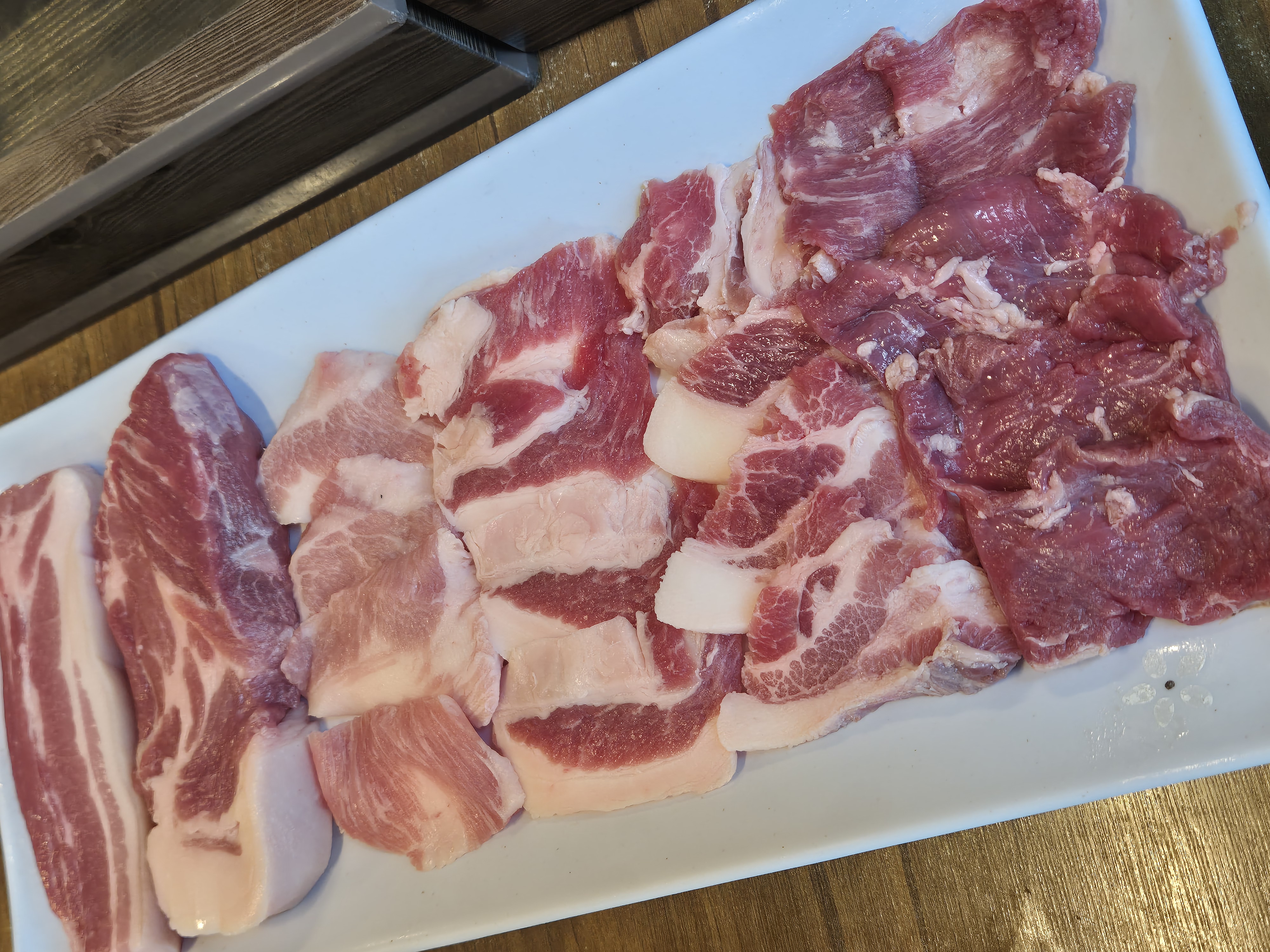 메뉴는 오겹살, 목살, 가브리살, 항정살, 갈매기살등이 있고 이 모든게 한판에 나오는 생돼지모듬이 있는데 우리는 생돼지모듬을 주문했다.