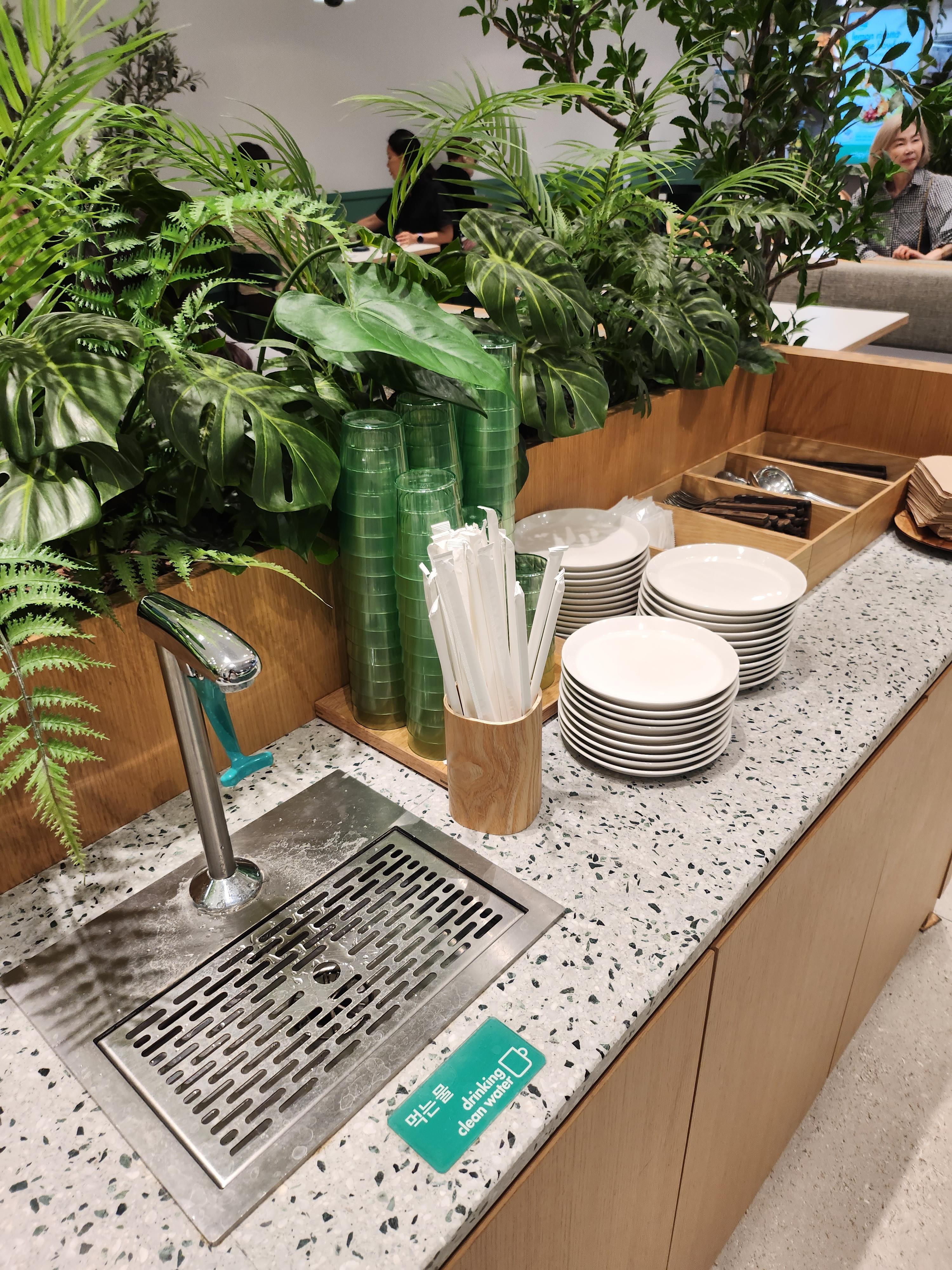 셀프바에 접시와 식기, 물컵과 손씻는 곳도 마련되어있어서 필요한만큼 이용할 수 있다.