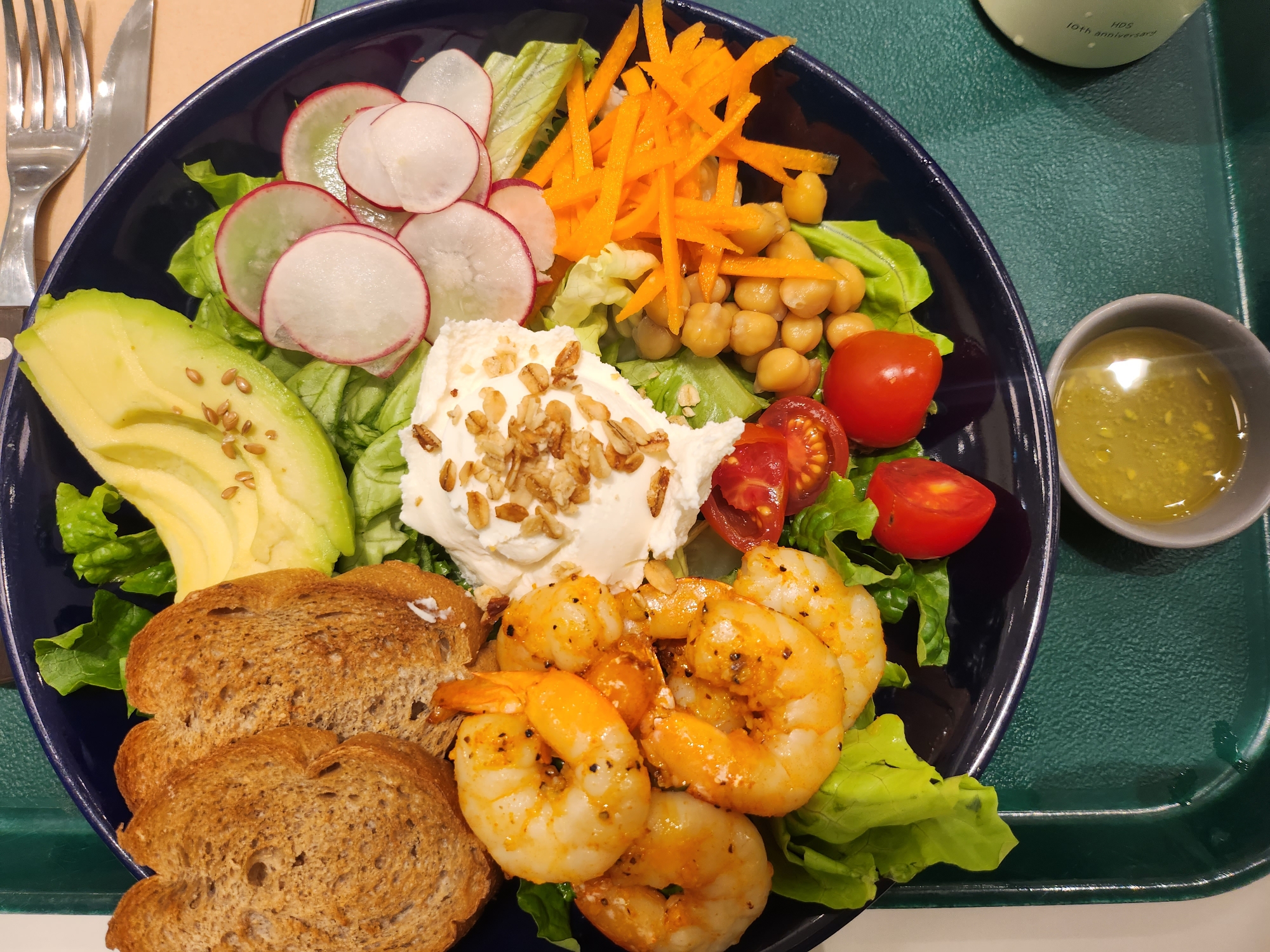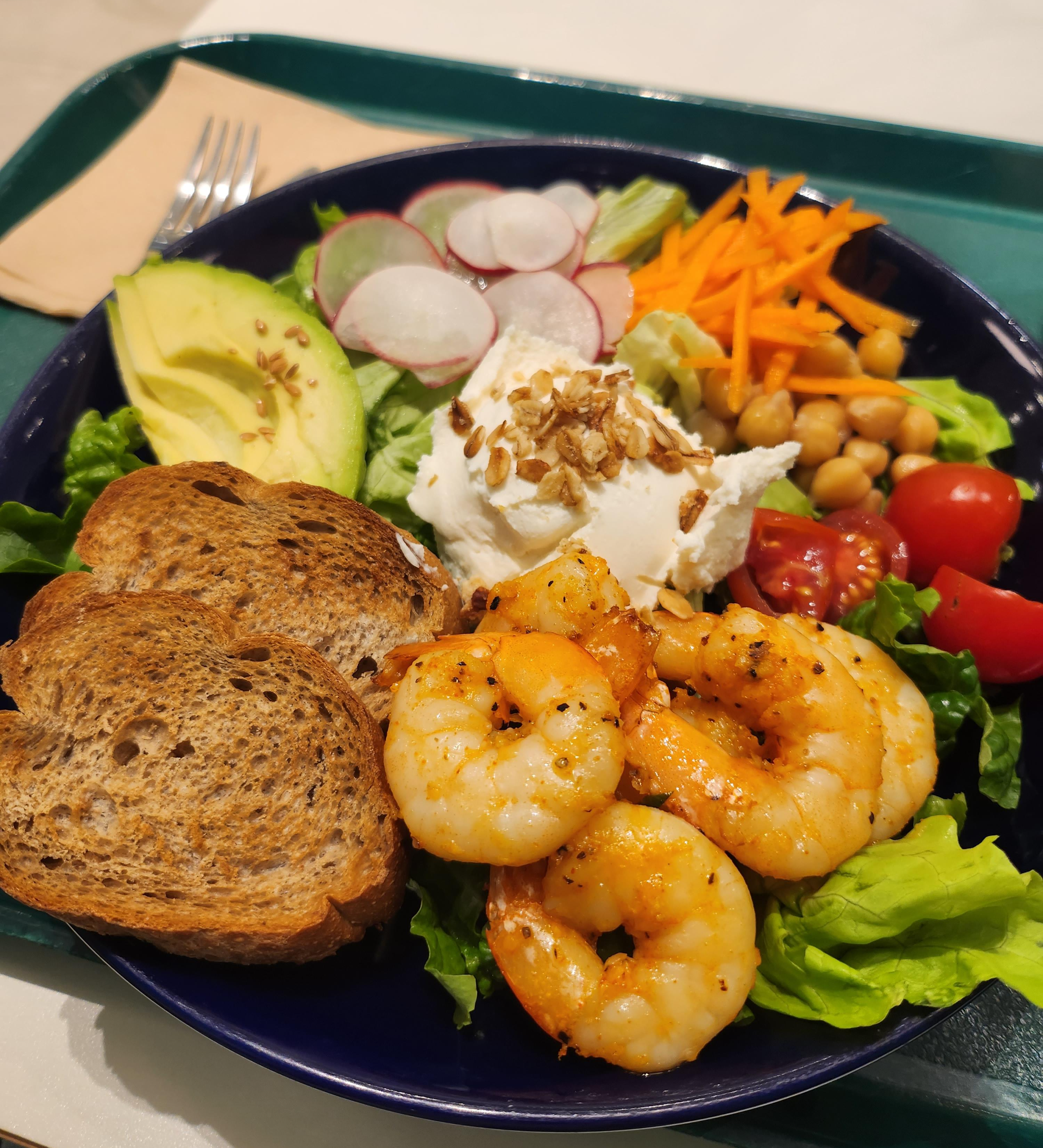 야채와 아보카도, 병아리콩, 방울토마토, 빵 두조각과 리코다치즈 한스쿱, 매콤한 시즈닝으로 양념한 새우까지