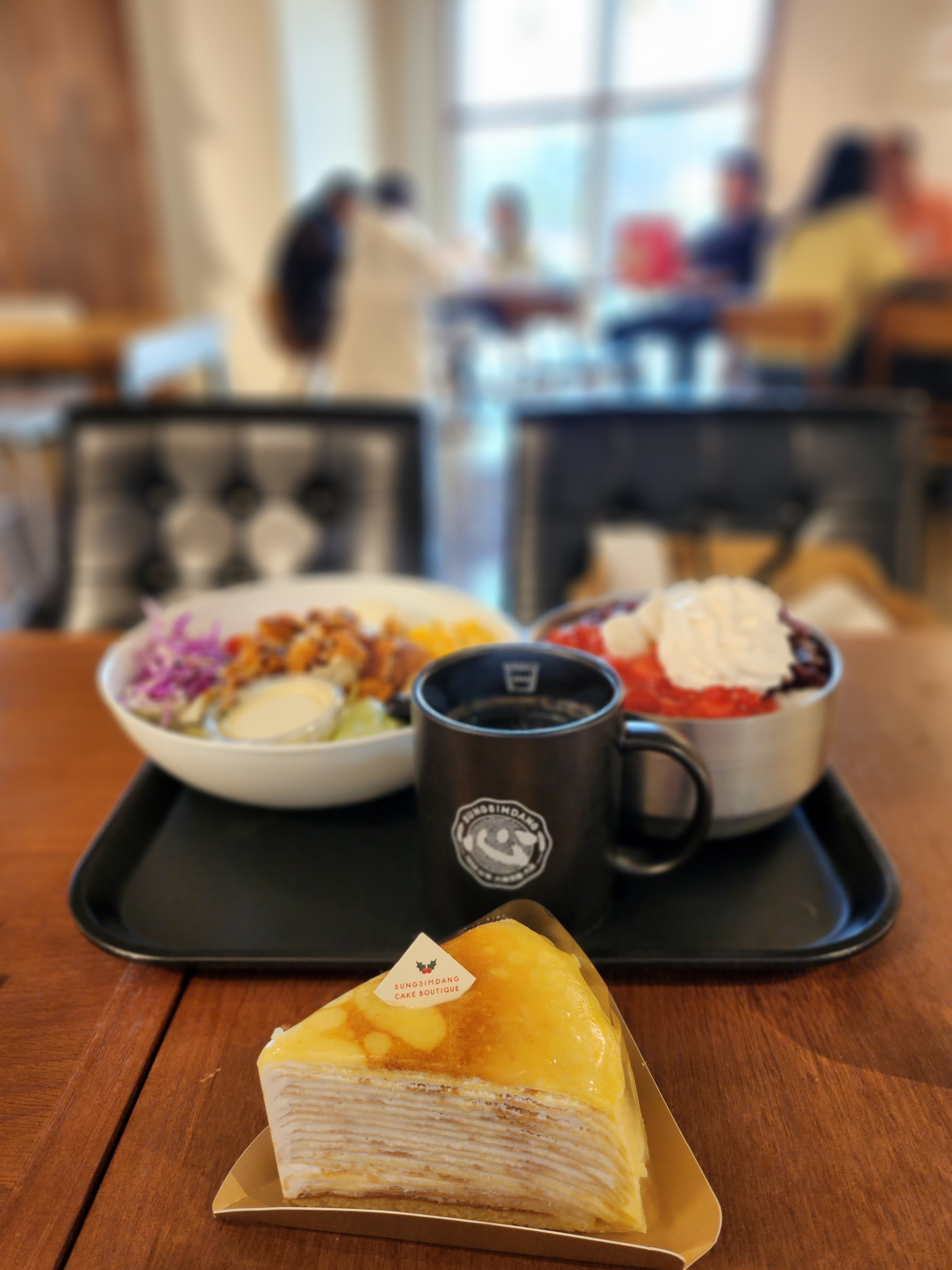 치킨샐러드와 따뜻한 아메리카노, 그리고 전설의 팥빙수를 주문했다. 엄마가 대전에 계신데도 못드셔봤다고 하셔서 거의 성심당 직원처럼 팥과 딸기, 떡에 대해서 설명하며 드셔보시라고 했다. 크레이프 케이크는 바로 먹을거라 포장없이 가져왔는데, 결국 배가 너무 불러서 집에가서 먹었다 ㅎㅎ