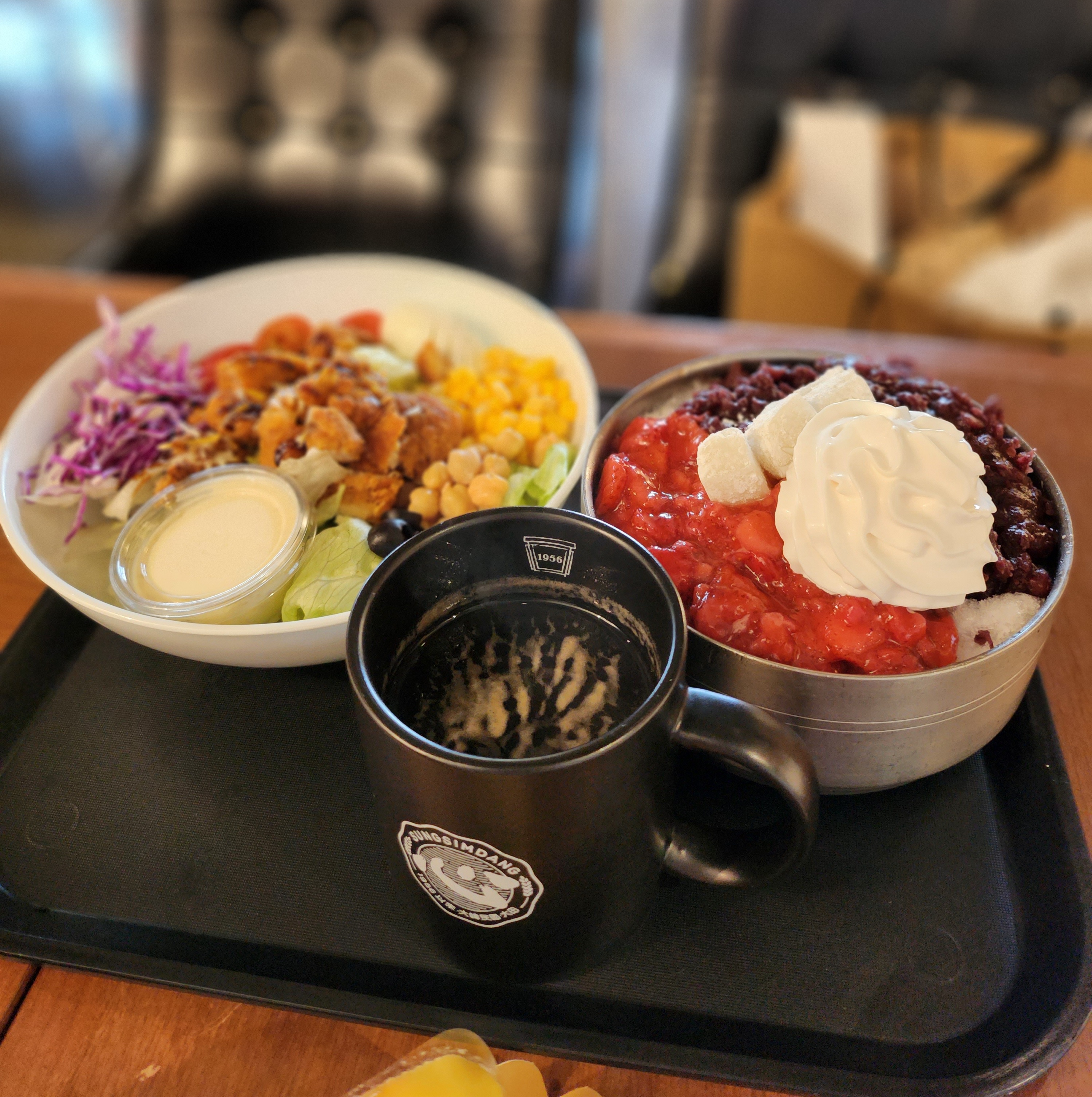 샐러드는 엄청난 맛이라기 보다는 가성비가 정말 끝내주는 메뉴였고, 전설의 팥빙수는 6,000원인데 2-3명이서 먹기에도 충분할정도로 양이 많다. 게다가 팥도 직접 만들고 딸기청도, 그리고 떡까지 직접 만든다고 한다. 당연히 통조림 팥과 통조림 딸기청이라고 생각했는데... 정말 말도 안되는 서사에 말도 안되는 가격에, 엄청난 맛을 느낄 수 있는 강력추천 메뉴이다.