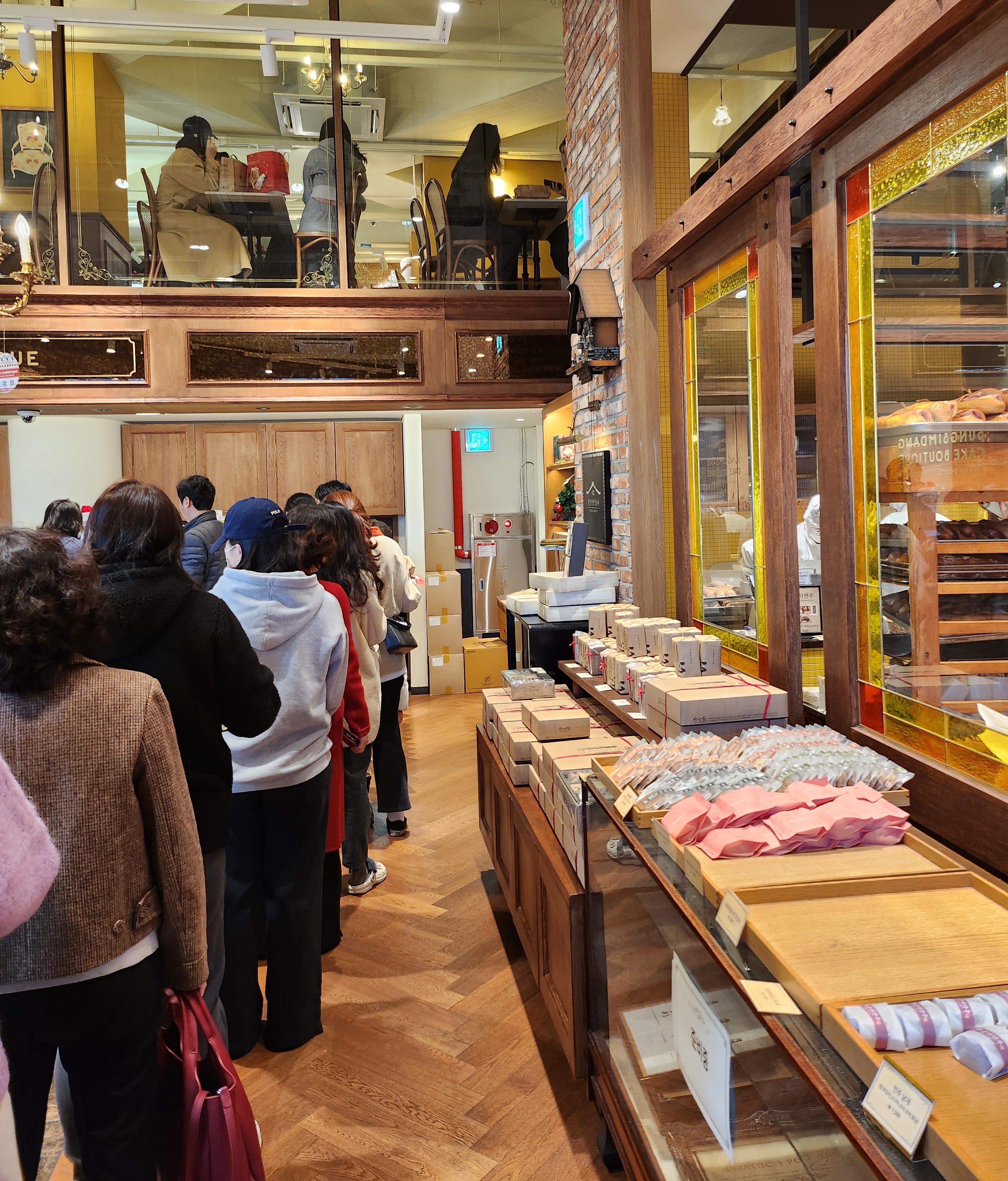 바글바글한 빵 섹션에 있다가 넘어와서 케이크 쪽은 한산하다고 생각했는데, 지금 보니 여기도 사람이 많기는 많았다. 아쉽게도 딸기시루는 본점에서만 구매 가능해서 이곳에서는 딸기시루를 제외한 홀케이크와 조각케이크 구움과자, 순수롤케이크, 마카롱등을 판매하고 있었다.