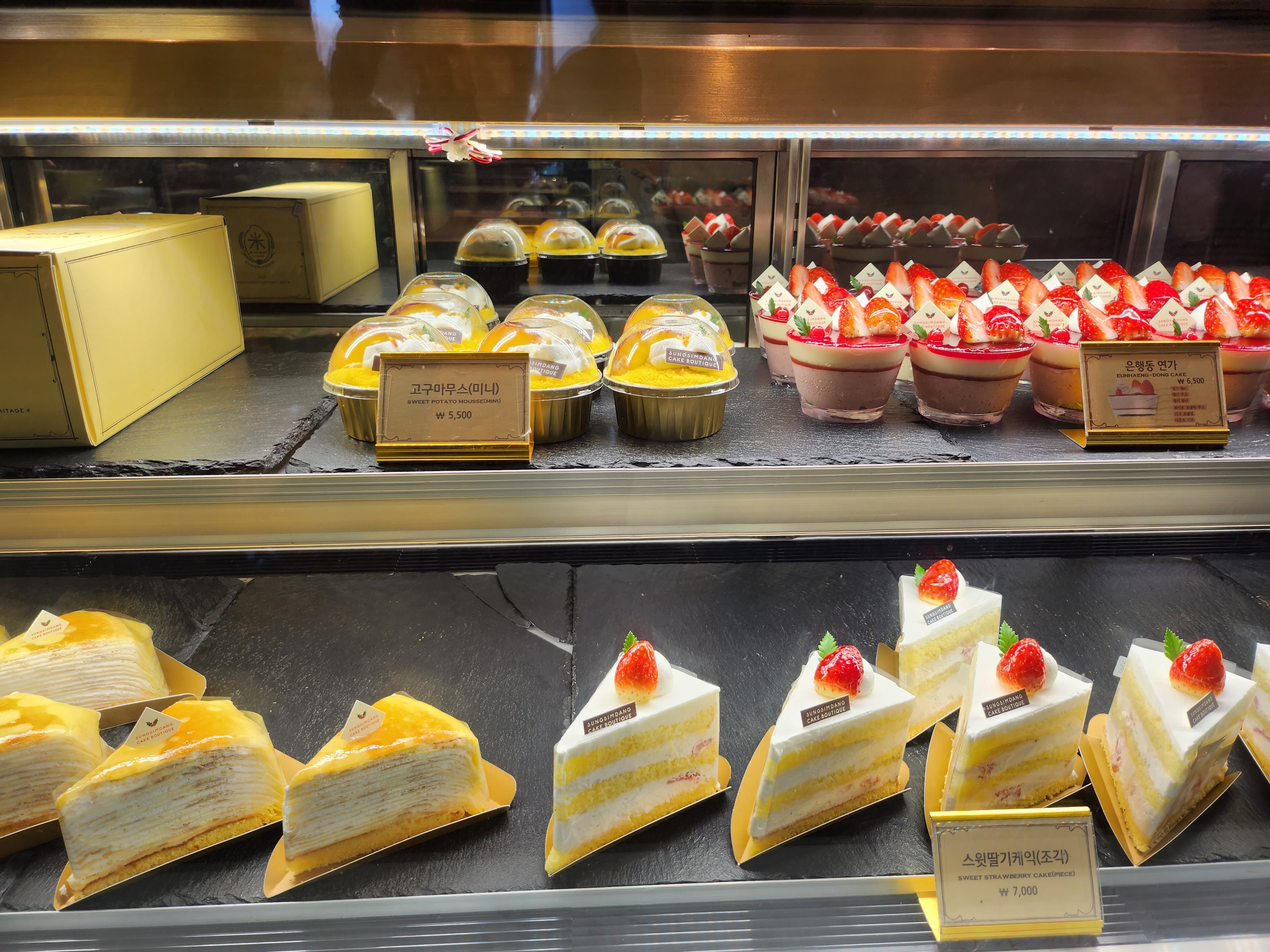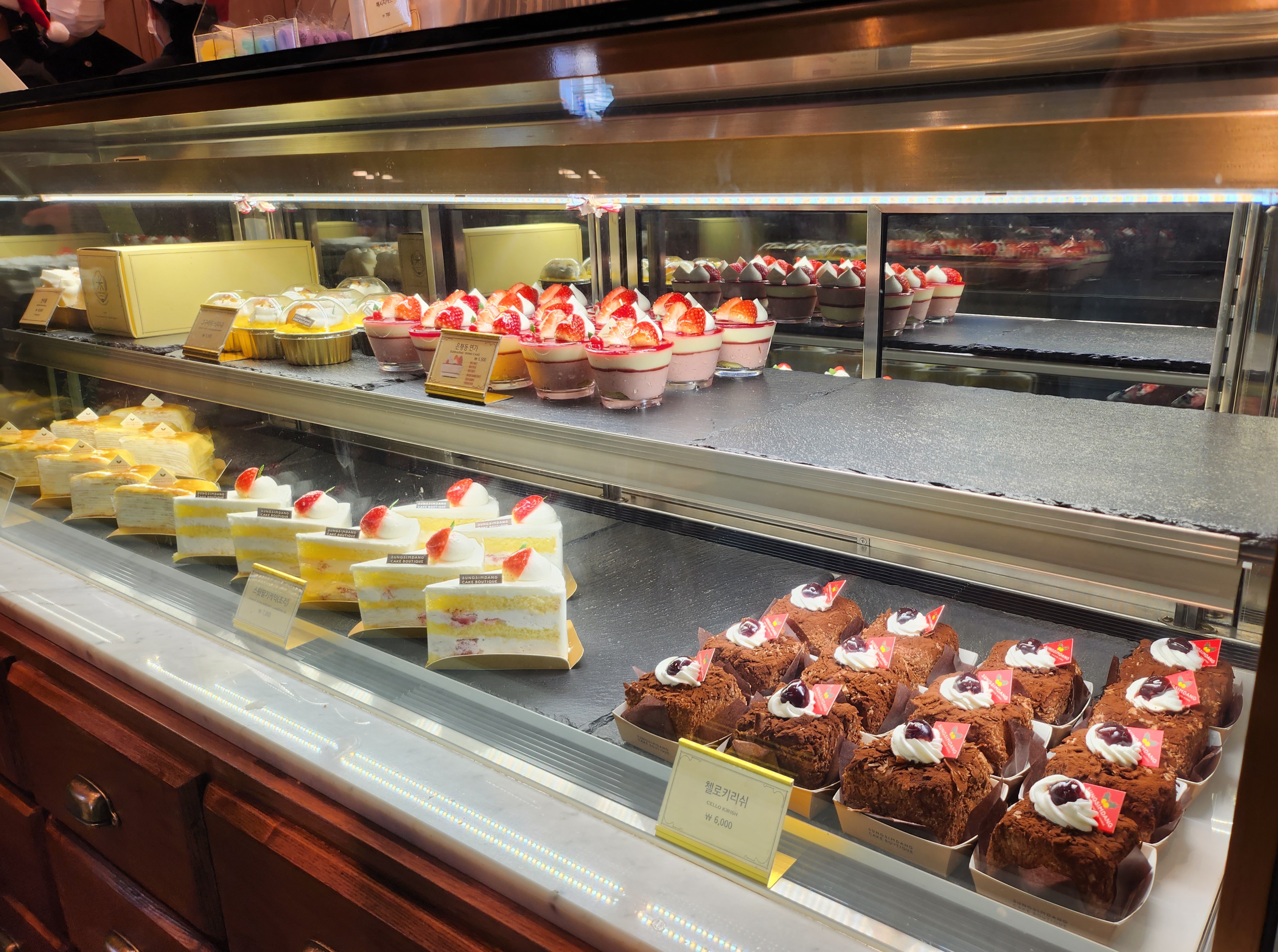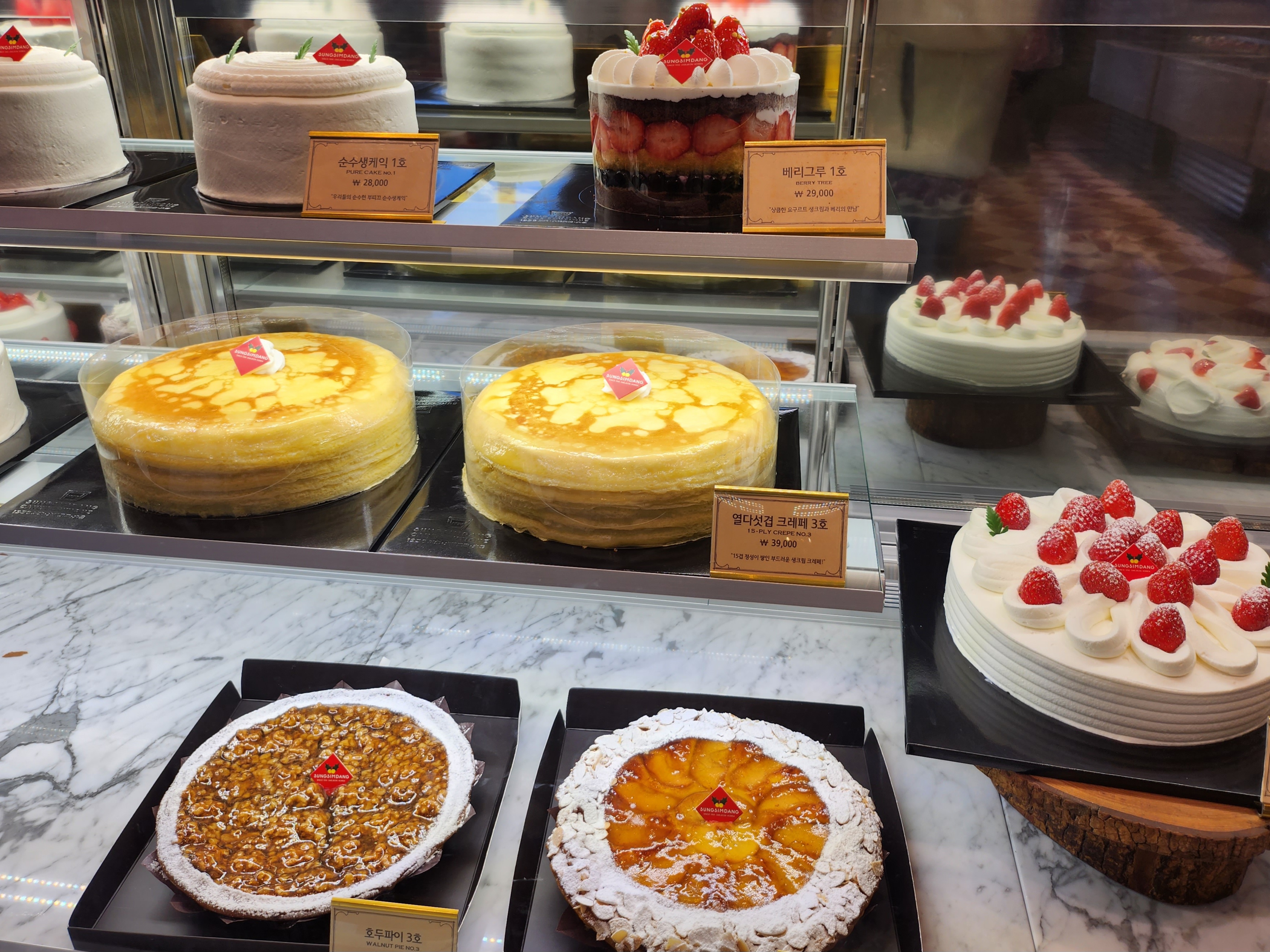 딸기 시즌이라 딸기가 올라간 케이크들이 많았고, 아는 사람만 먹는다는 크레페 케이크와 호두파이, 초코 케이크, 후르츠 케이크가 전시되어 있었다.