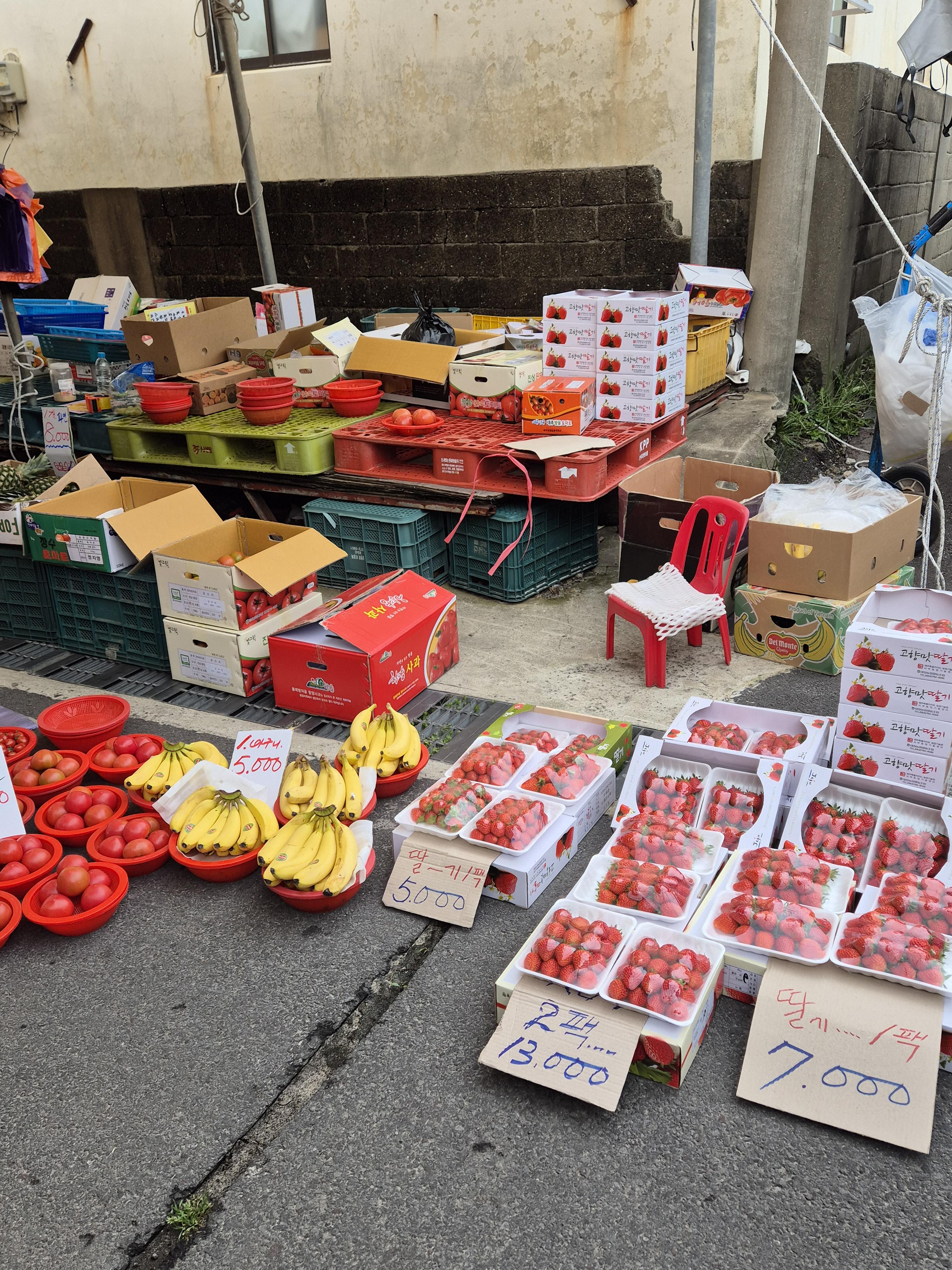 딸기는 마트에서 사는 것보다 오일장에서 구매하는게 훨씬 저렴하다. 이제 딸기의 철이 끝나가긴하지만, 언제 먹어도 맛있는 딸기와 각종 과일들을 바구니에 담아 판매하고 있다.