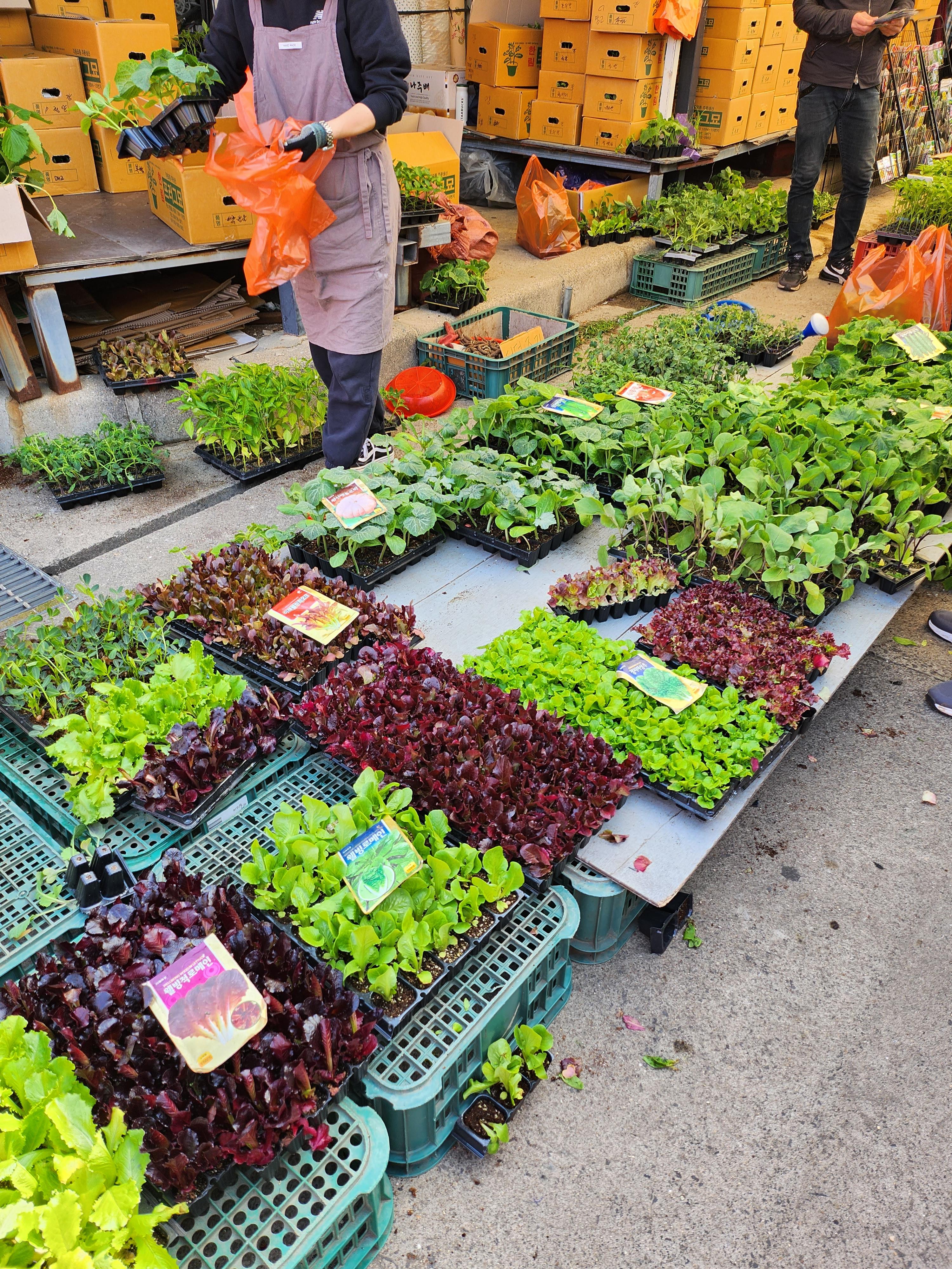 상추 종류만도 다양하다. 모종 가격이 워낙 저렴하다보니 한개씩 판매하지는 않고 줄로 판매한다. 보통 5-7줄 정도가 구매하는 최소 수량이라고 생각하면 된다. 고수 모종은 7개에 2천원을 주고 구매했다.