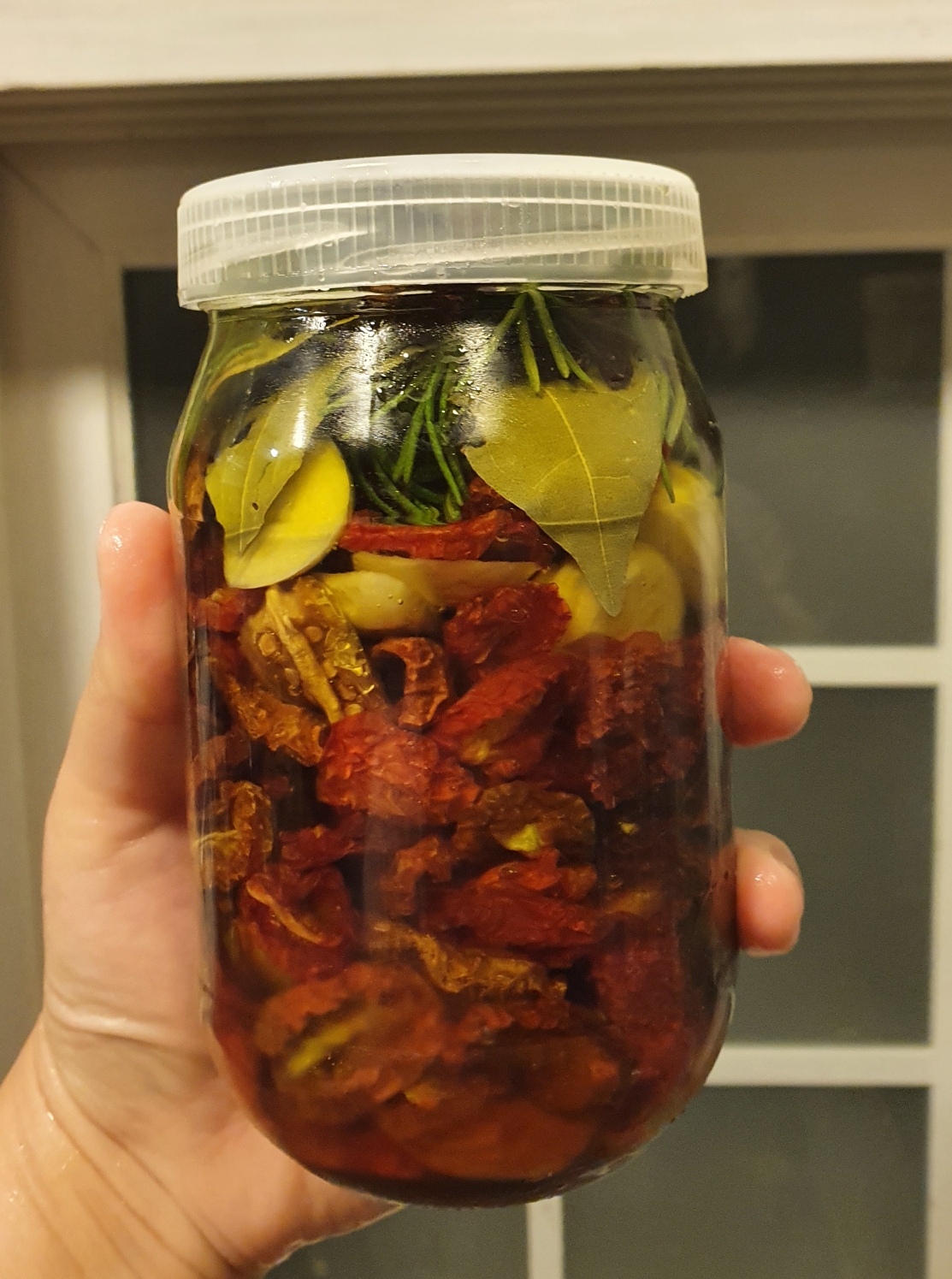 소독한 병에 말린 토마토와 로즈마리, 편마늘, 월계수 잎