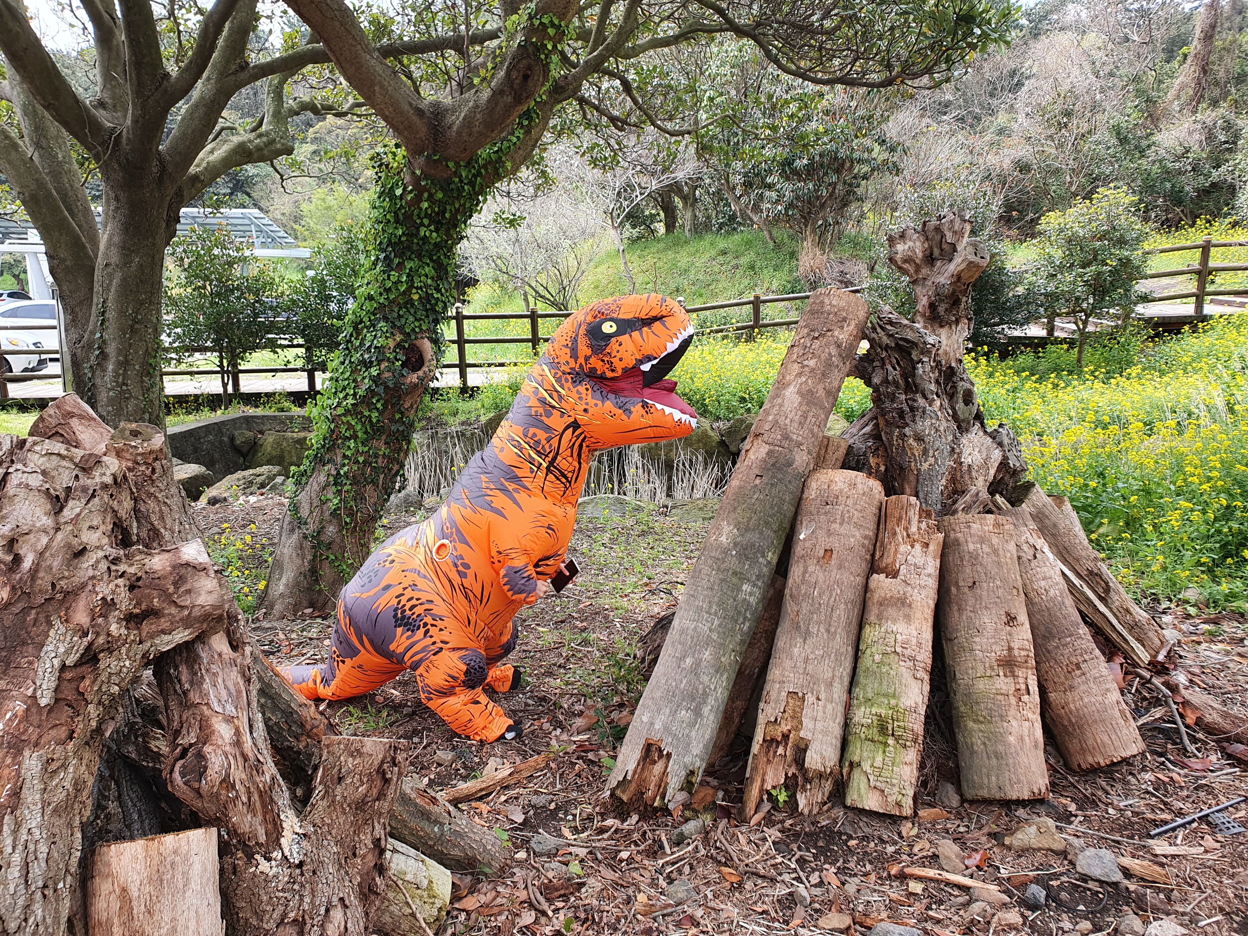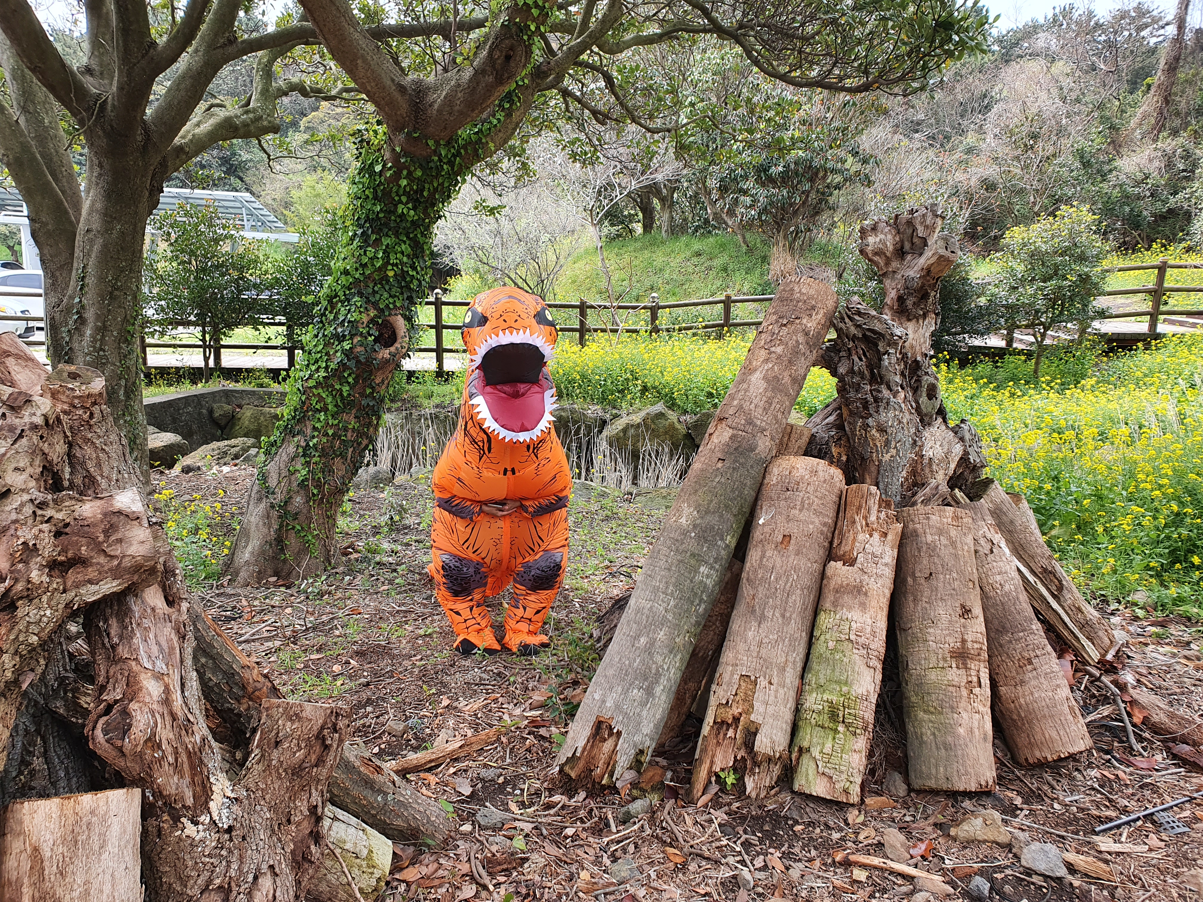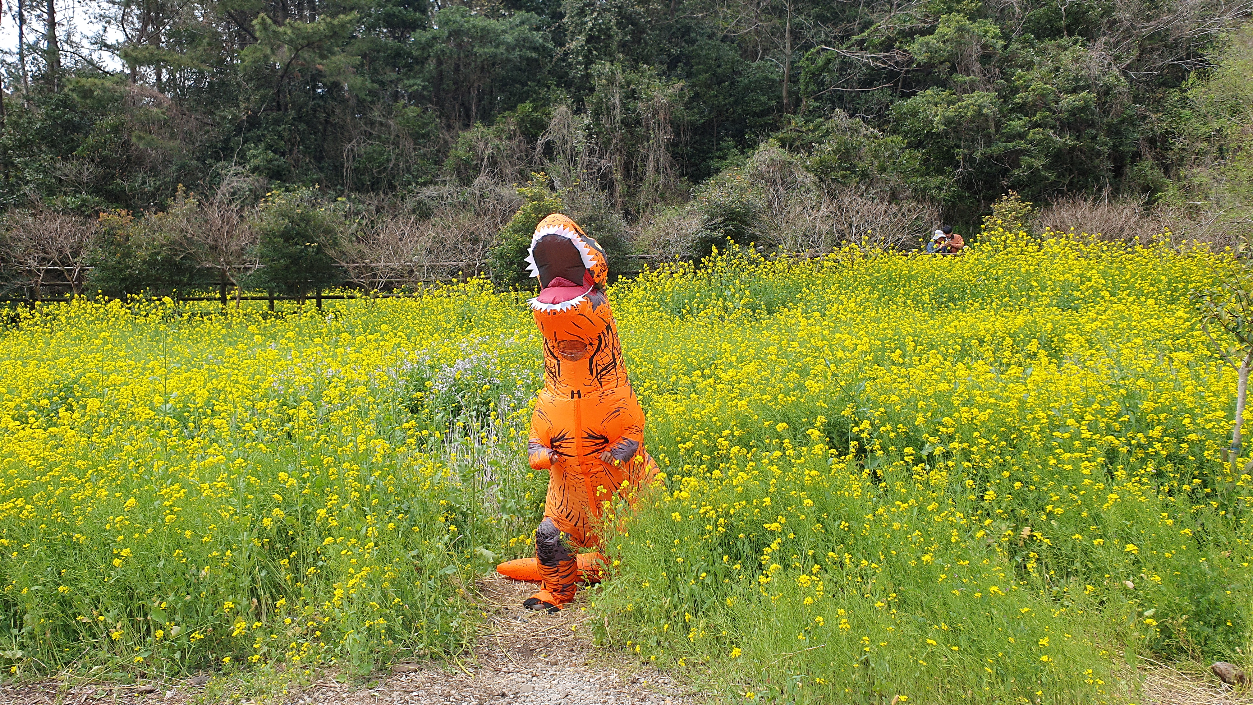 공룡옷을 입고 유채꽃밭을 거닐었다