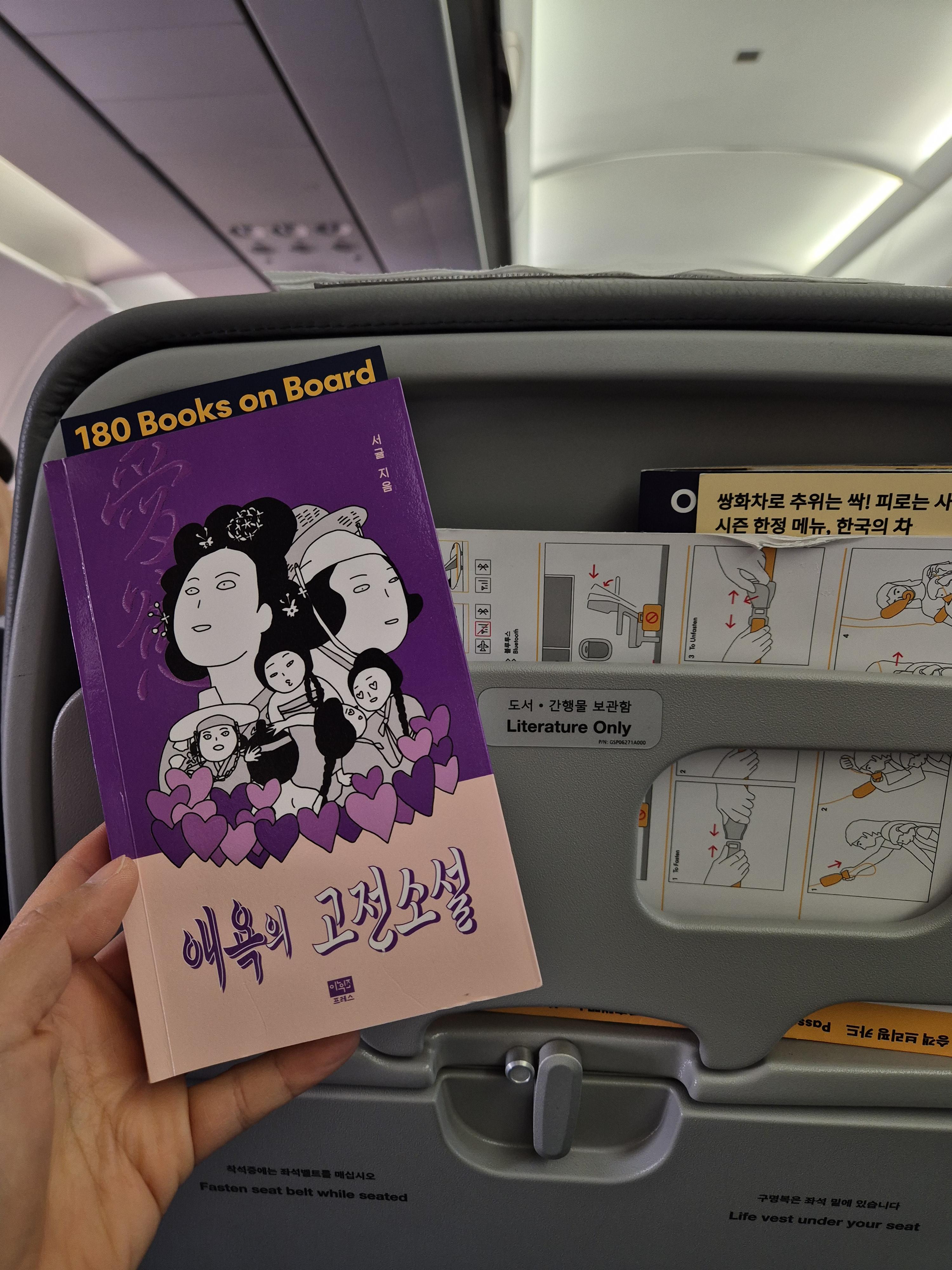 기내 바스켓에는 안내책자 외에 에어로케이에서 선정한 도서가 비치되어 있는데요, 제가 탑승한 3월의 도서는 서귤 작가님의 애욕의 고전소설이었어요. 만화 형식으로 되어있어서 가볍게 읽기 좋더라고요.
