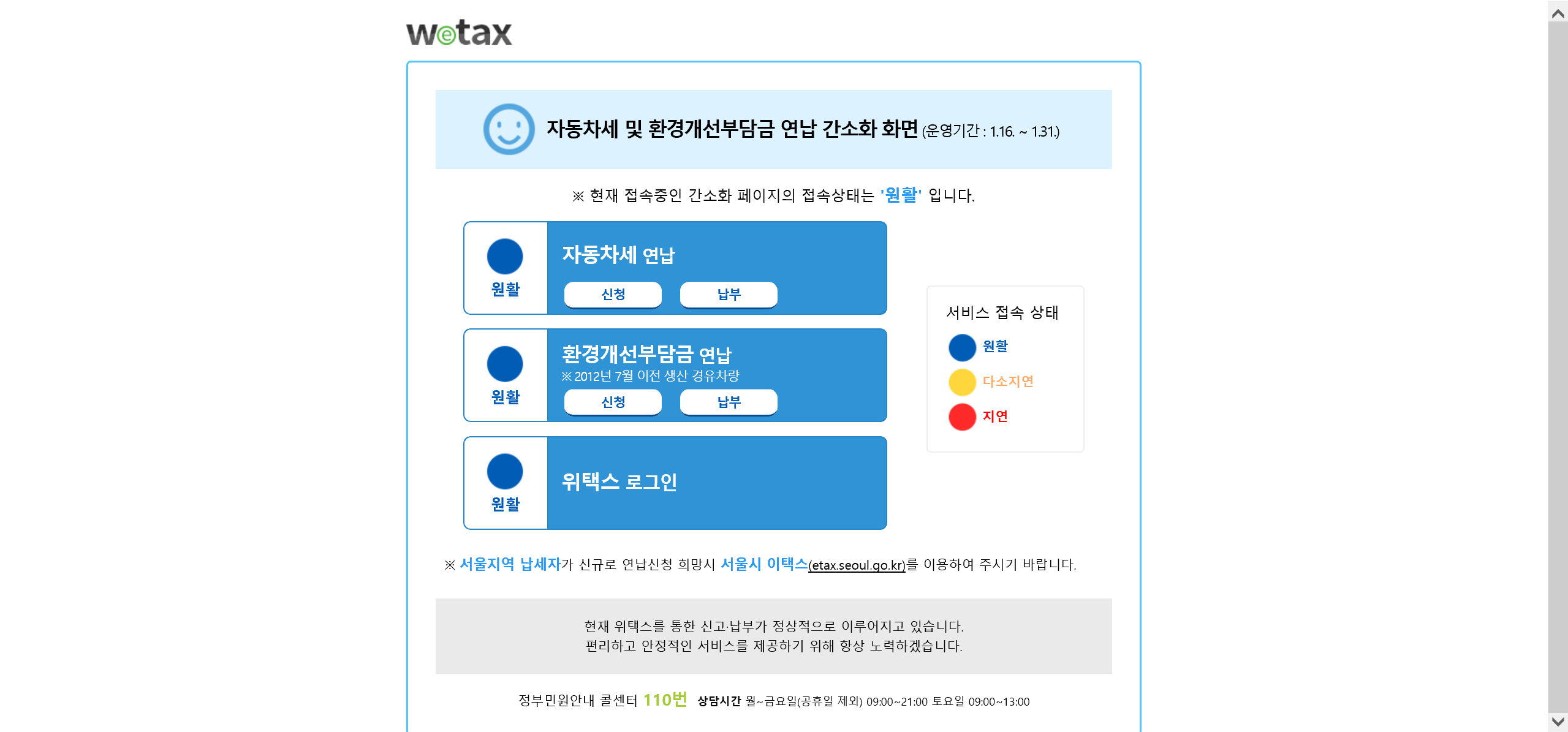 자동차세 및 환경개선부담금 연납 간소화 화면 (운영기간 : 1.16. ~ 1.31.) 이 화면은 지방소득세, 재산세, 주민세 신고·납부 의 원활한 서비스를 위한 화면입니다. --> ※ 현재 접속중인 간소화 페이지의 접속상태는 '원활' 입니다. ※ 현재 접속중인 간소화 페이지의 접속상태는 '다소지연' 입니다. --> ※ 현재 접속중인 간소화 페이지의 접속상태는 '지연' 입니다. --> 서비스 접속 상태 원활 다소지연 지연 ※ 서울지역 납세자가 신규로 연납신