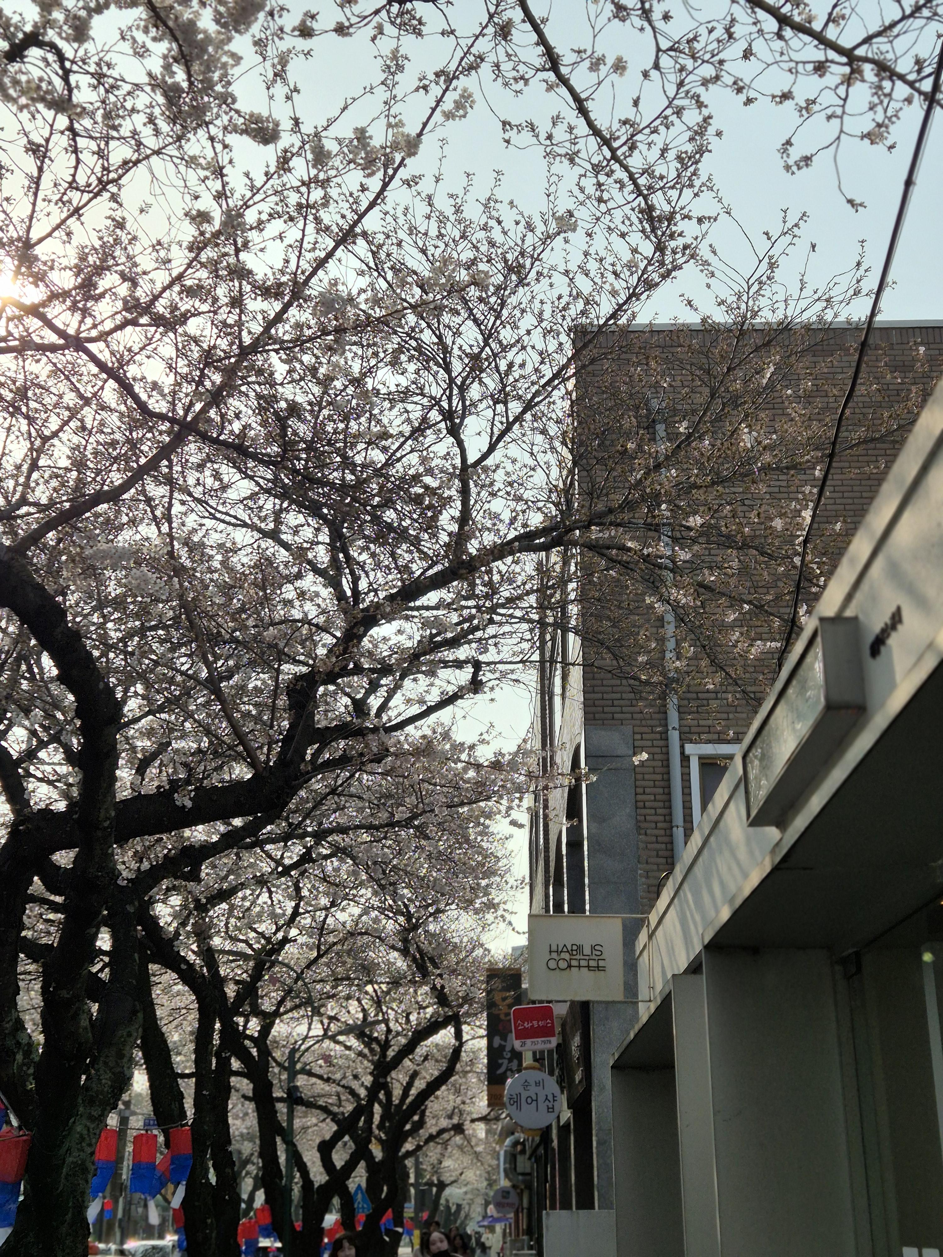 전농로 카페거리의 대표적인 카페인 하빌리스 커피도 있었어요. 벚꽃라떼가 유명한 곳인데, 커피도 진심인 곳이라 오랜만에 지나가는데도 사람이 가장 많은 곳이더라고요.