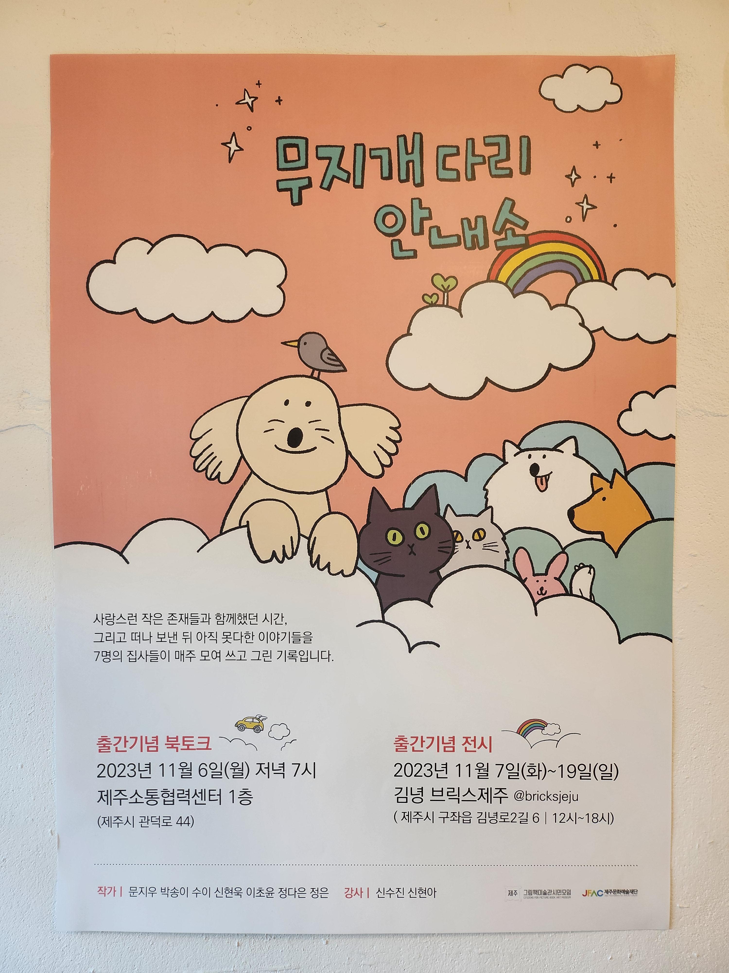 전시는 2023년 11월 7일(화) ~ 19일(일)까지이고, 15,000원 이상 후원하면 '무지개다리 안내소'책자를 증정하고 있다. 후원금은 전액 제주도내 동물보호단체에 기부된다.