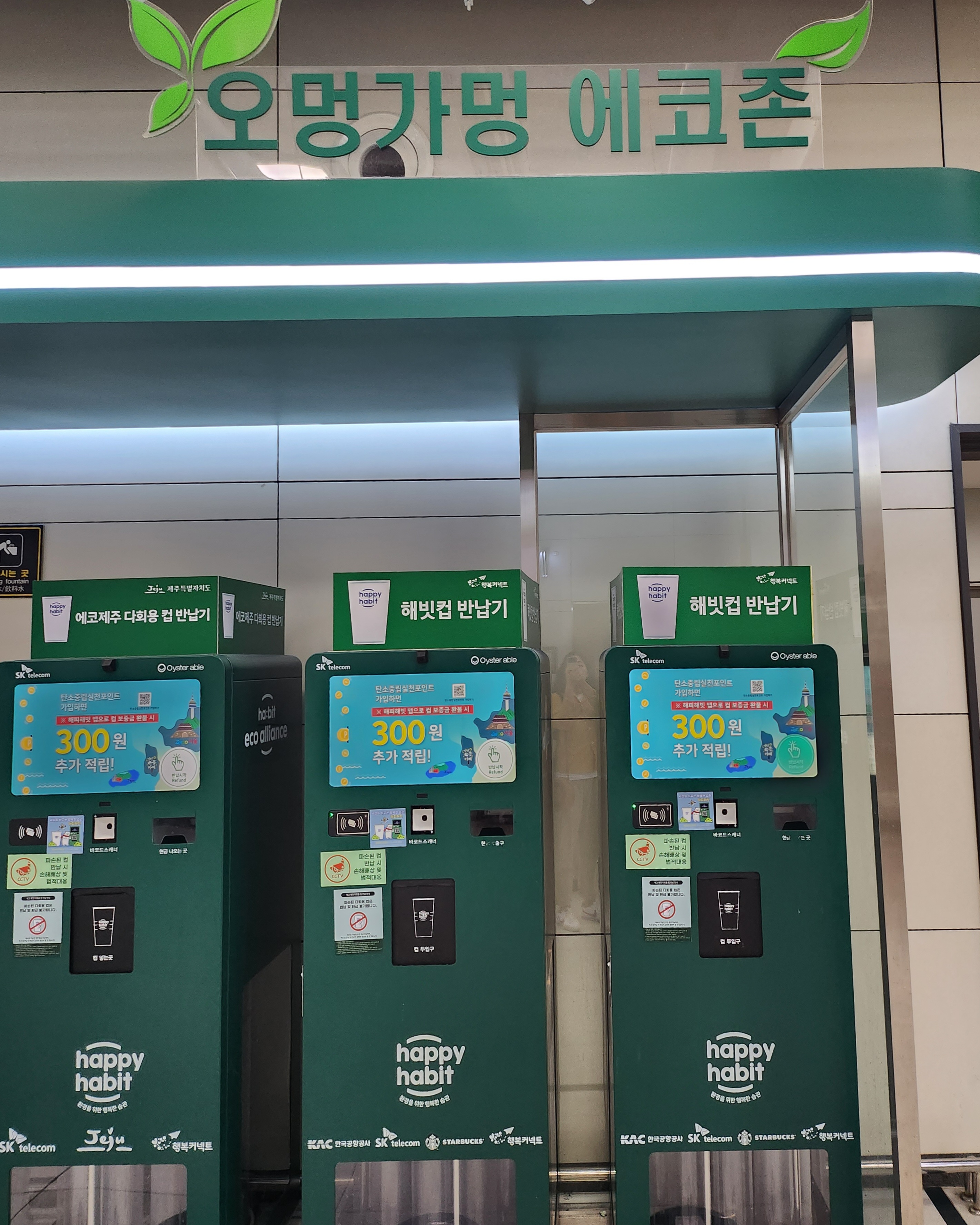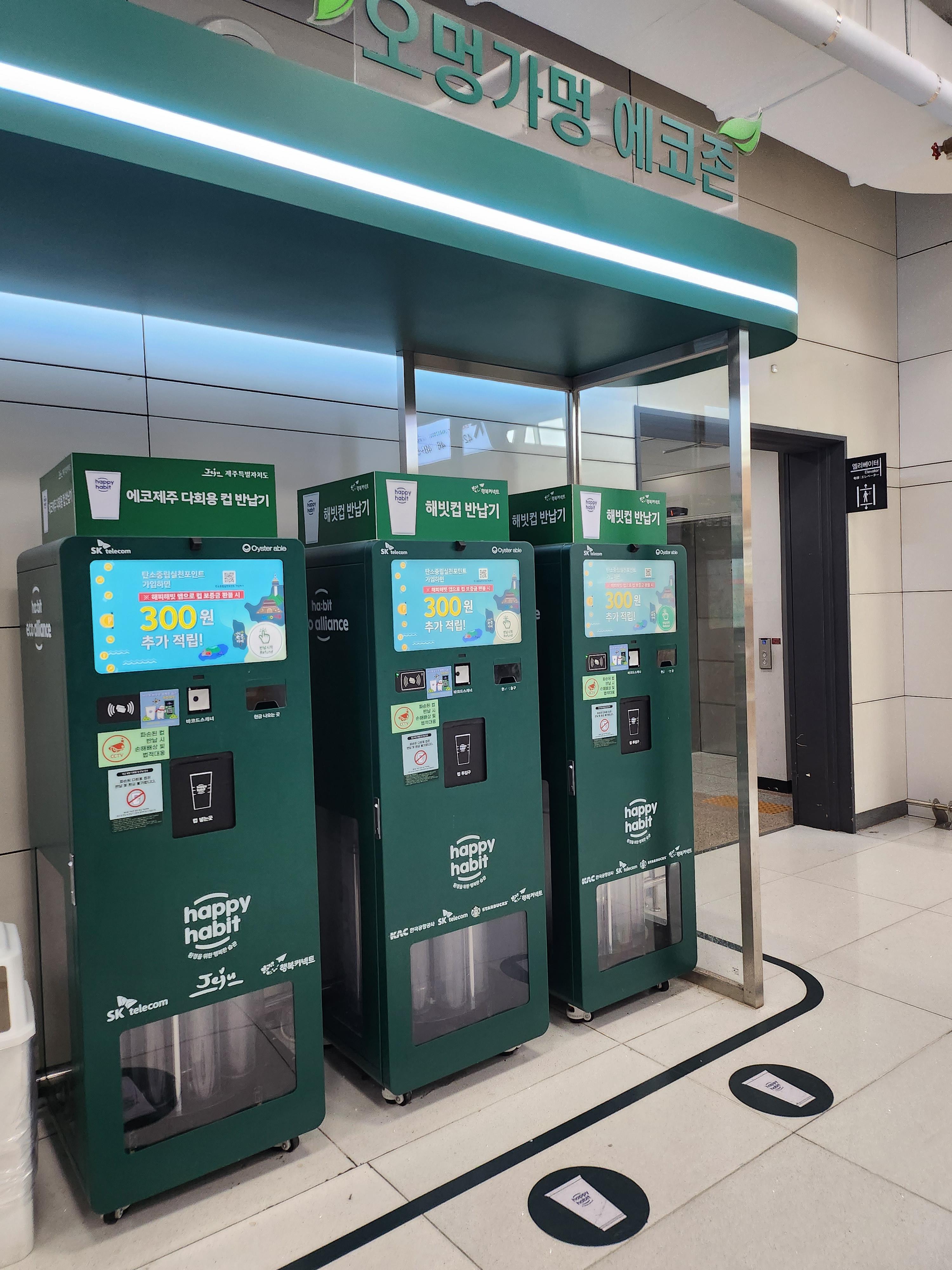제주도는 일회용 컵 줄이기 시범 사업 지역으로 프랜차이즈 등에서 음료 테이크 아웃시 컵 보증금을 지불하고 다회용 컵을 사용하게 됩니다. 여행을 하다 보면 깜빡하고 다회용 컵 반납을 놓치는 경우가 있는데요, 제주 국제 공항에 다회용 컵 반납기가 있으니 꼭 반납하고 보증금도 환급 받으시기 바랍니다.