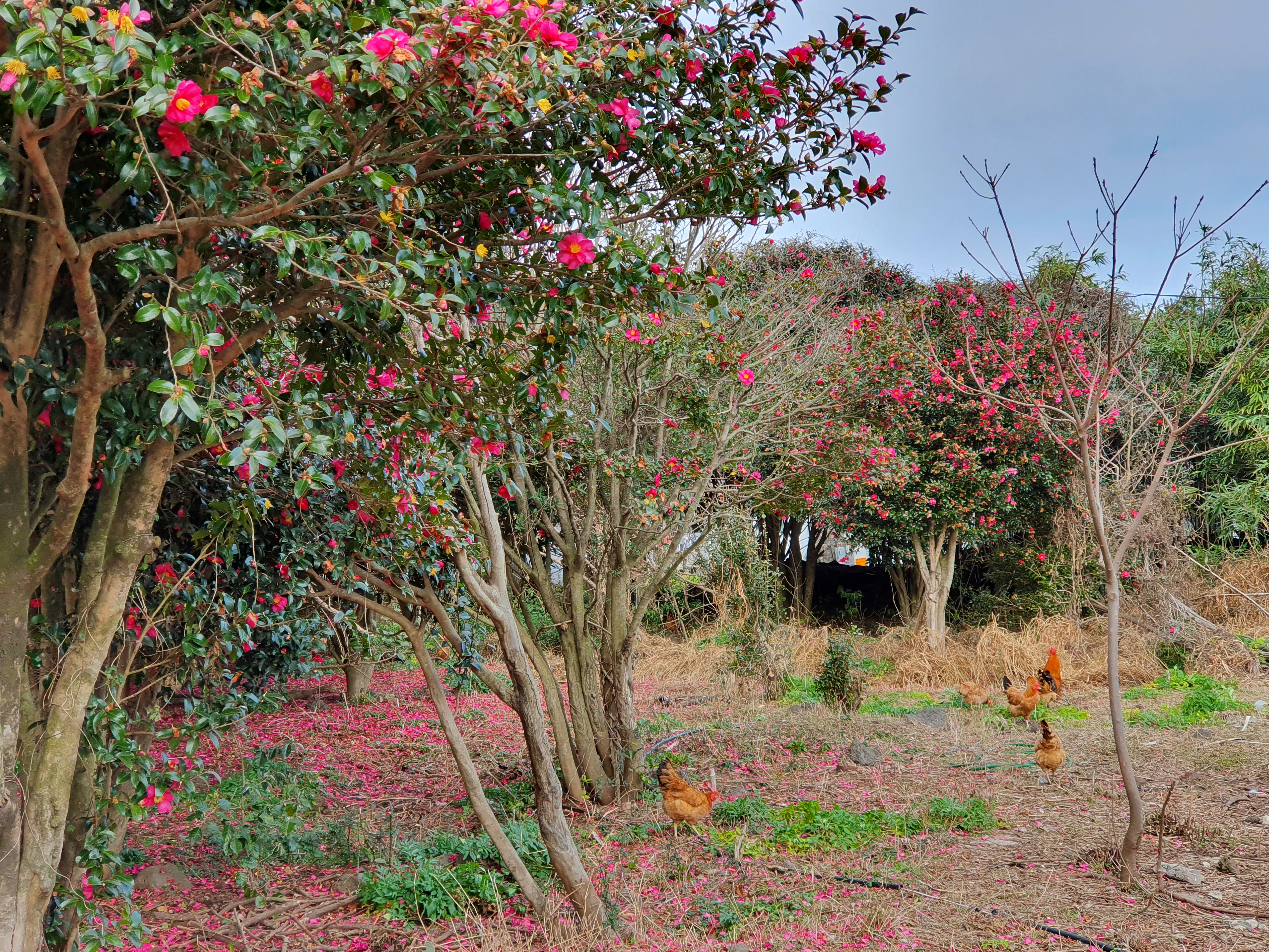이 친구들은 외출닭인지 동백꽃 아래를