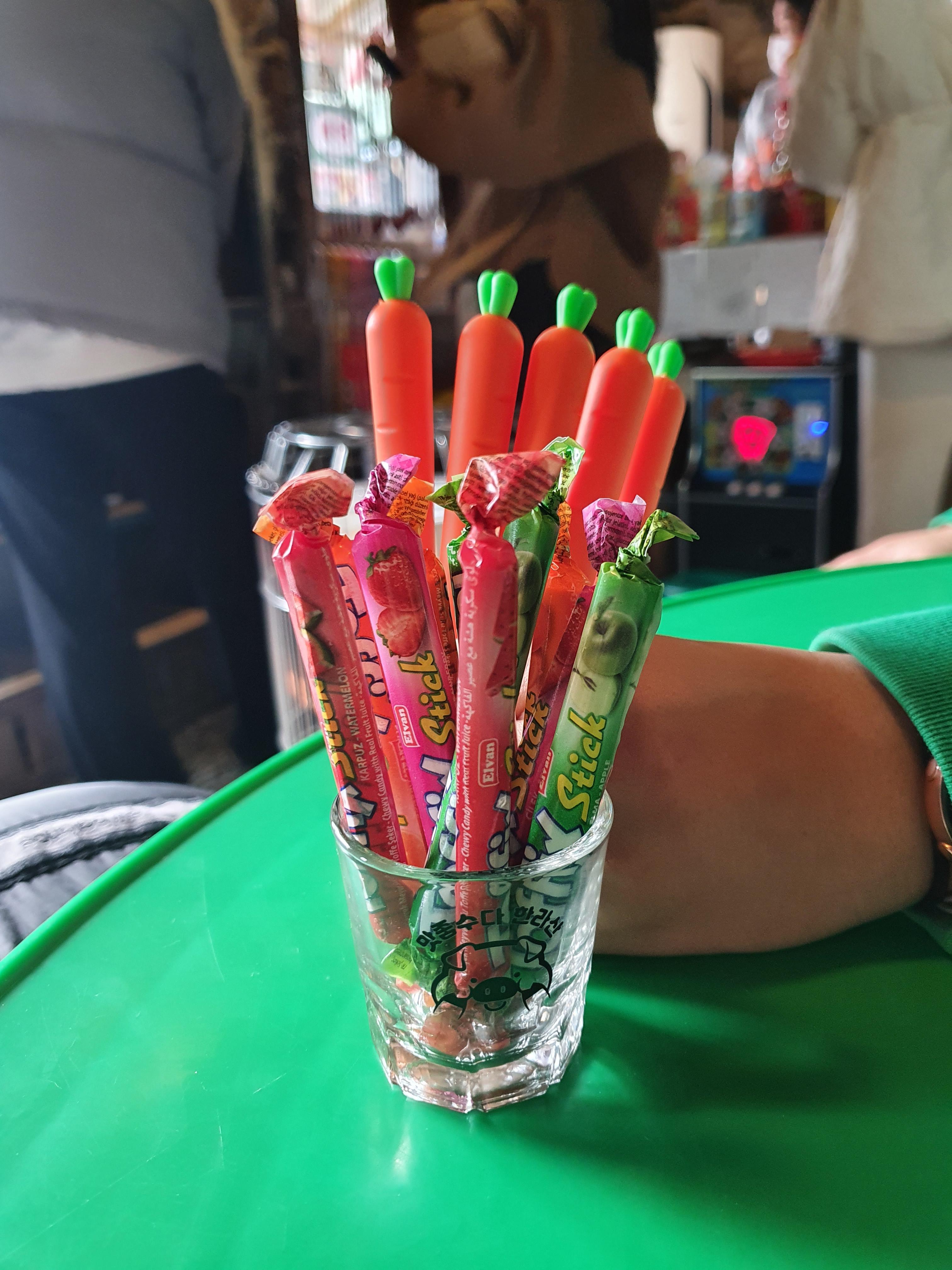 뽑기로 받은 당근 볼펜과 캔디