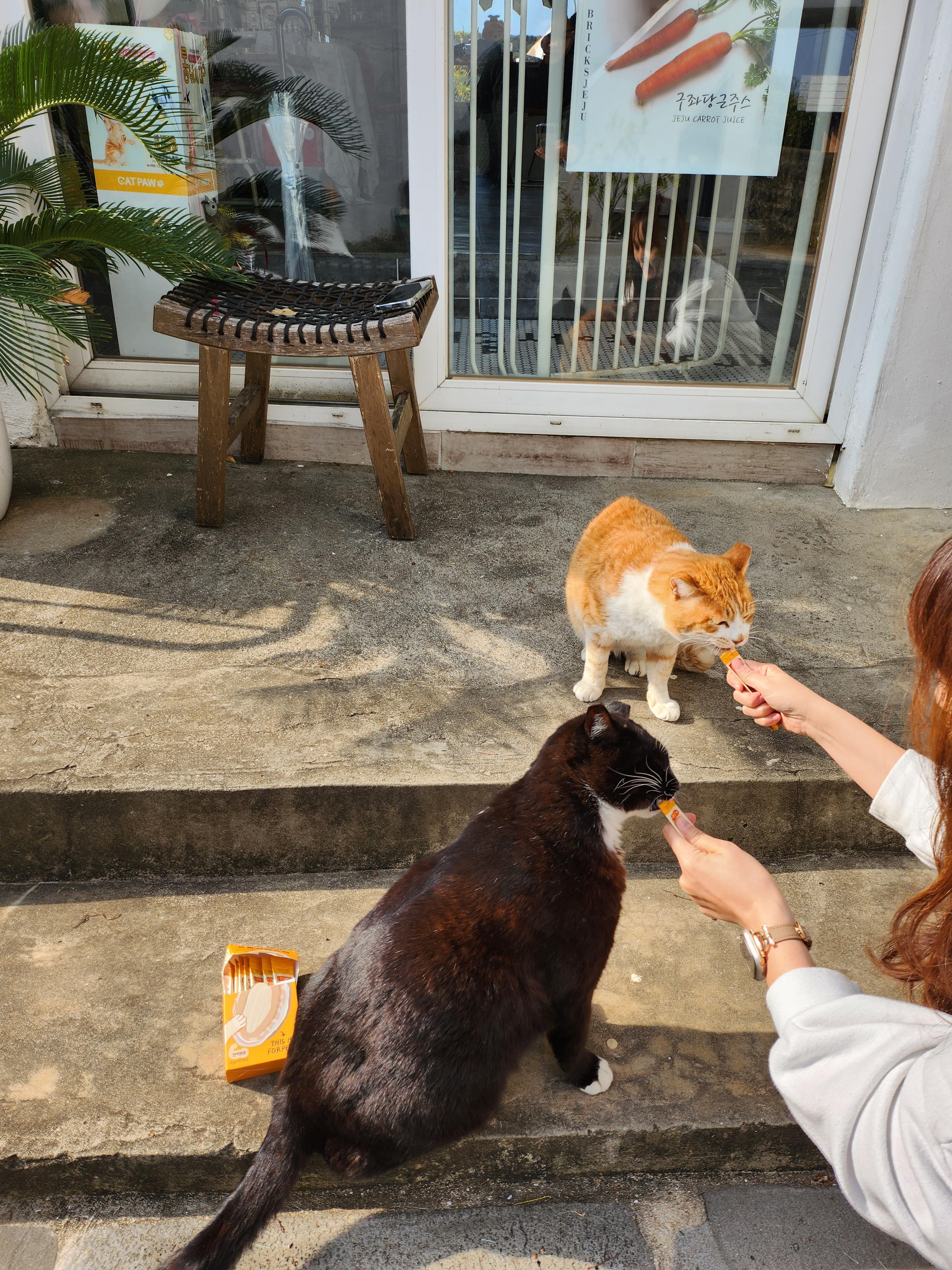 카페 손님이 고양이를 보러 오셨다며 간식을 나눠주셨다. 요즘 살찐다고 사료만 먹였는데 양손 스킬을 뽐내주신 손님 덕분에 싸우지 않고 공평하게 맛있는 간식을 먹을 수 있었다.