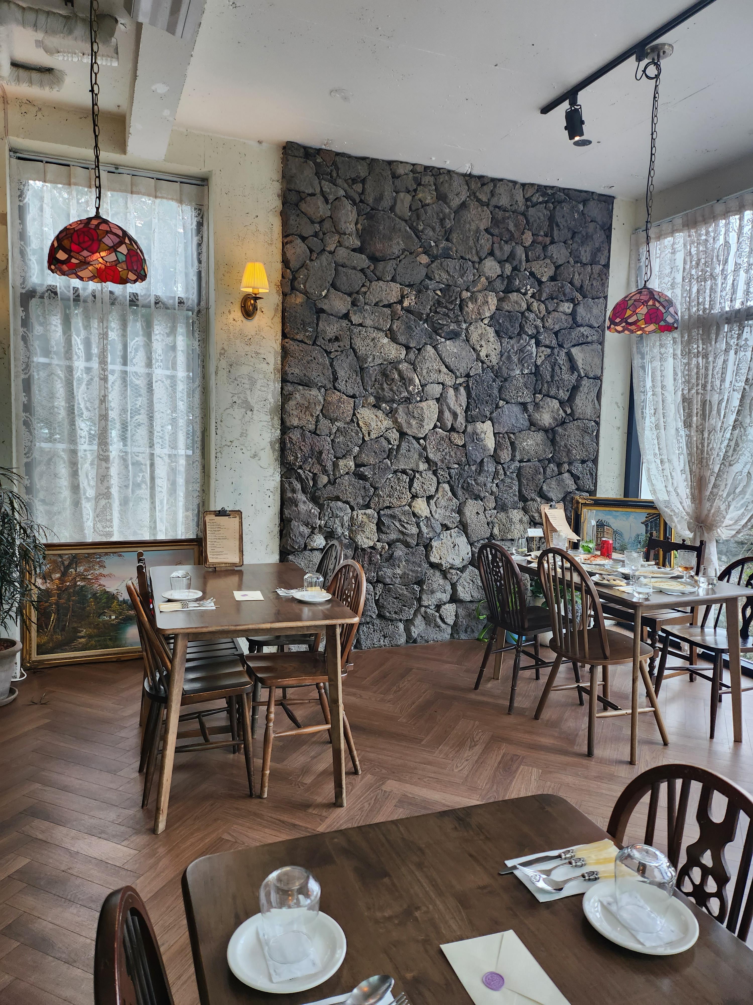 제주를 대표하는 돌담과 헤링본 나무바닥, 나무 의자와 테이블이 멋지게 어우러지는 곳. 따뜻한 느낌이라 참 좋다.