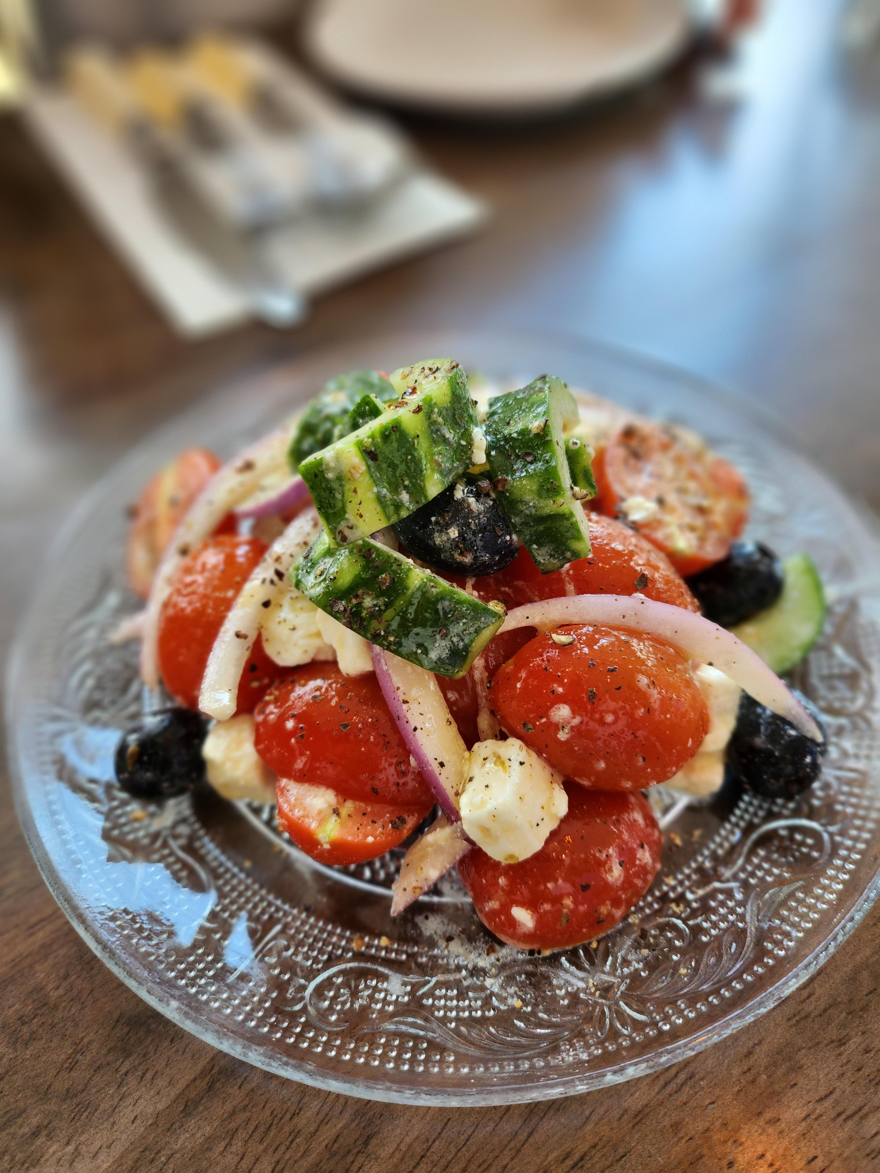 신선한 방울 토마토와 속을 파낸 오이, 채썬 양파와 올리브, 페타치즈를 올리브유에 버무린 그릭 샐러드. 지중해식 샐러드로 식전에 입맛을 돋우기에 딱 좋은 메뉴였다.