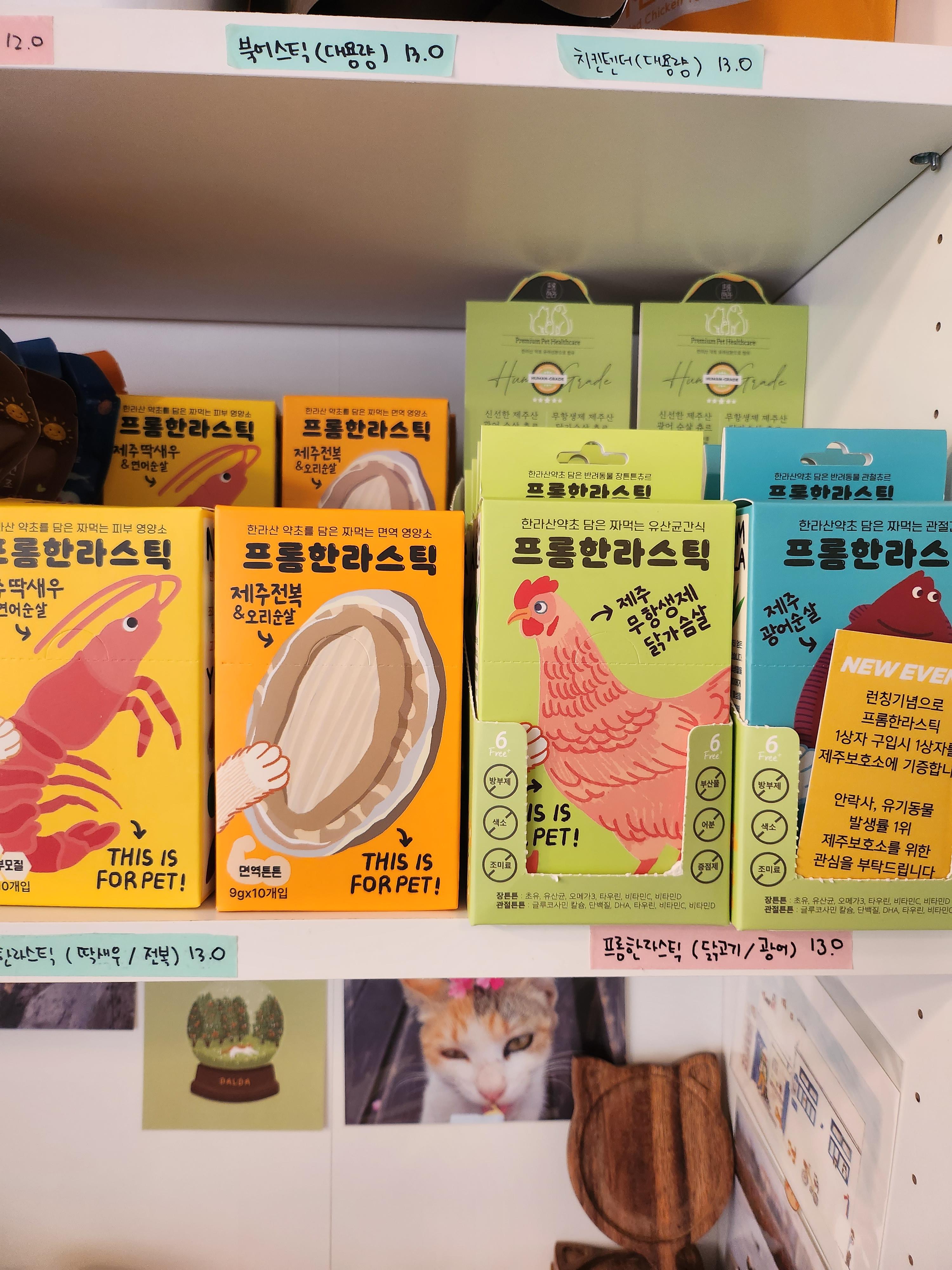 고양이와 강아지 간식인 마도로스펫의 간식도 판매중이다. 짜먹는 간식인 프롬한라스틱은 제주도에서 만든 간식인데 원료도 좋고 기호성도 좋기로 유명한 제품이다.