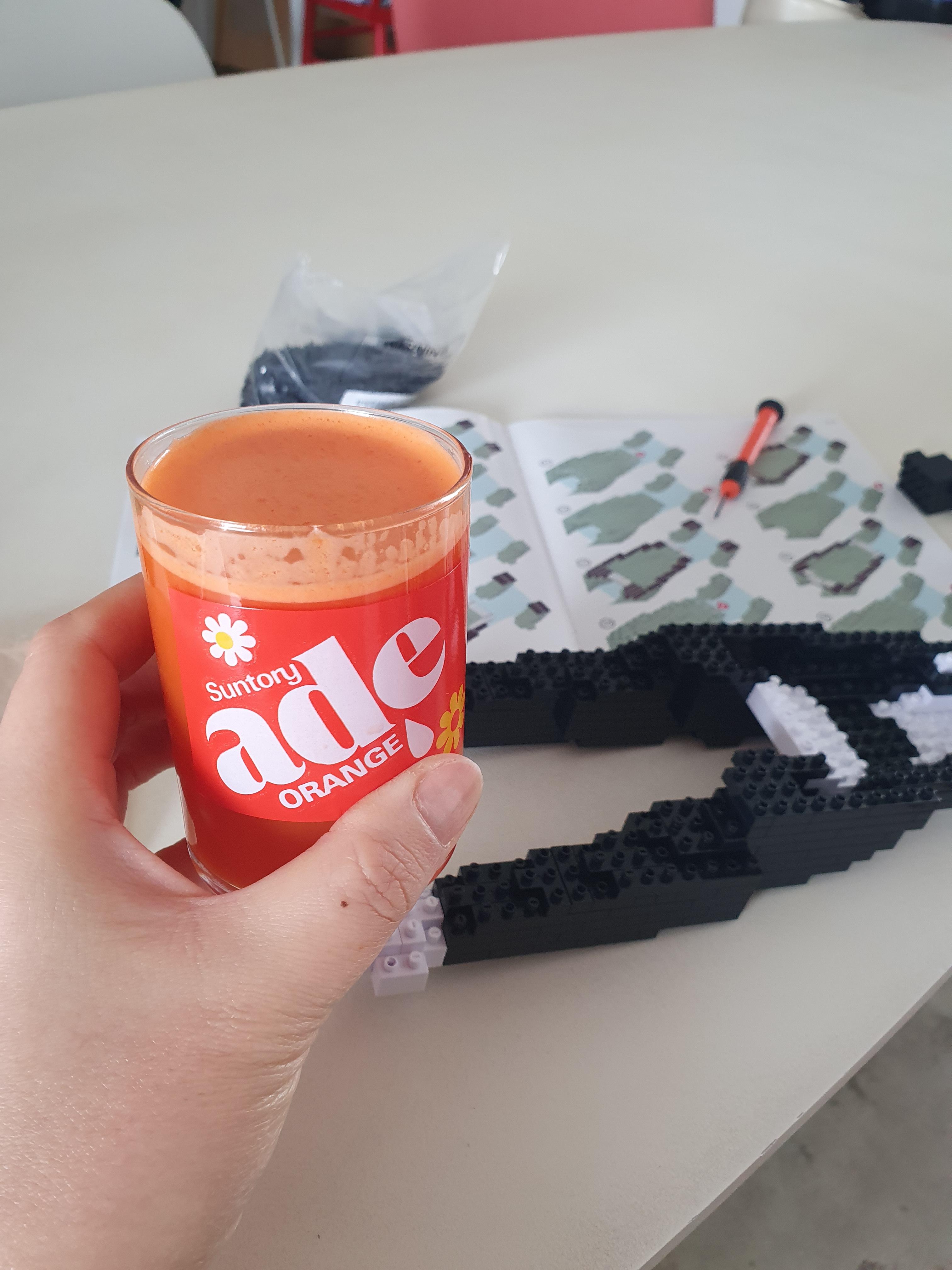 설명서와 블럭에 집중하다보면 눈이 침침해지니까 눈에 좋은 구좌 당근 주스를 한잔 마셔준다.