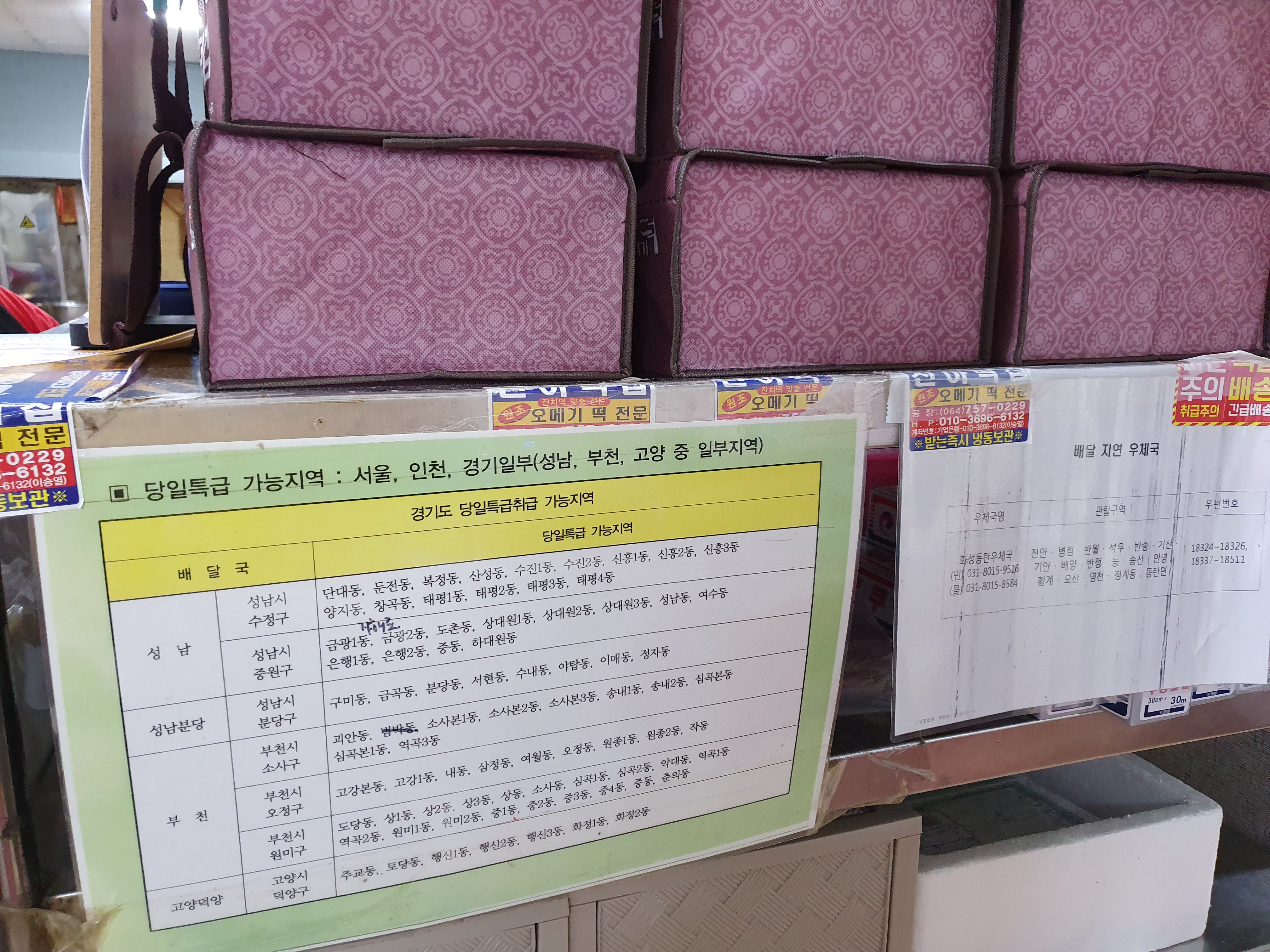 가게 앞에 방송 출연 영상들이 전시되어있다