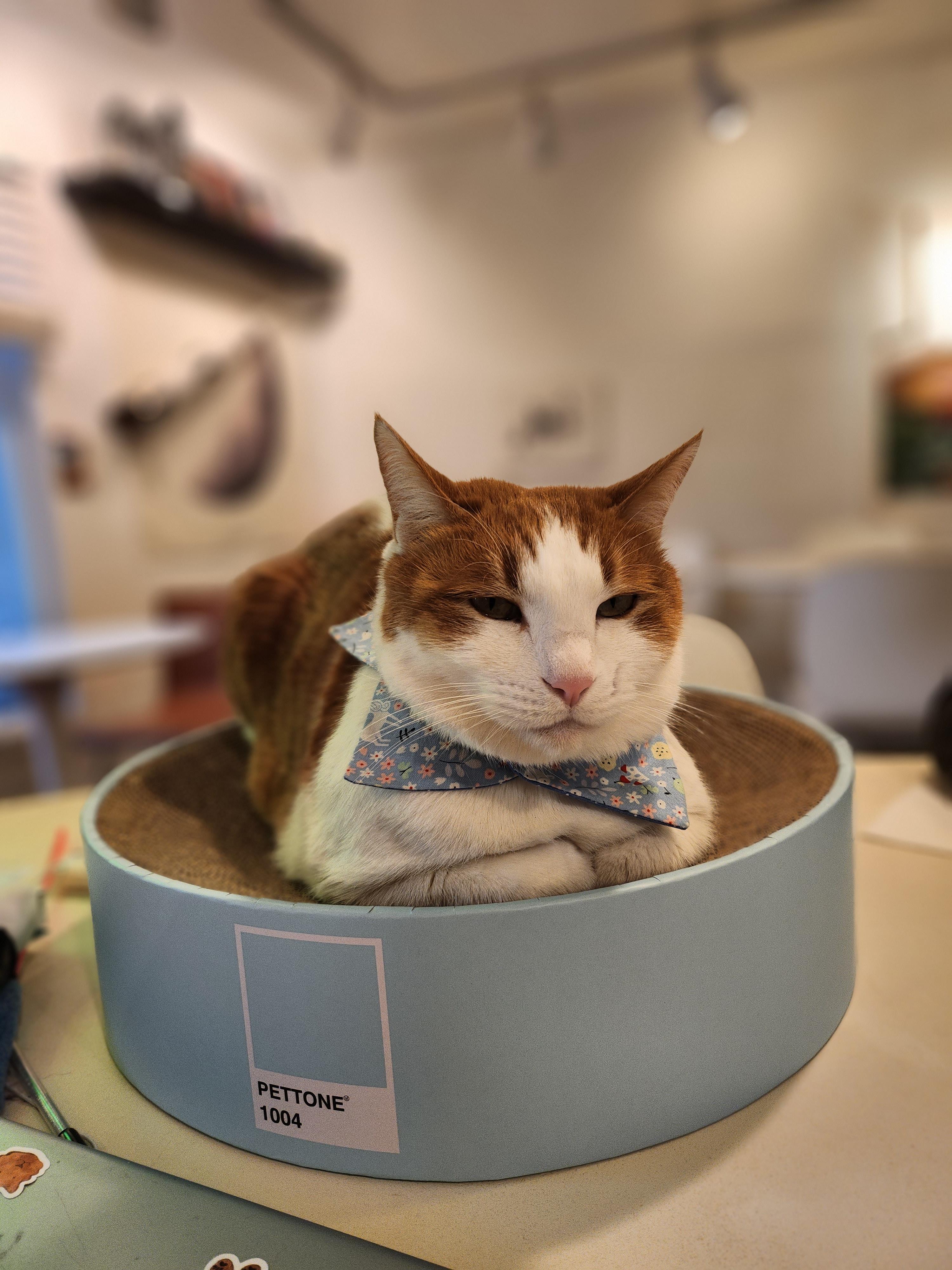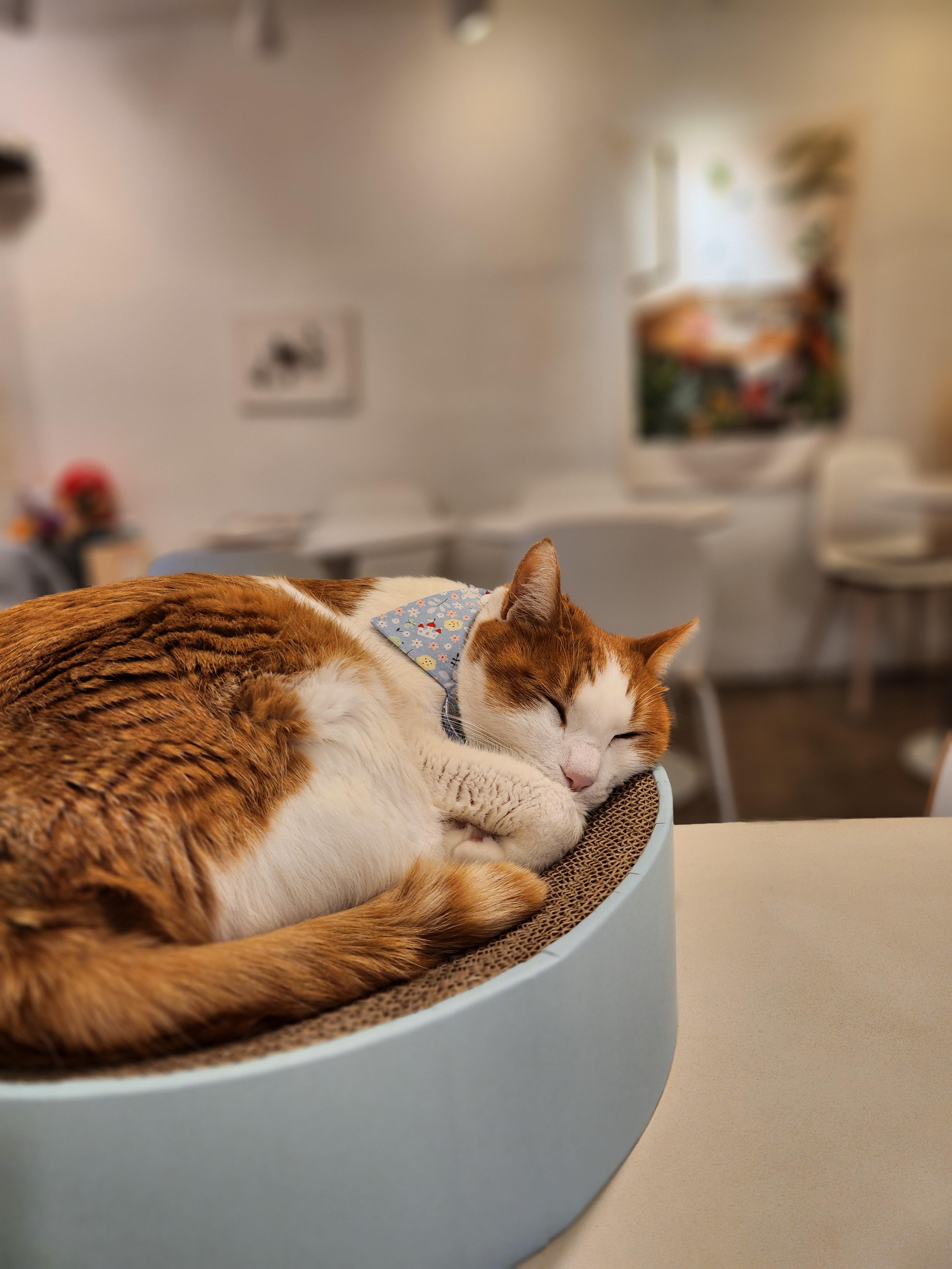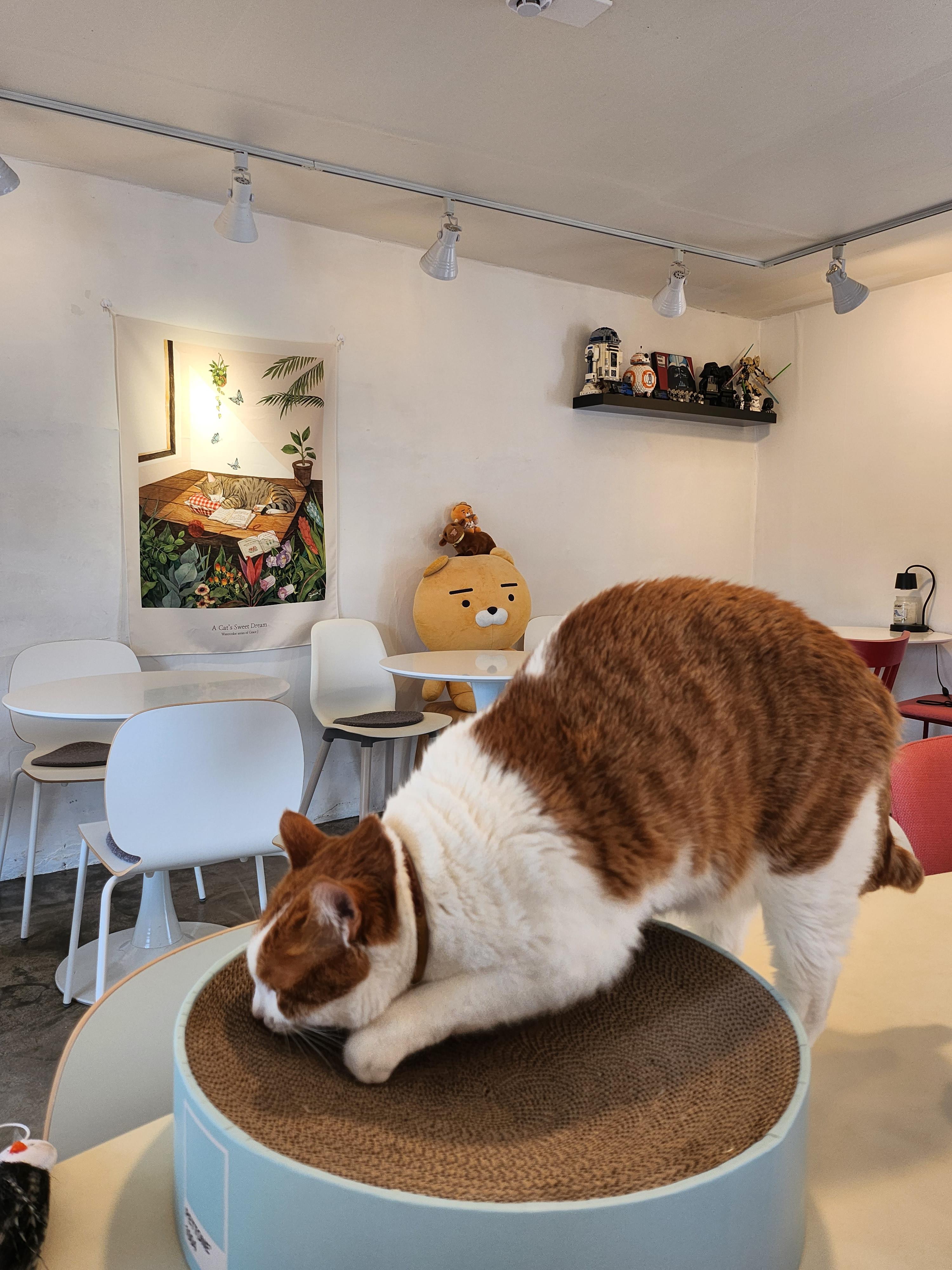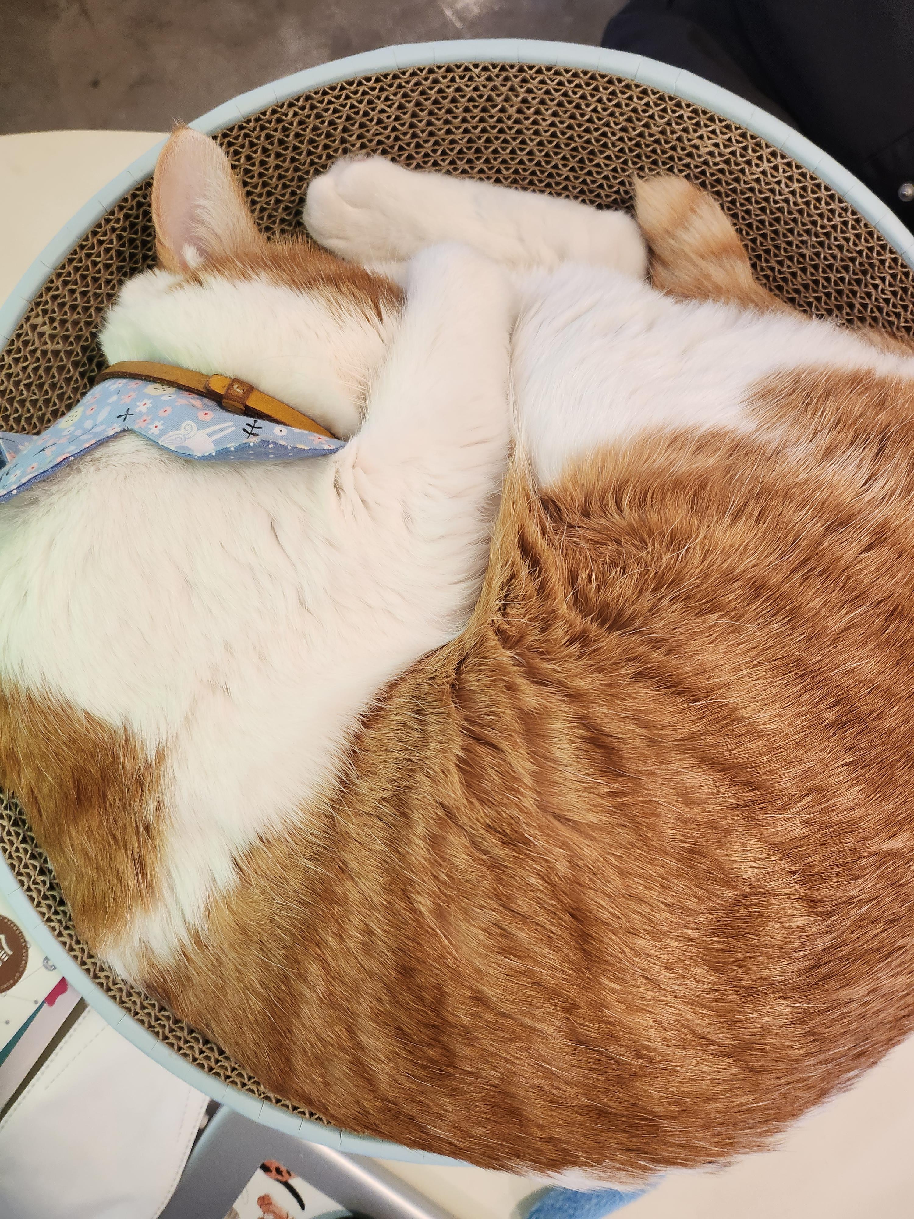 출근하자마자 이 스크래쳐에 발톱을 갈고 바로 단잠에 빠진다. 쉴때도 잘때도 간식을 먹을때도 이 스크래쳐 위에서 다 해결한다.