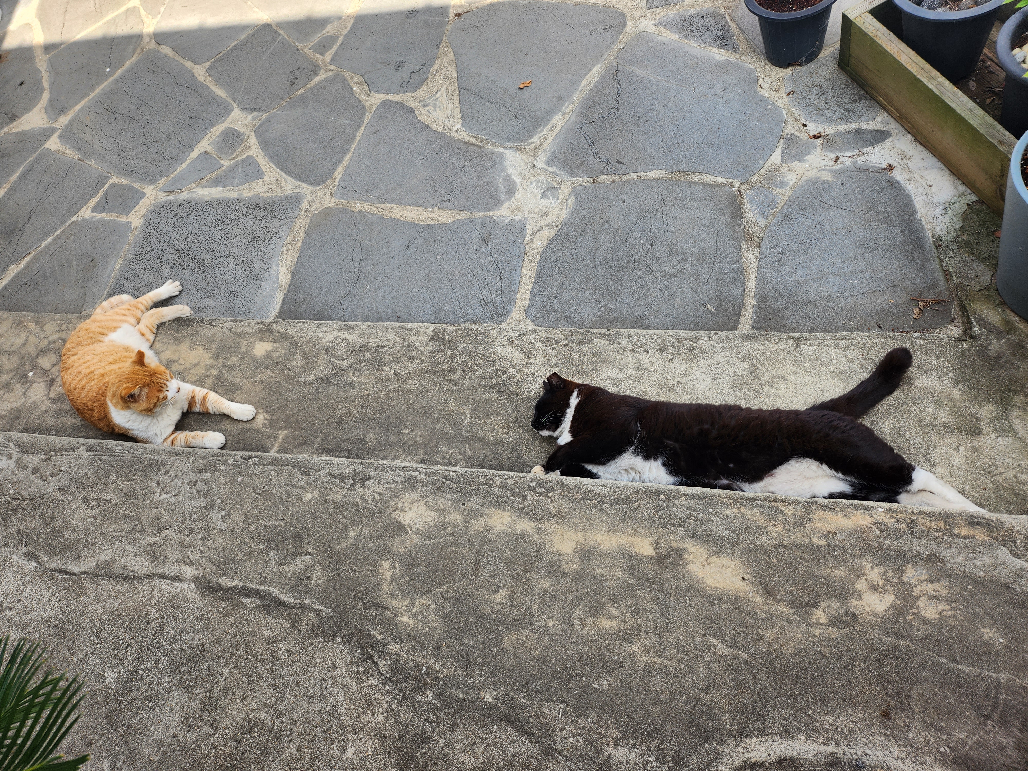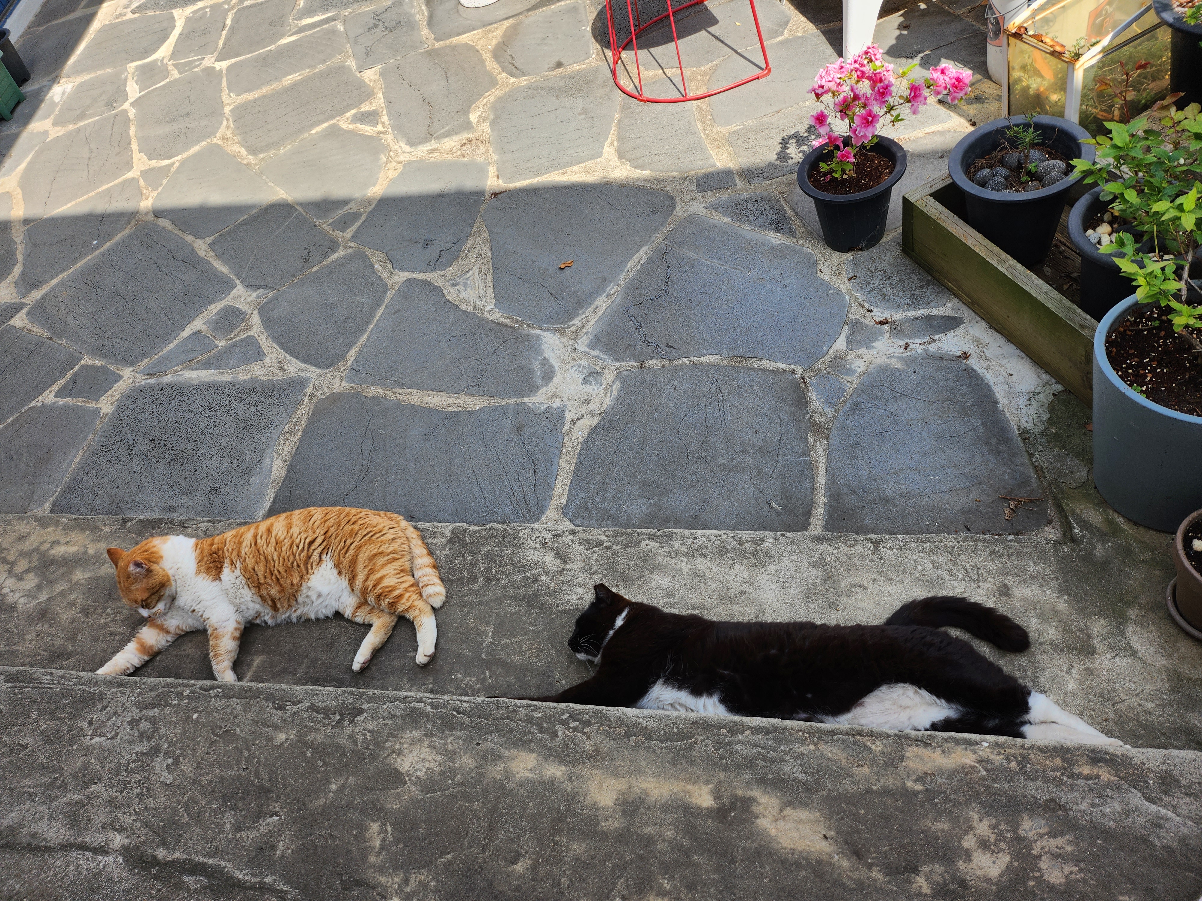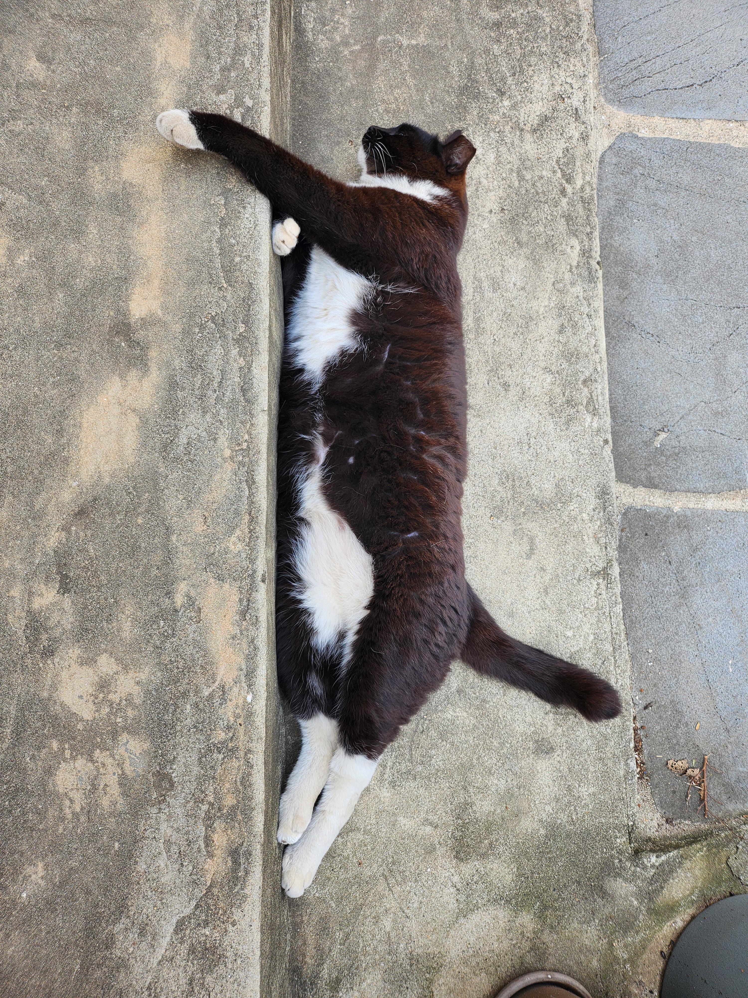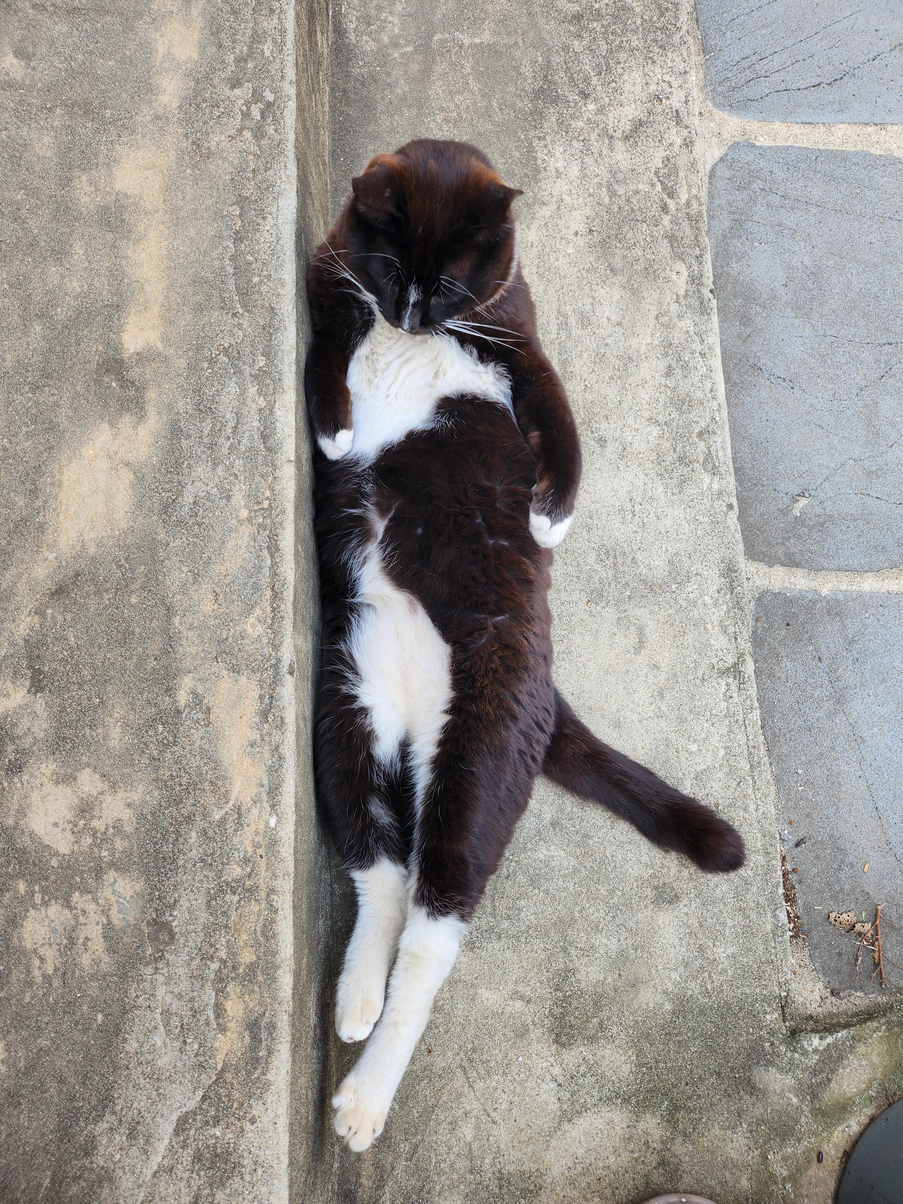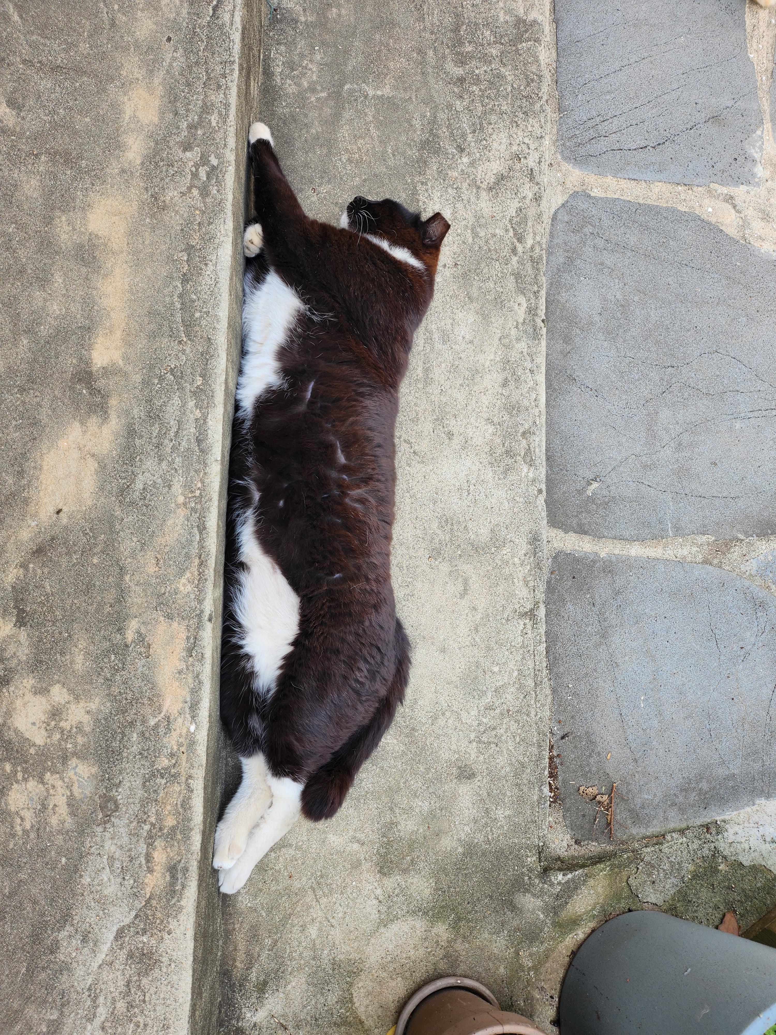 원래는 필통씨만 누웠었는데, 그걸 본 다른 고양이들이 하나둘 따라 눕기 시작했고, 어떤 날은 모든 고양이가 카페 마당에서 등을 지지며 누워있을때도 있다.