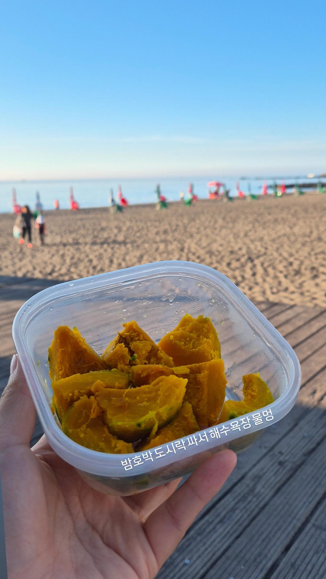 또 테니스 레슨이 있던 날, 레슨 전까지 시간이 좀 남아사 밤호박 도시락을 싸서 삼양해수욕장으로 갔다.