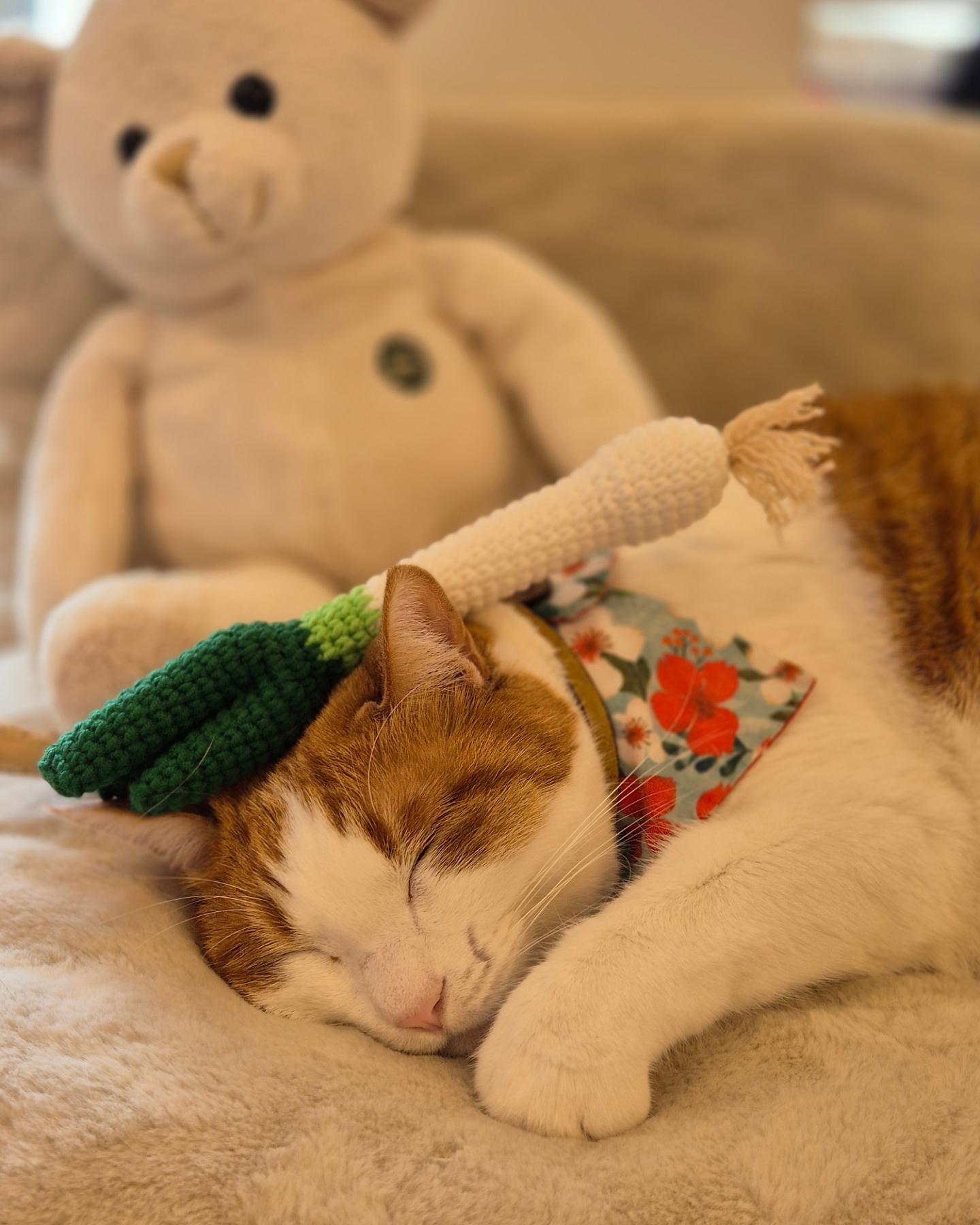 그래서 동네 고양이들이 돌아가며 대파 인형과 사진을 찍는 중인데, 우리 채영이도 빠질 수 없기에 요즘 유행하는 파'묘'사진을 찍었다.