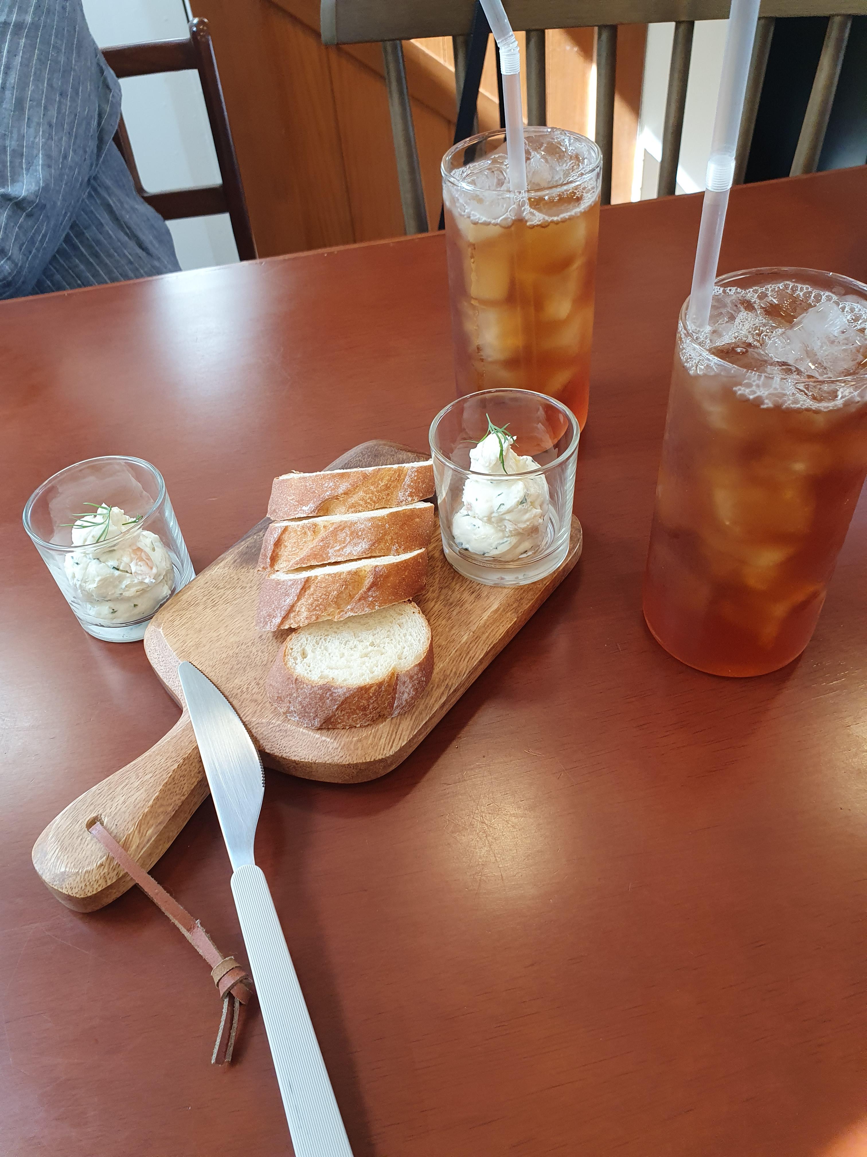 식전빵과 차이브 갈릭 크림치즈가 먼저 나왔다