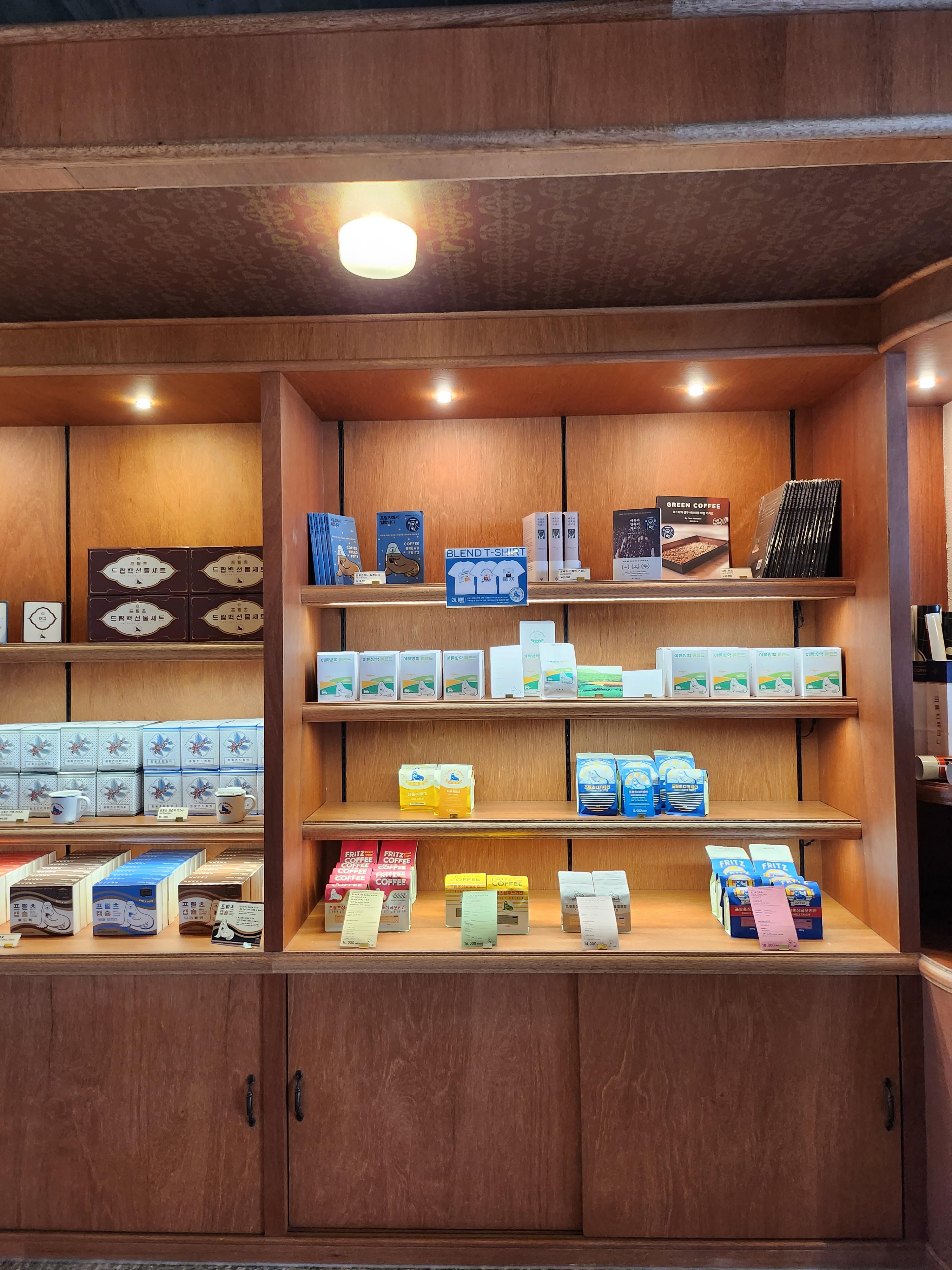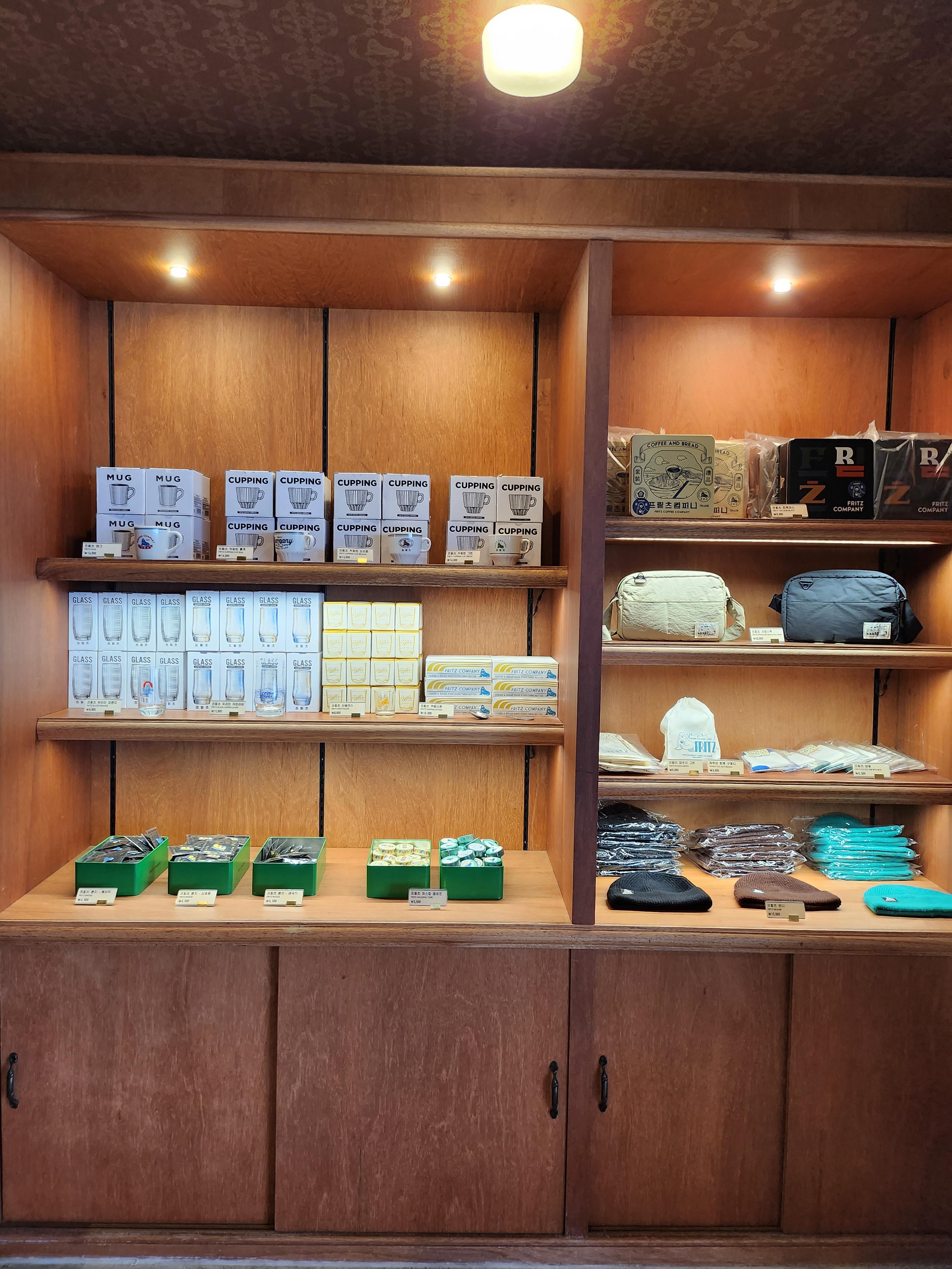 프릳츠의 커피잔을 든 물개 캐릭터가 그려진 각종 기념품들을 판매하고 있었는데요, 올드한 듯한 정겨운 프릳츠 머그컵과 유리잔이 유독 눈에 들어오더라고요. 뱃지와 티셔츠, 모자도 있고 드립백, 원두, 통에 든 쿠키등도 판매하고 있었습니다.
