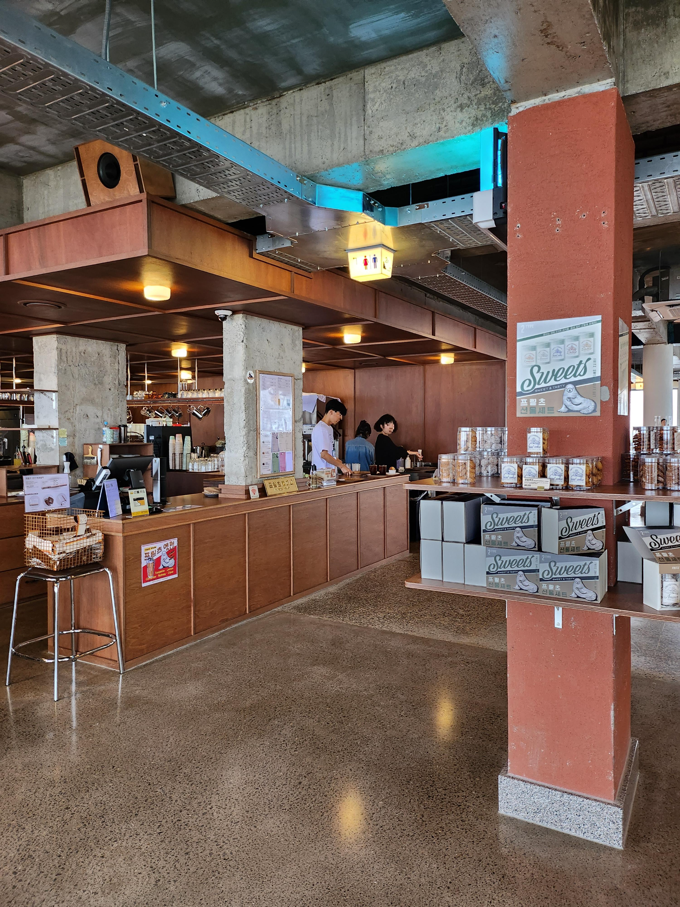 옛날 건물의 구조는 그대로 살려둔 상태에서 나무와 노출 콘크리트로 인테리어를 했습니다. 프릳츠 특유의 올드한 것 같으면서도 힙한 느낌이 그대로 느껴지는 분위기였어요. 과한 것 없이 차분하면서 편안한 분위기, 프릳츠가 그 어려운 걸 또 해냈구나 싶었습니다.