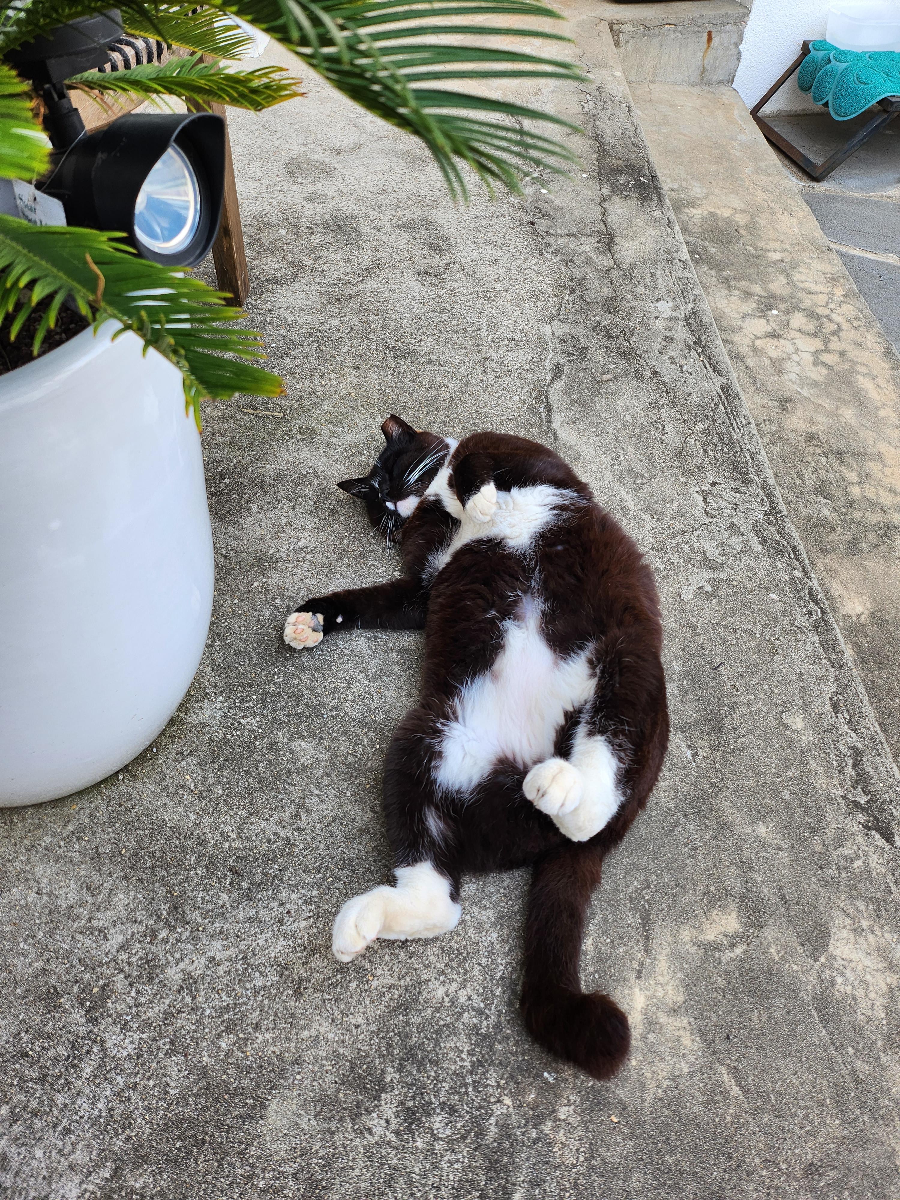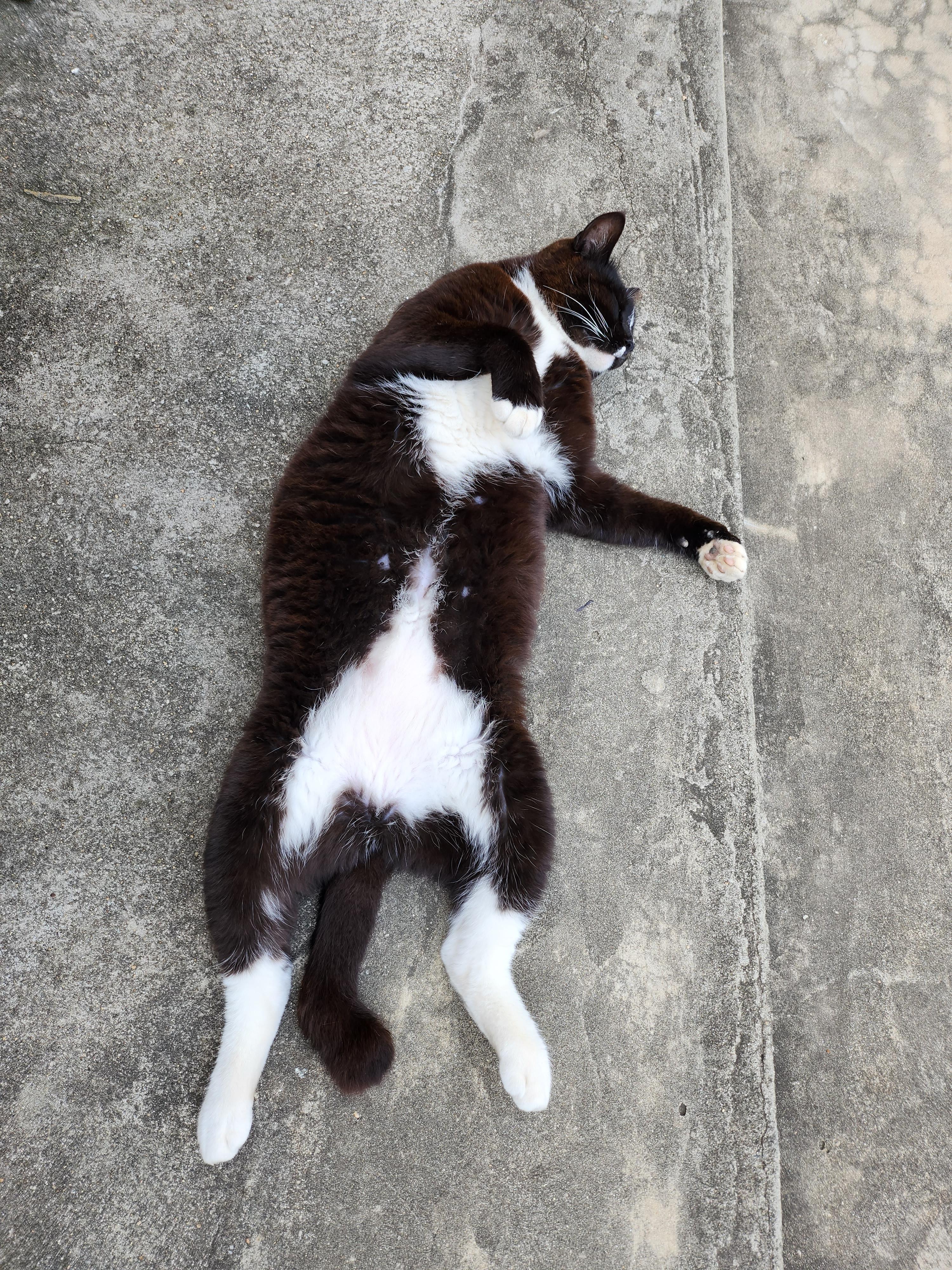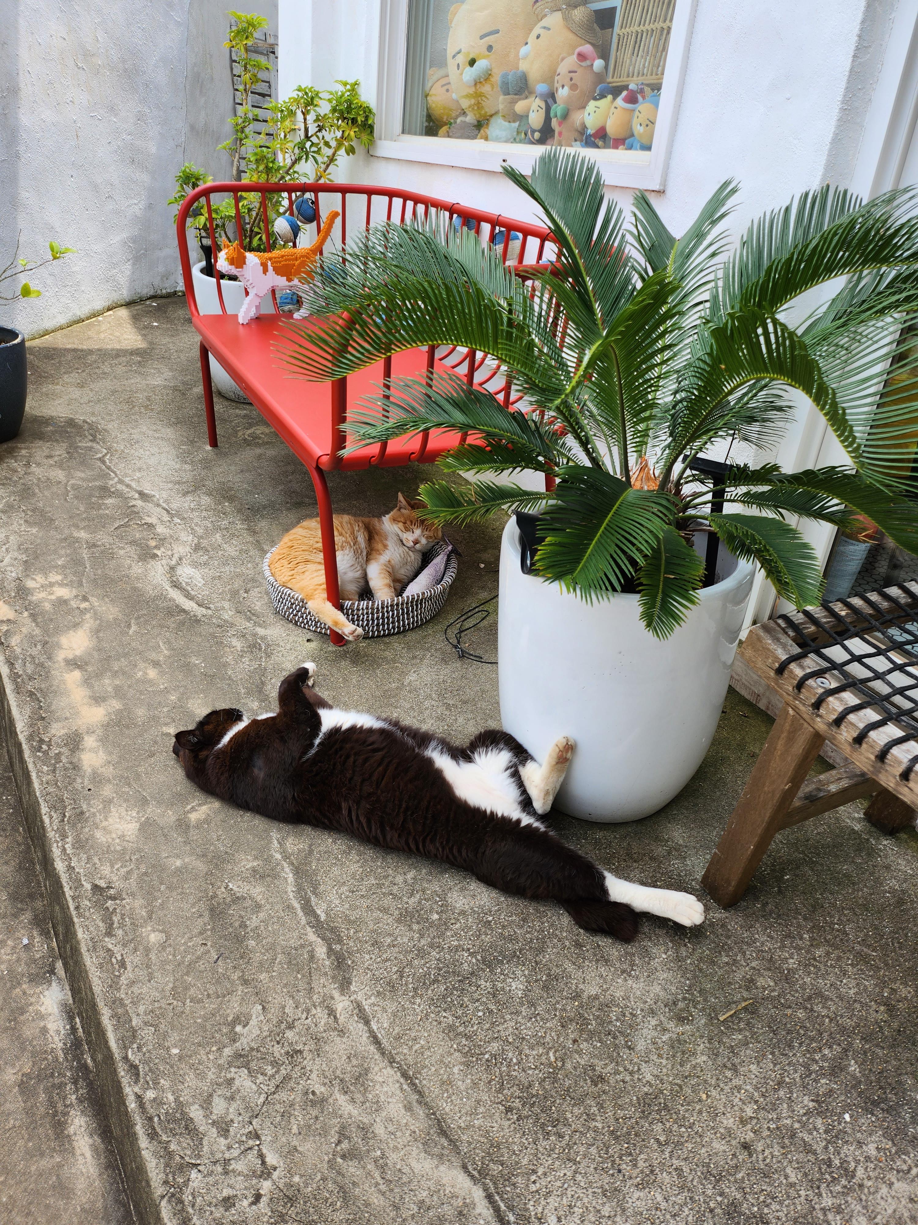 브릭스제주 카페 마당에서 유일하게 검은색 수트를 입고 있는 필통씨는 다른 고양이들보다 조금 더 더울 것 같다. 검은색이 햇볕을 더 많이 흡수하기 때문인데, 그래서인지 필통씨는 검은 부분이 많은 등은 바닥에 대고, 배를 위로 보이며 누워있을때가 많다.