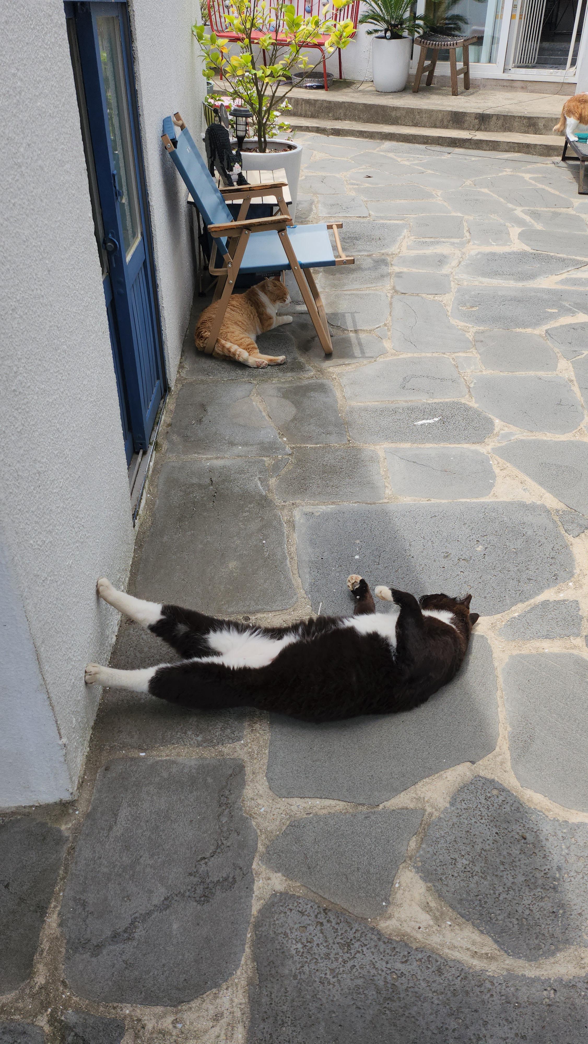 고양이가 정말 편안해야 하는 자세로 길고양이들에게는 흔하게 볼 수 없는 모습이다.