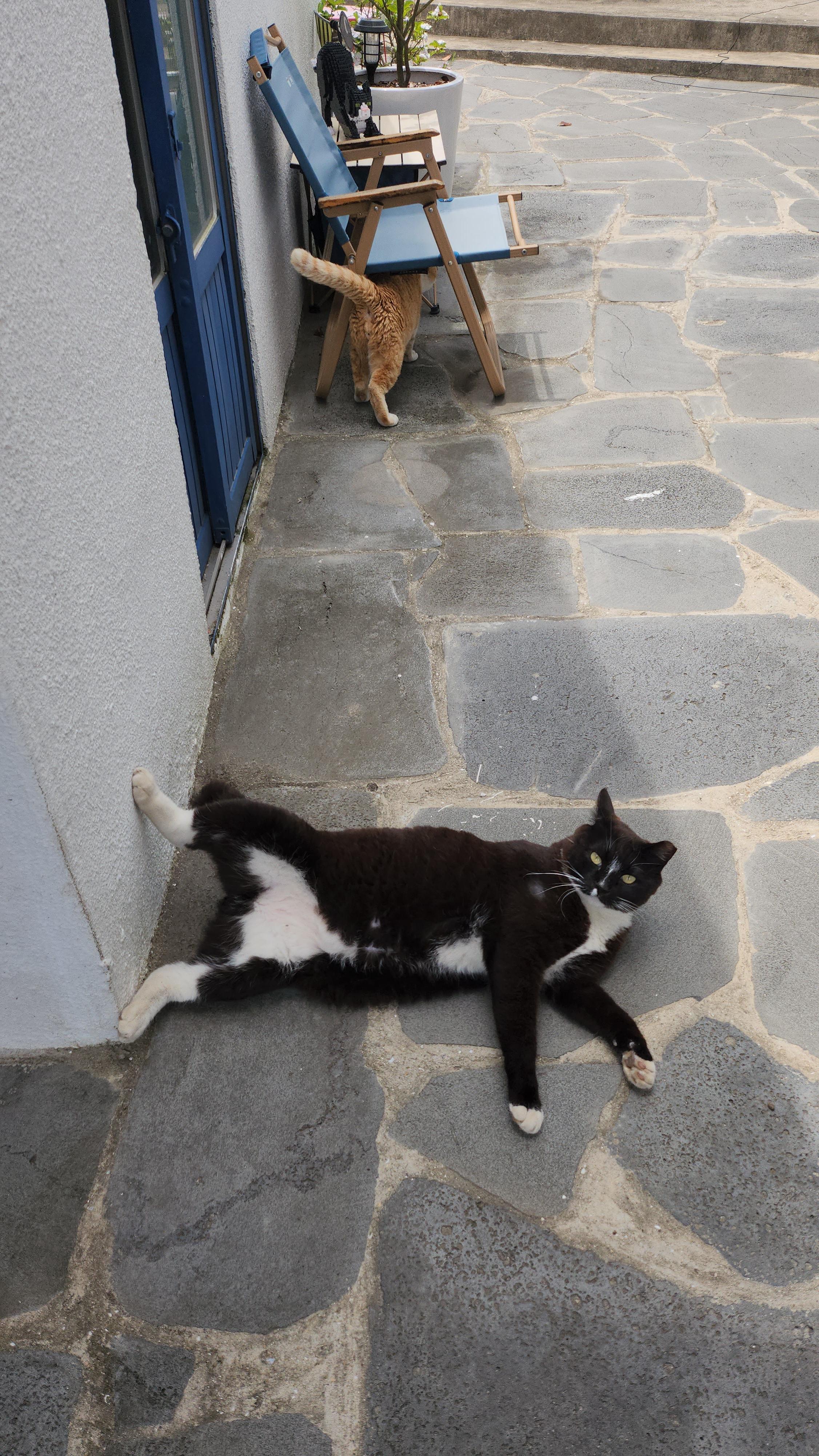 브릭스제주 카페 마당에 사는 고양이 삼총사 필통씨, 탄광이, 너구리 = 필탄너 턱시도를 입은 까만 고양이 필통씨를 제외하고 나머지 두마리는 겁이 너무 많아서 언제든 도망갈 준비를 하느라